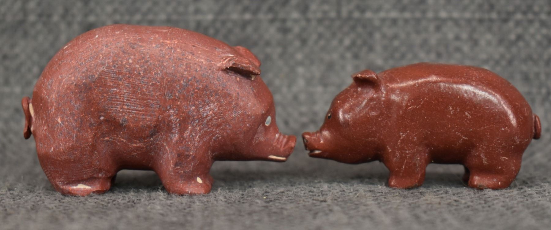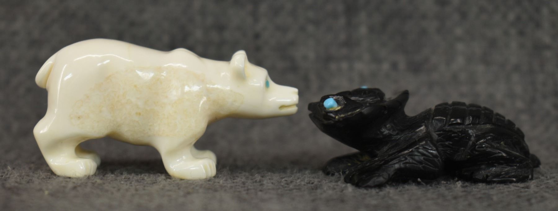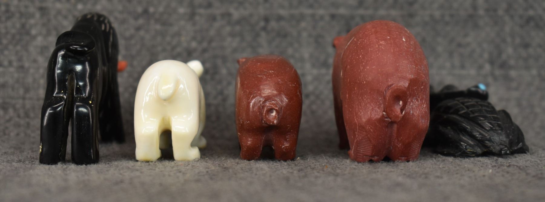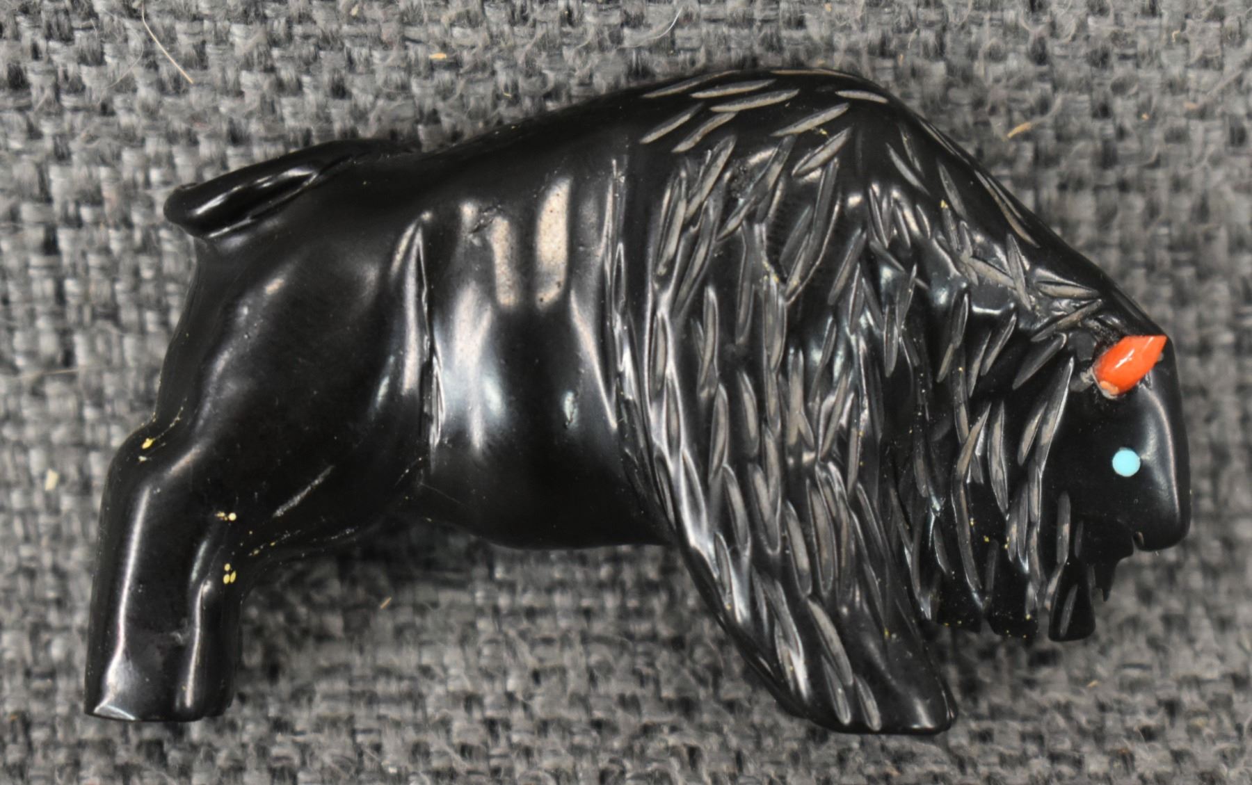 1980's Zuni, carved pipestone pigs, Jett lizard, bone bear and a buffalo. Largest 1.25" x 2.25"