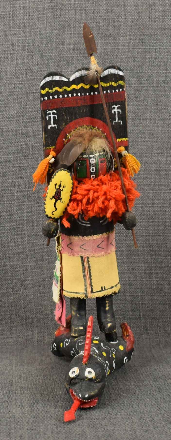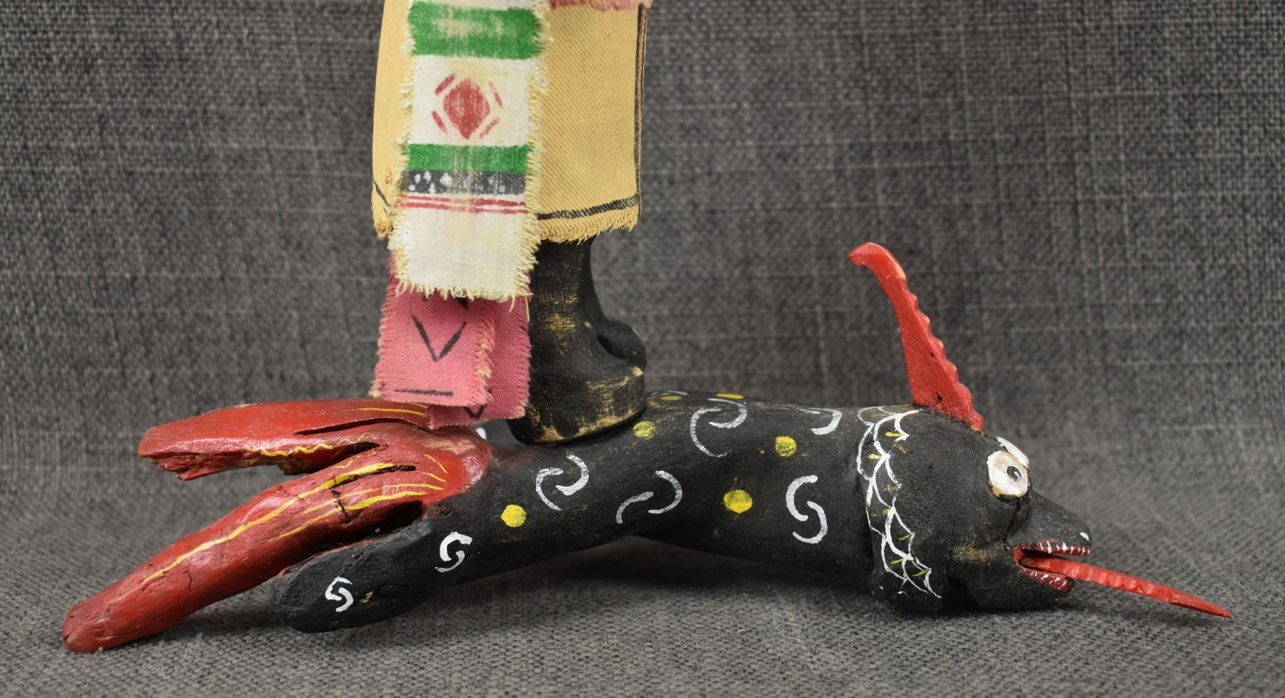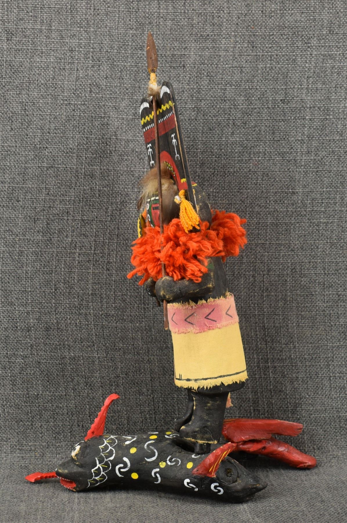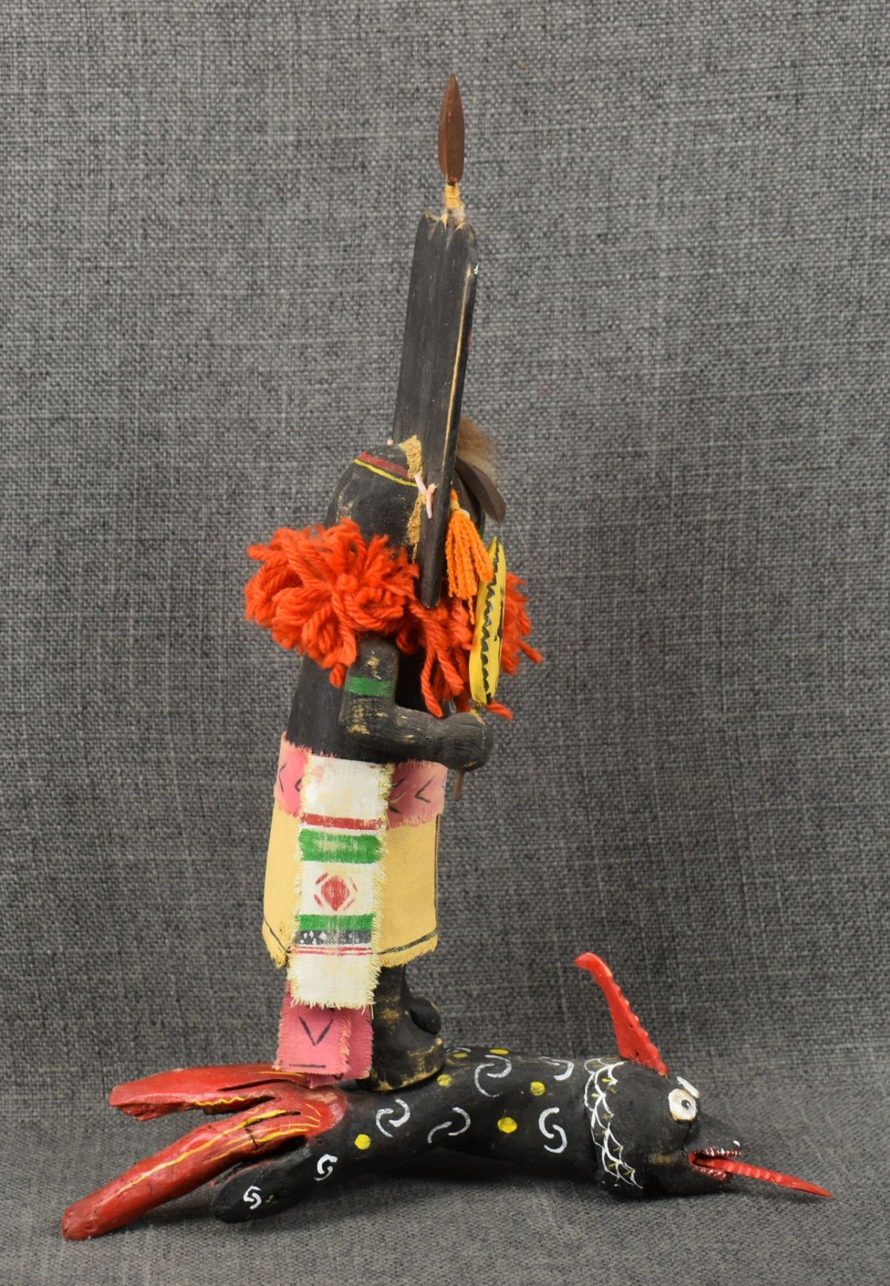 1990's Folk art carved and painted doll depicting kachina riding avanyu. 14.5" tall