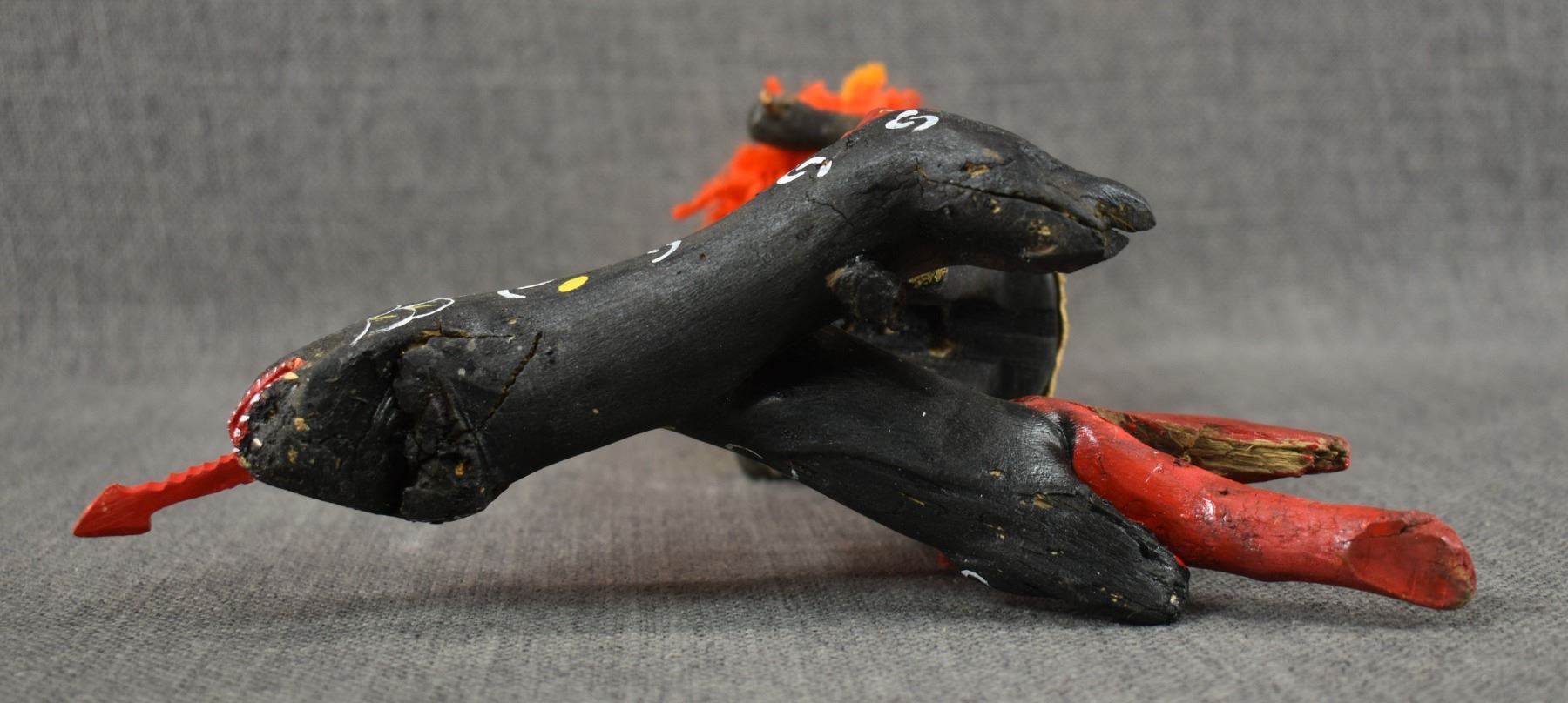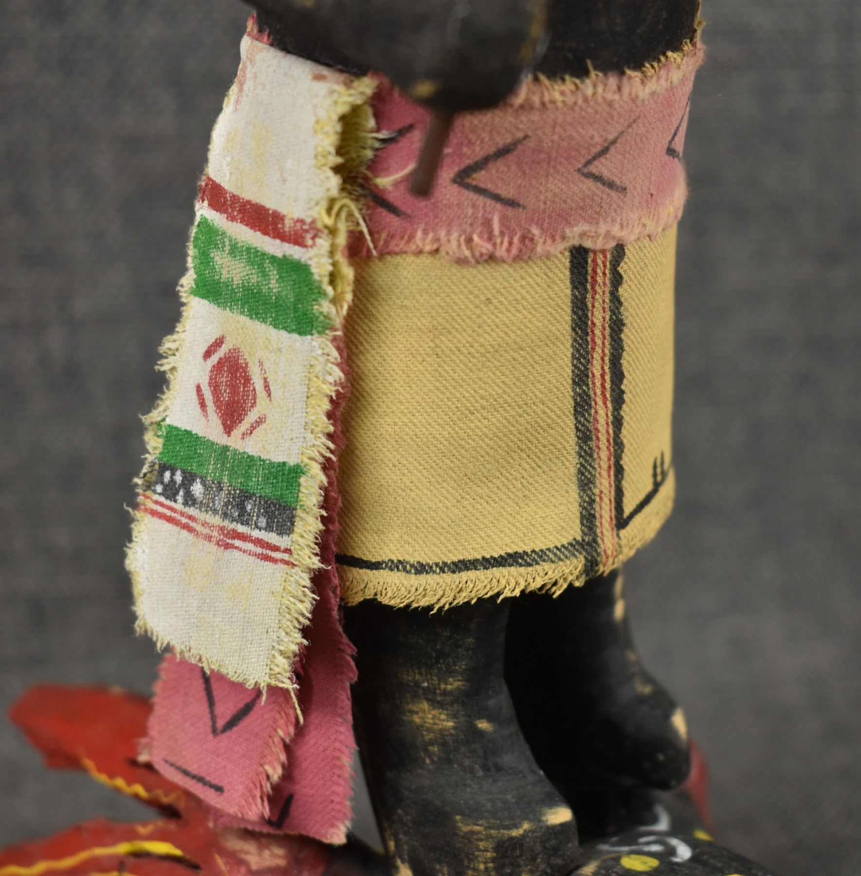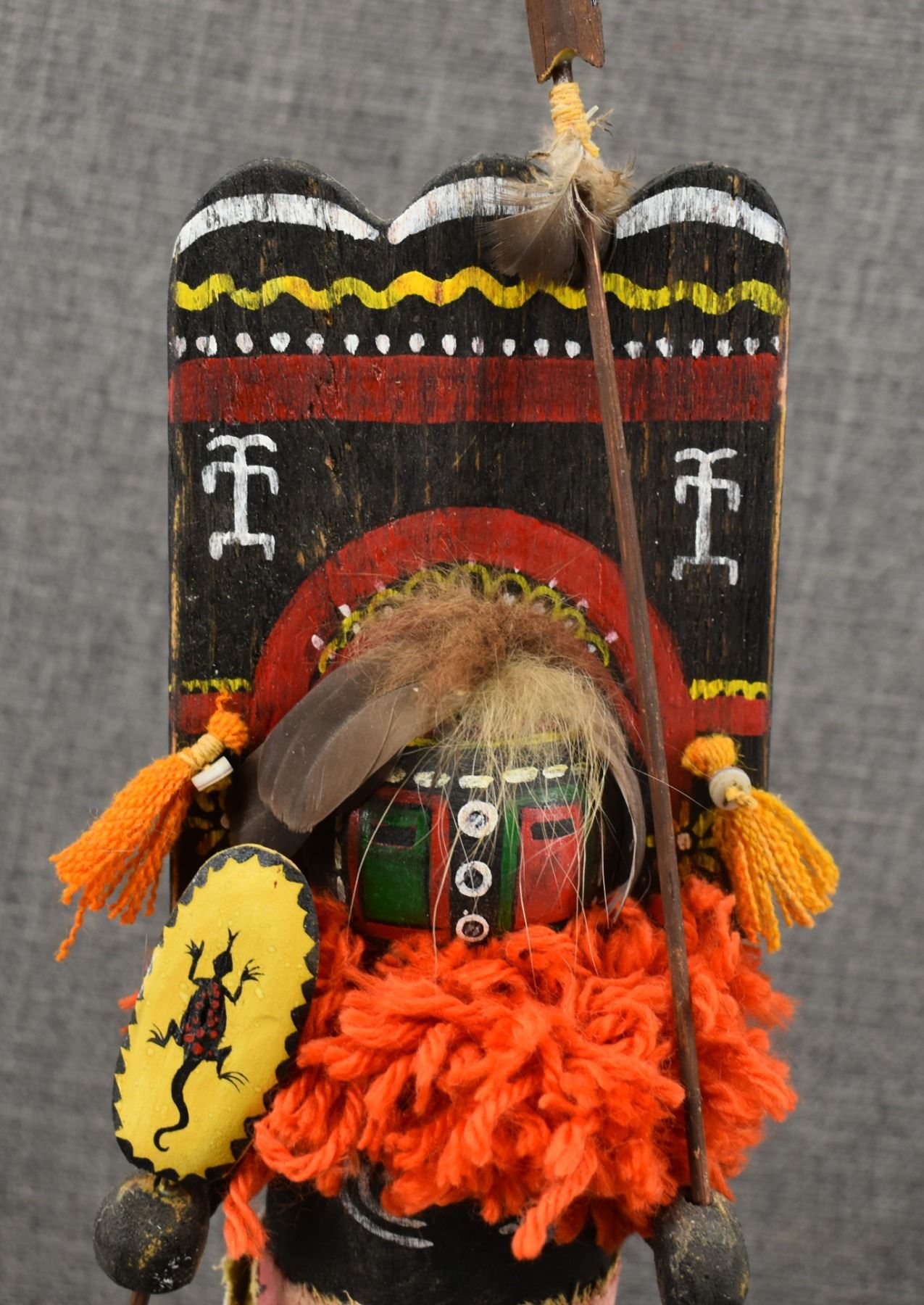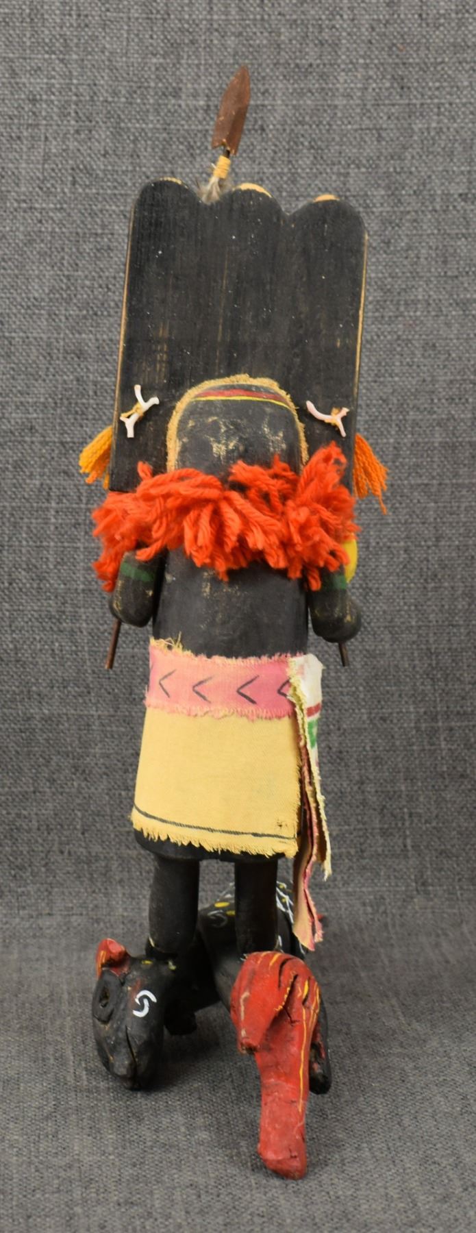 1990's Folk art carved and painted doll depicting kachina riding avanyu. 14.5" tall