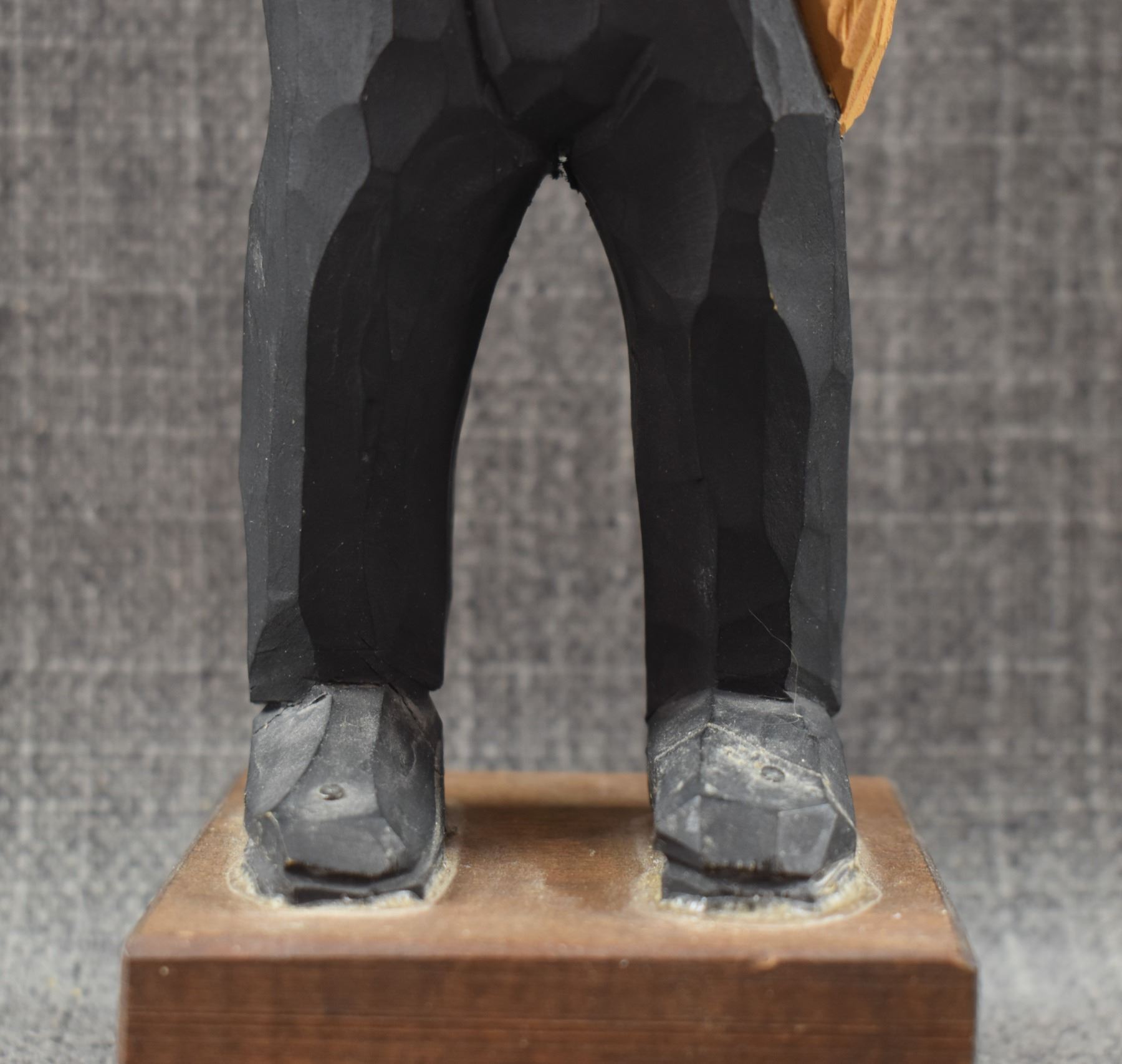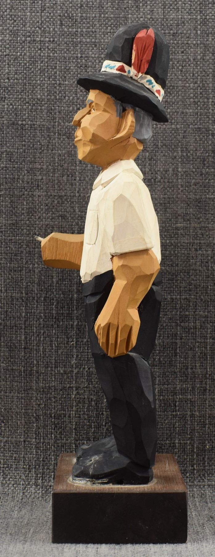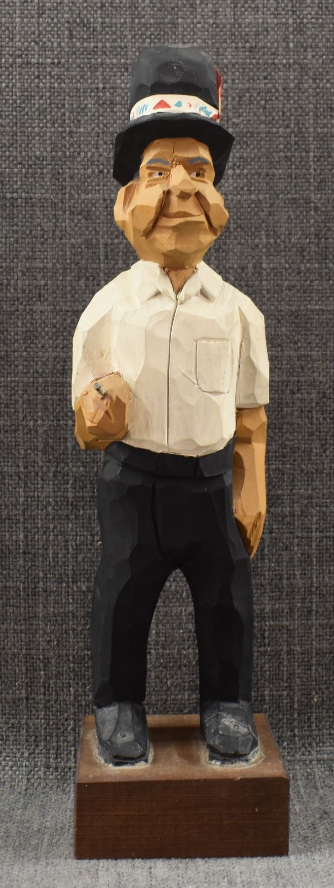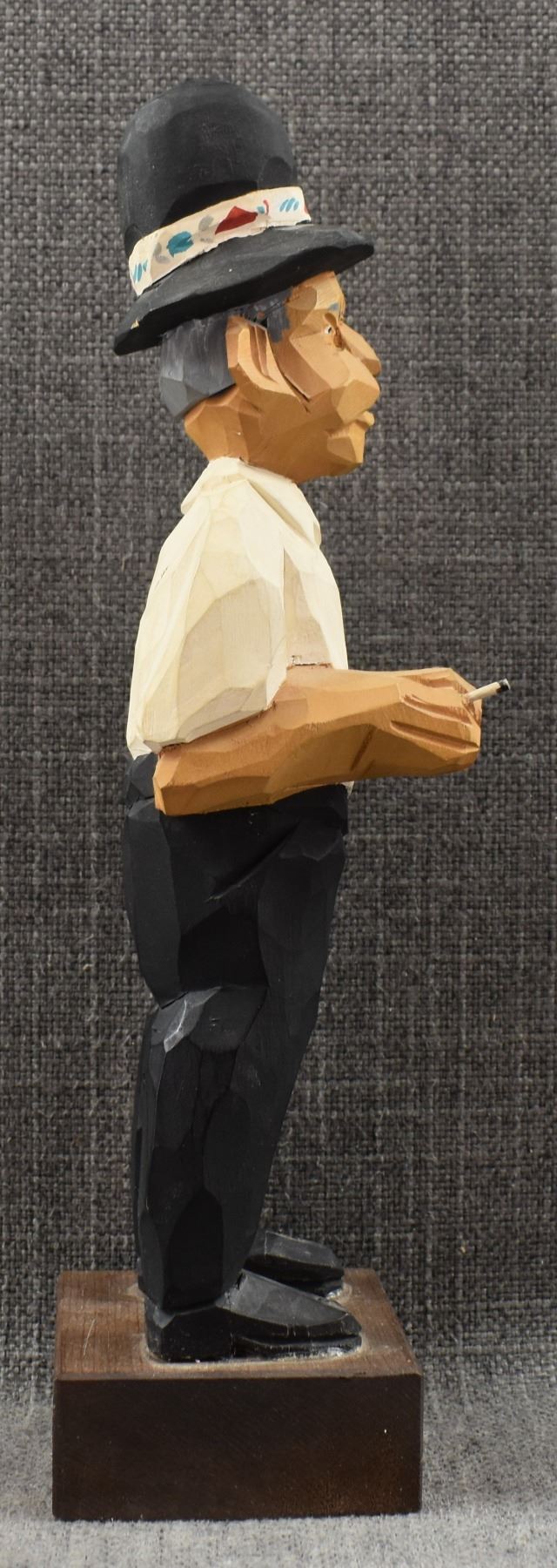 Folk art figure signed. Hand carved wood depicting man smoking cigarette. 11" x 3"