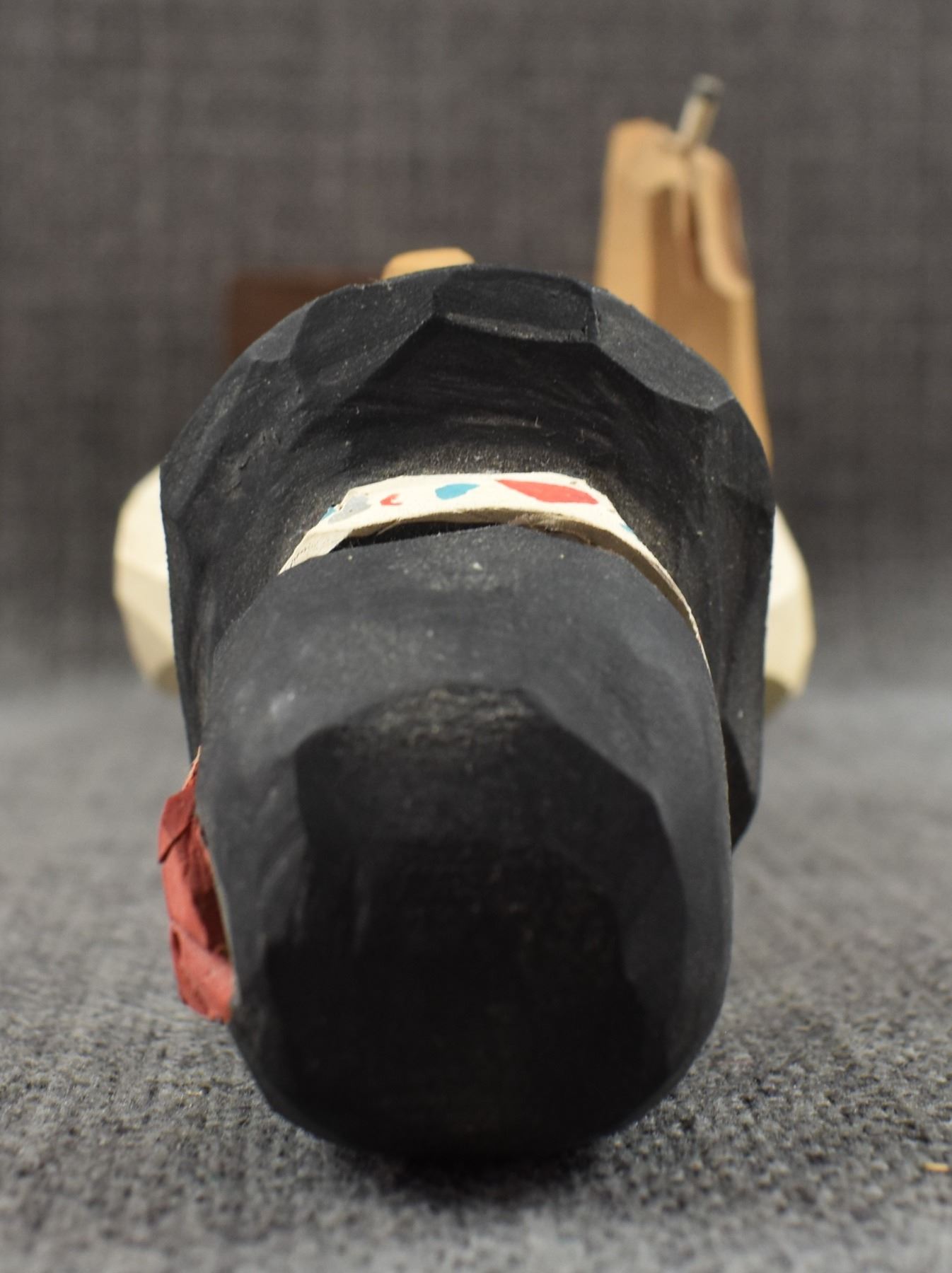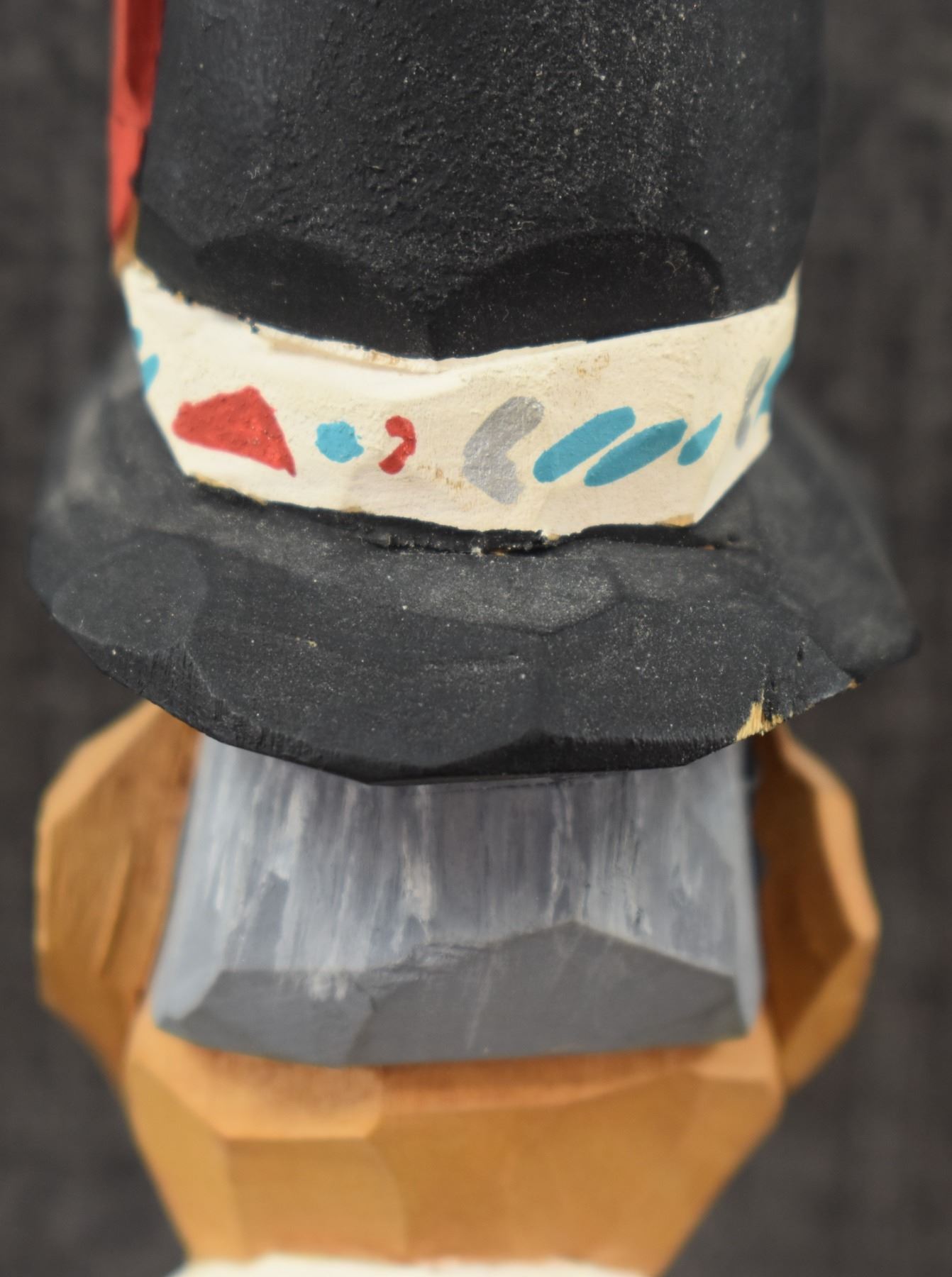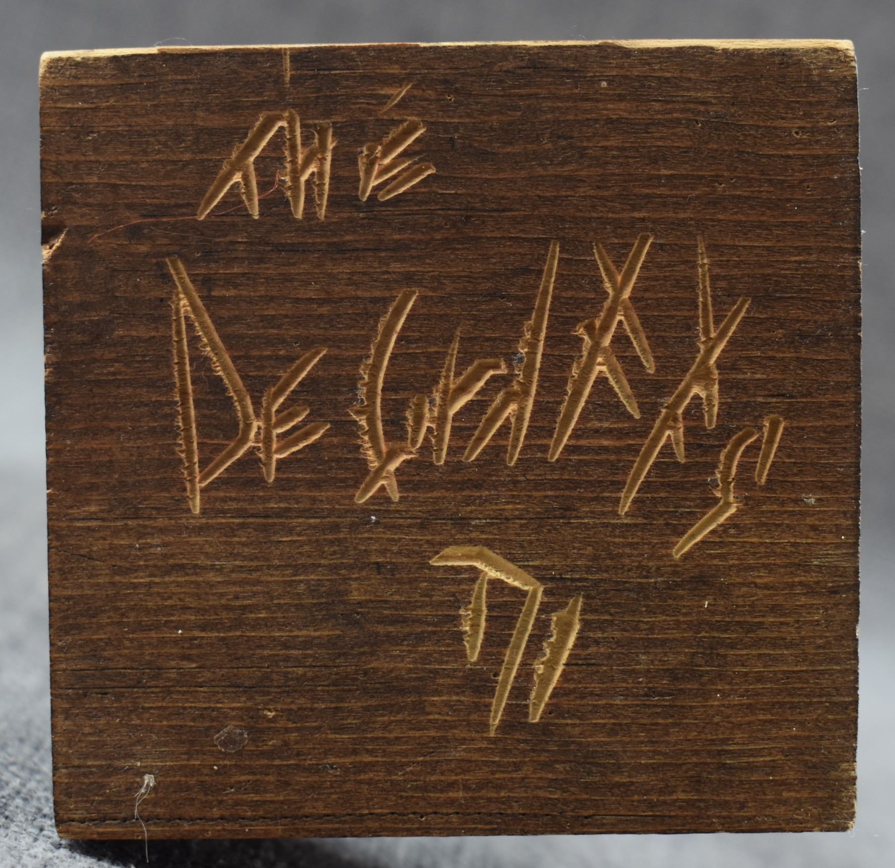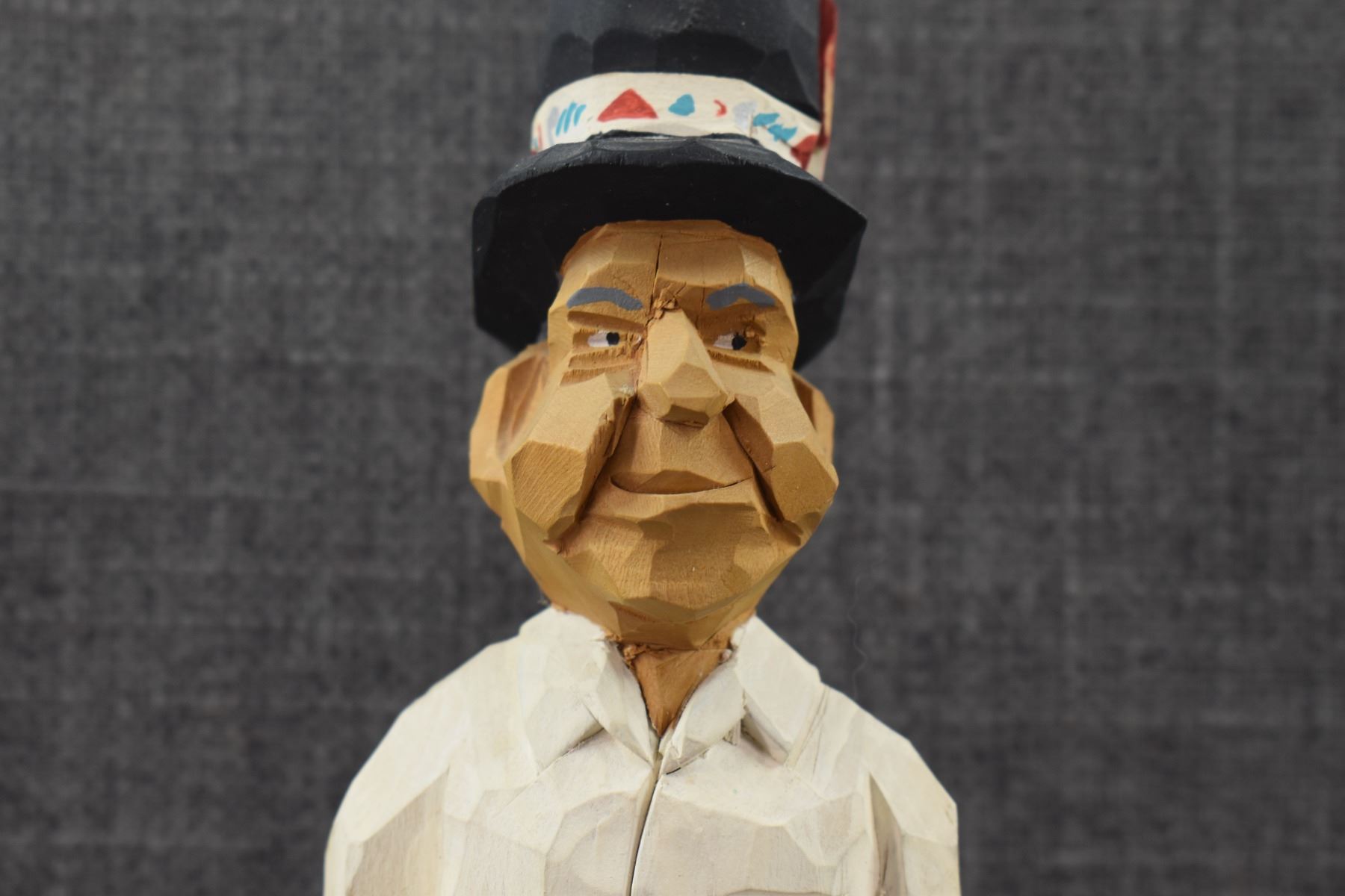 Folk art figure signed. Hand carved wood depicting man smoking cigarette. 11" x 3"