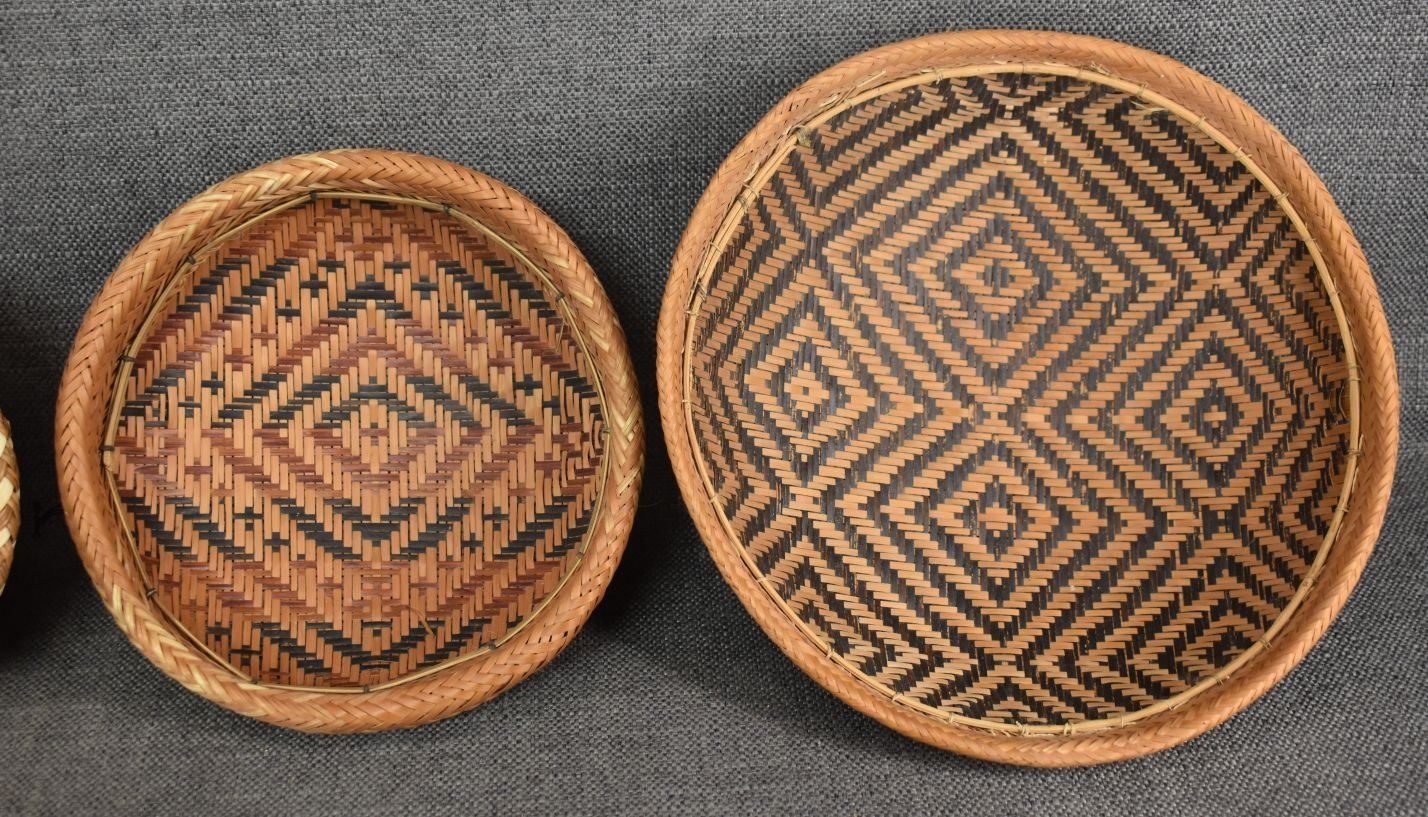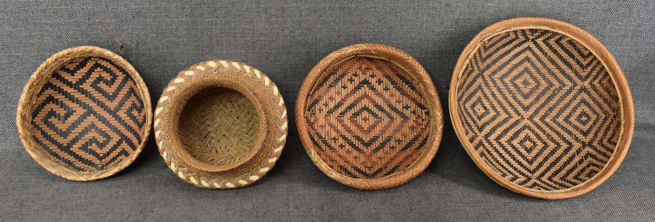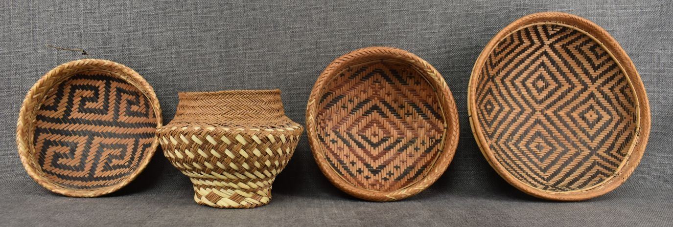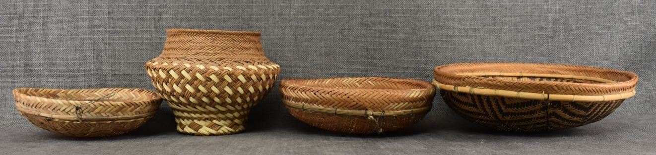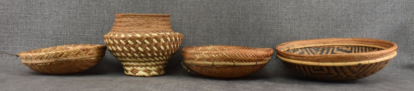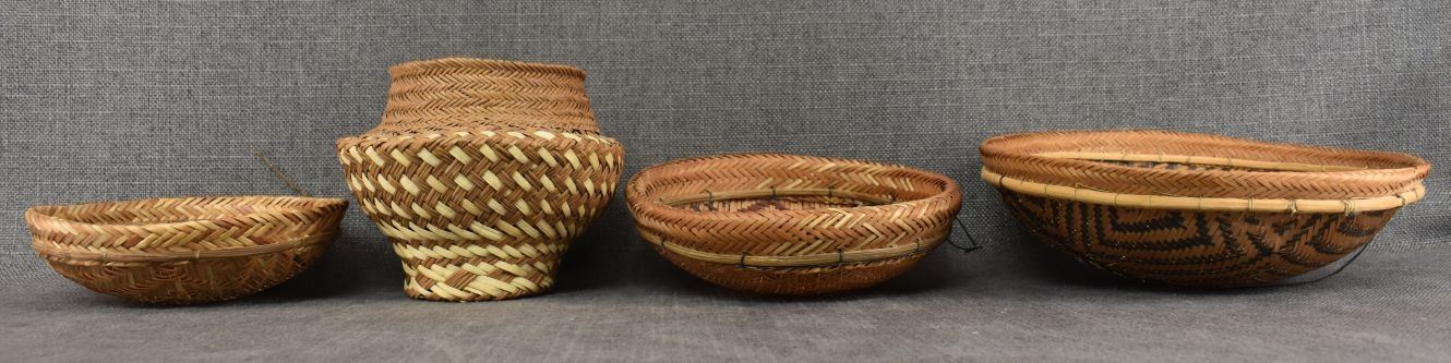 Three basketry bowls, one Tarahumara basketry olla. Largest bowl 4"x 9.5"