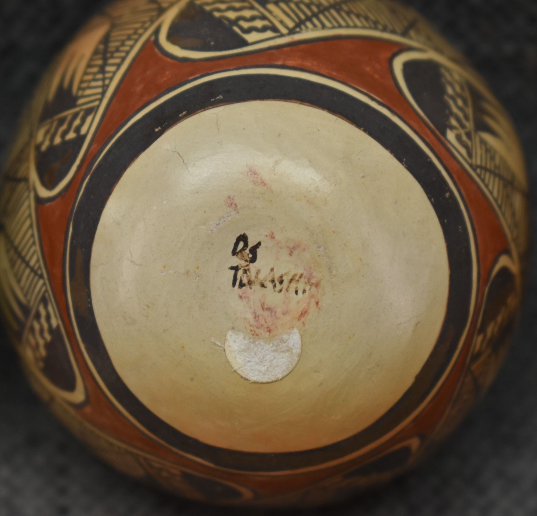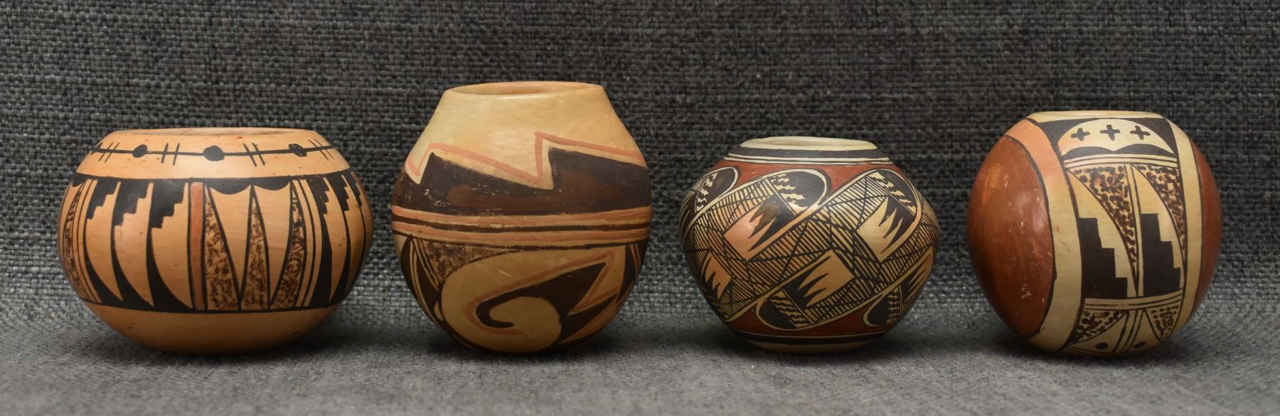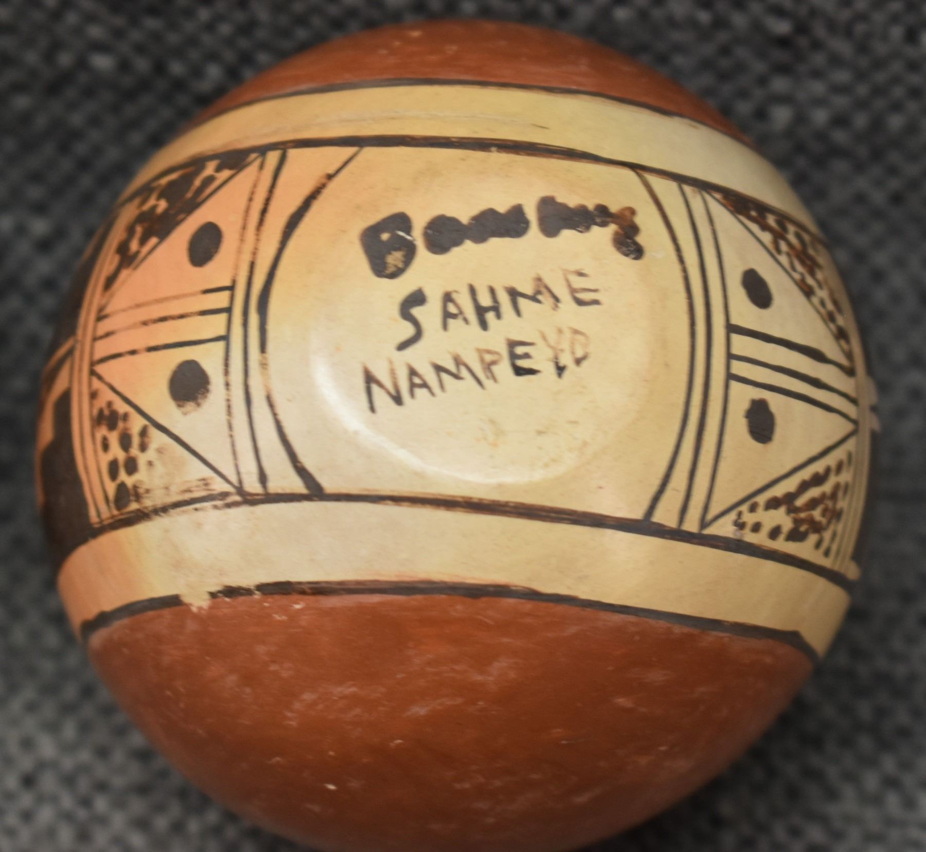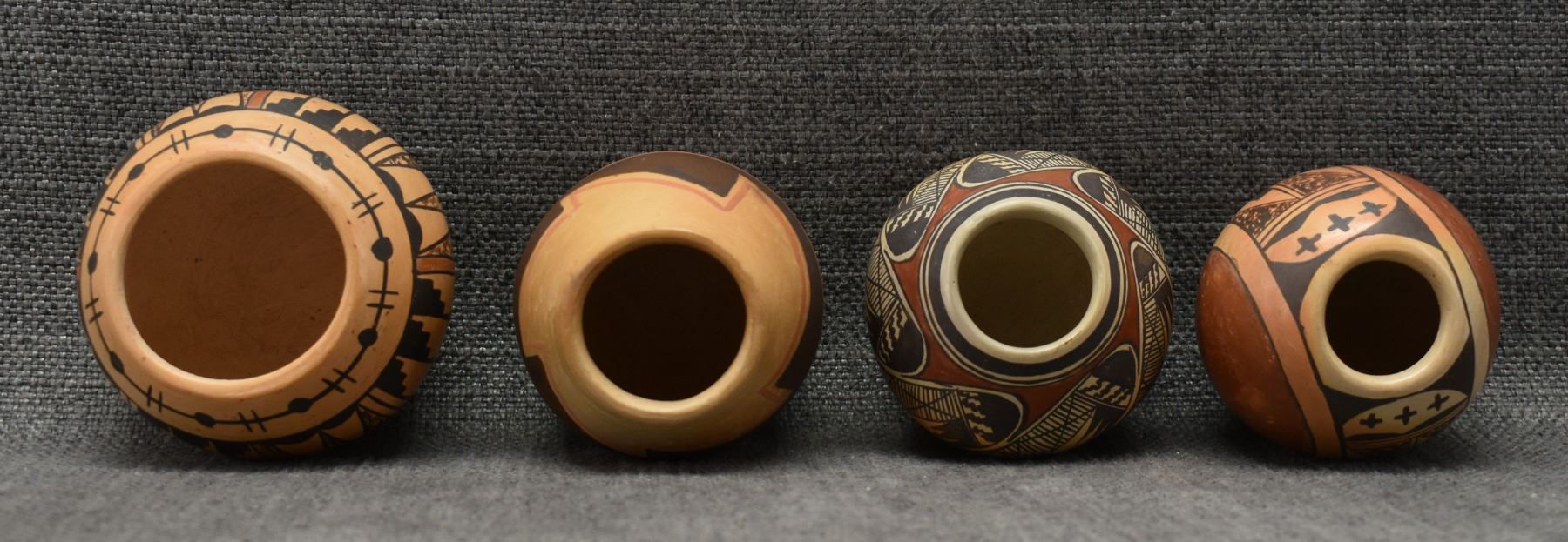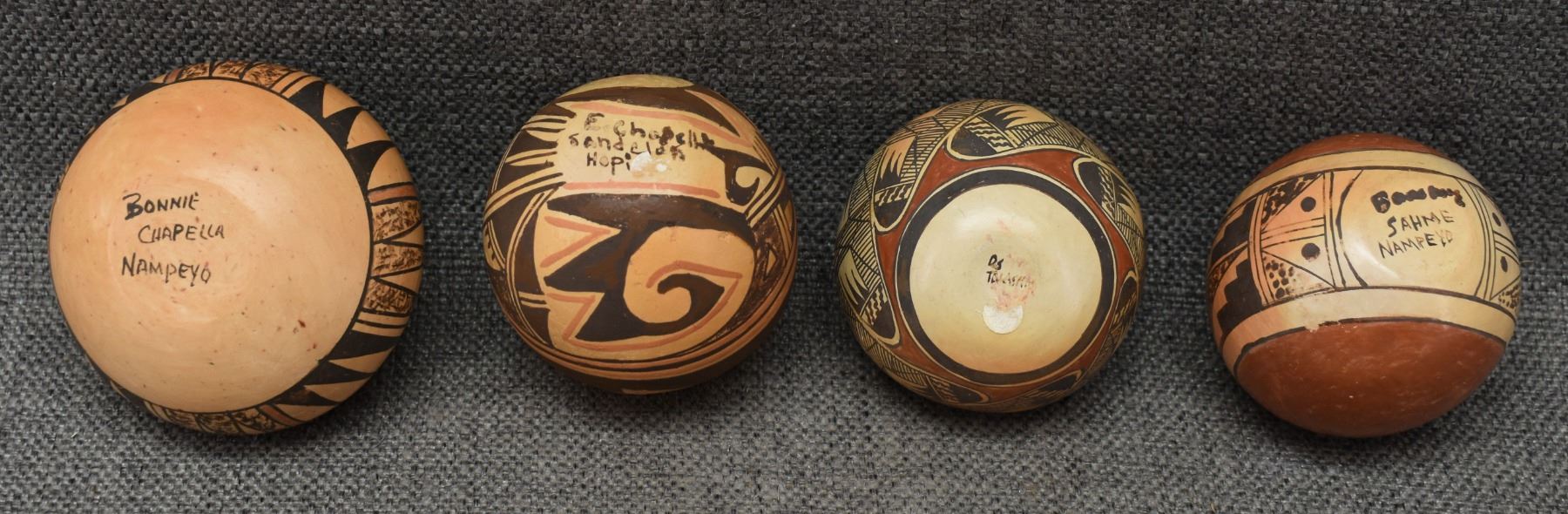 1980's Hopi. Hand coiled and polychrome painted design pottery bowls. All signed. Largest is 2.25'' x 3''