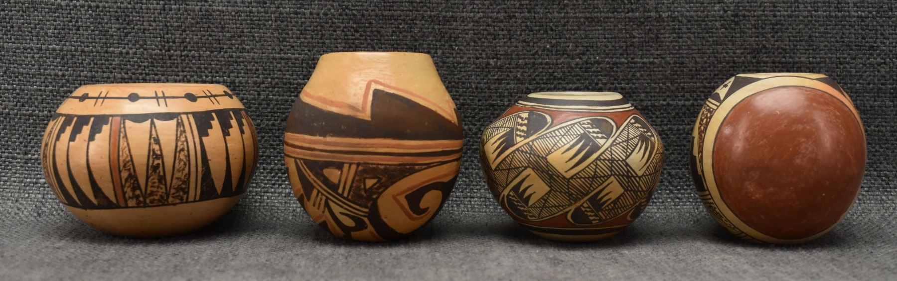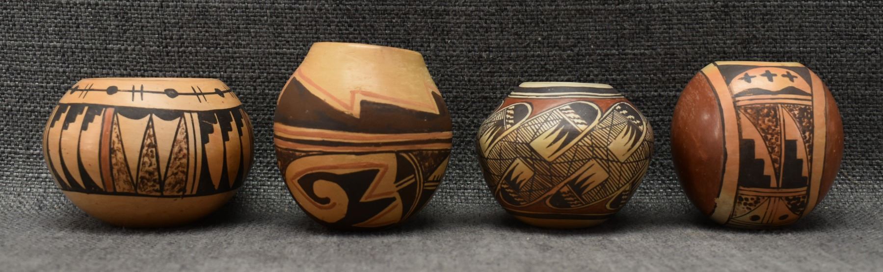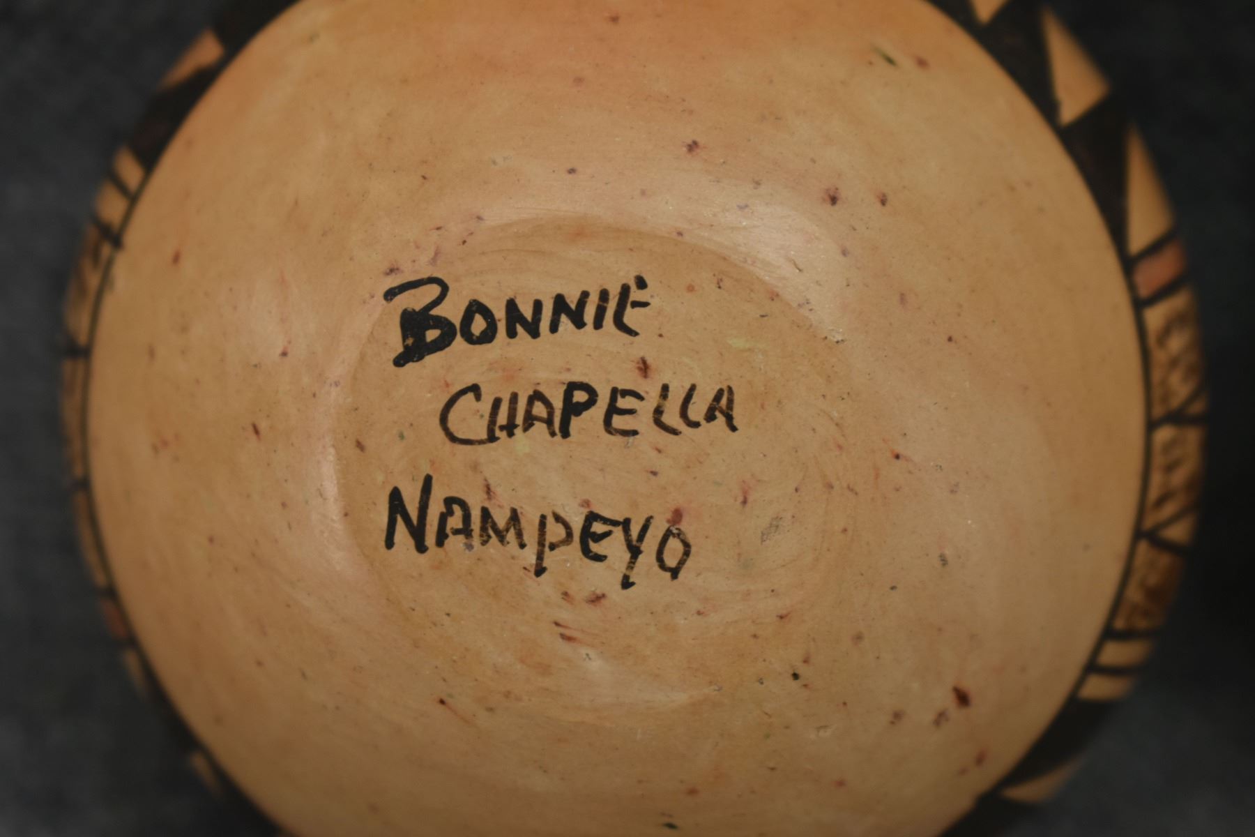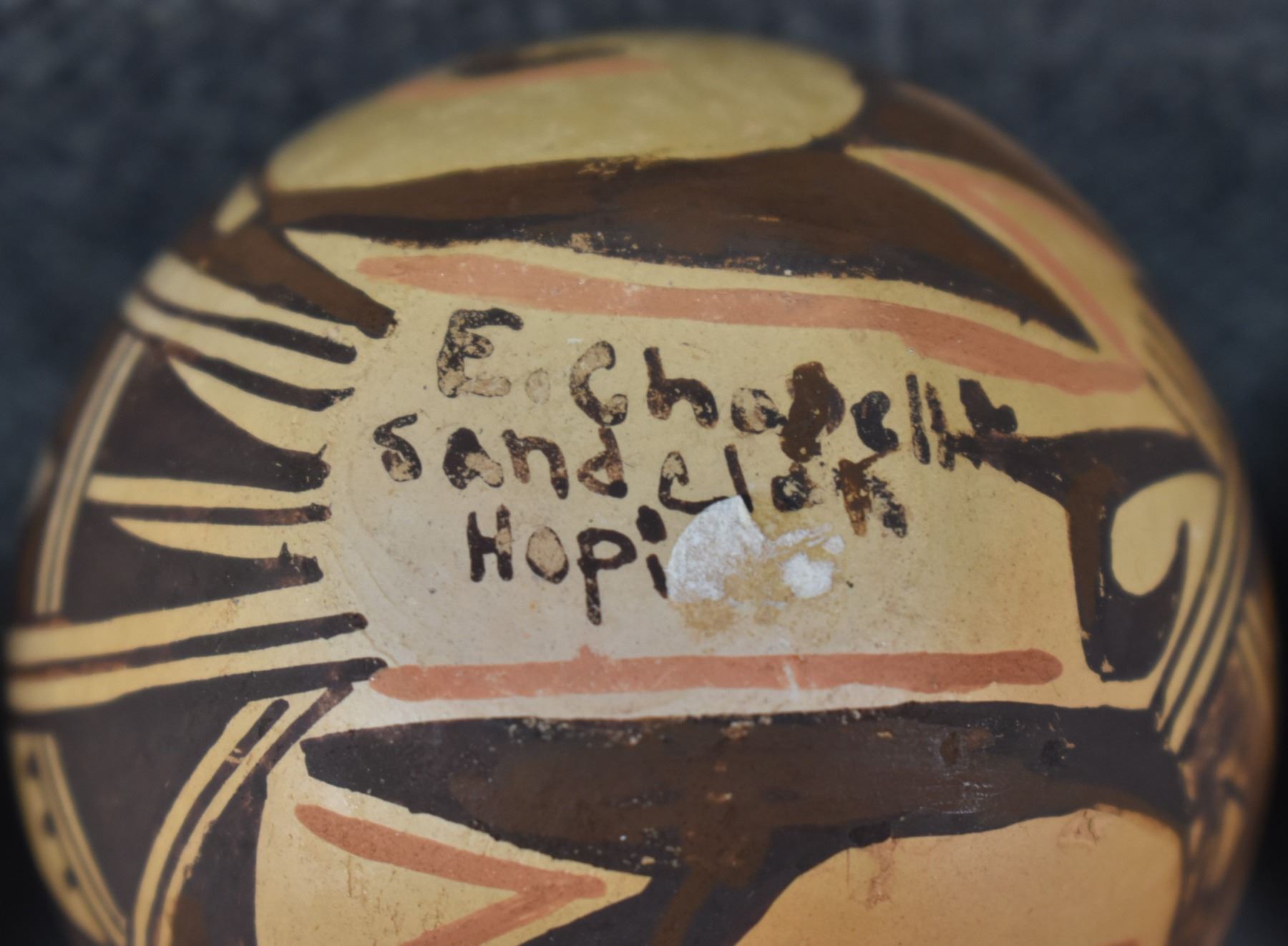 1980's Hopi. Hand coiled and polychrome painted design pottery bowls. All signed. Largest is 2.25'' x 3''