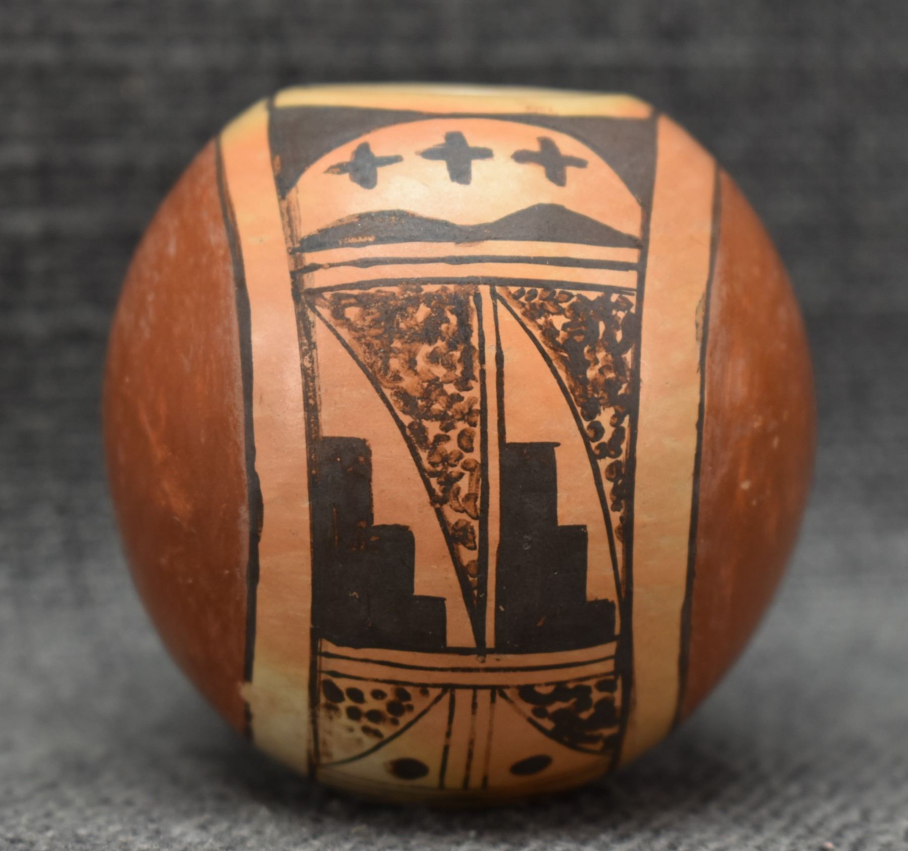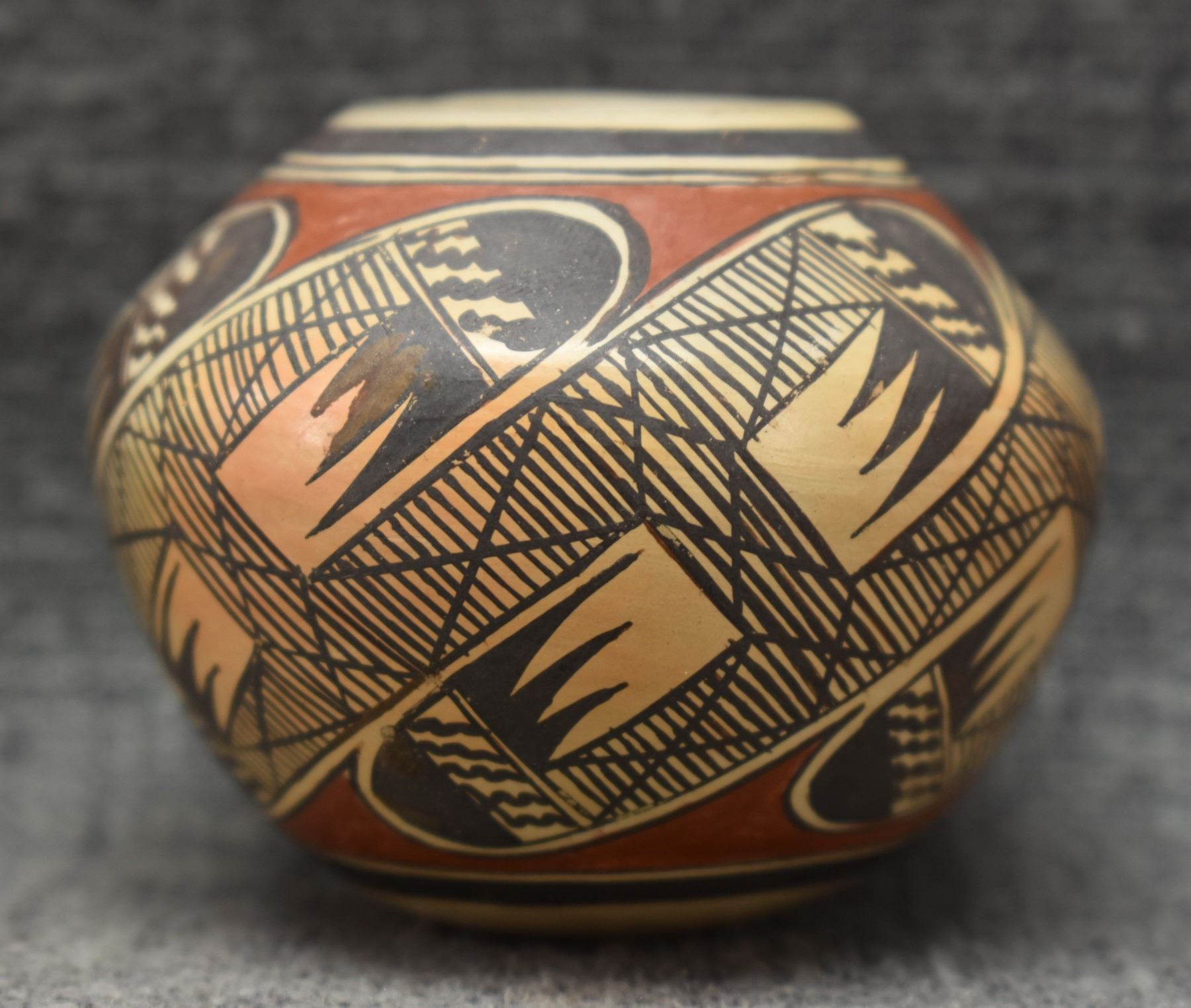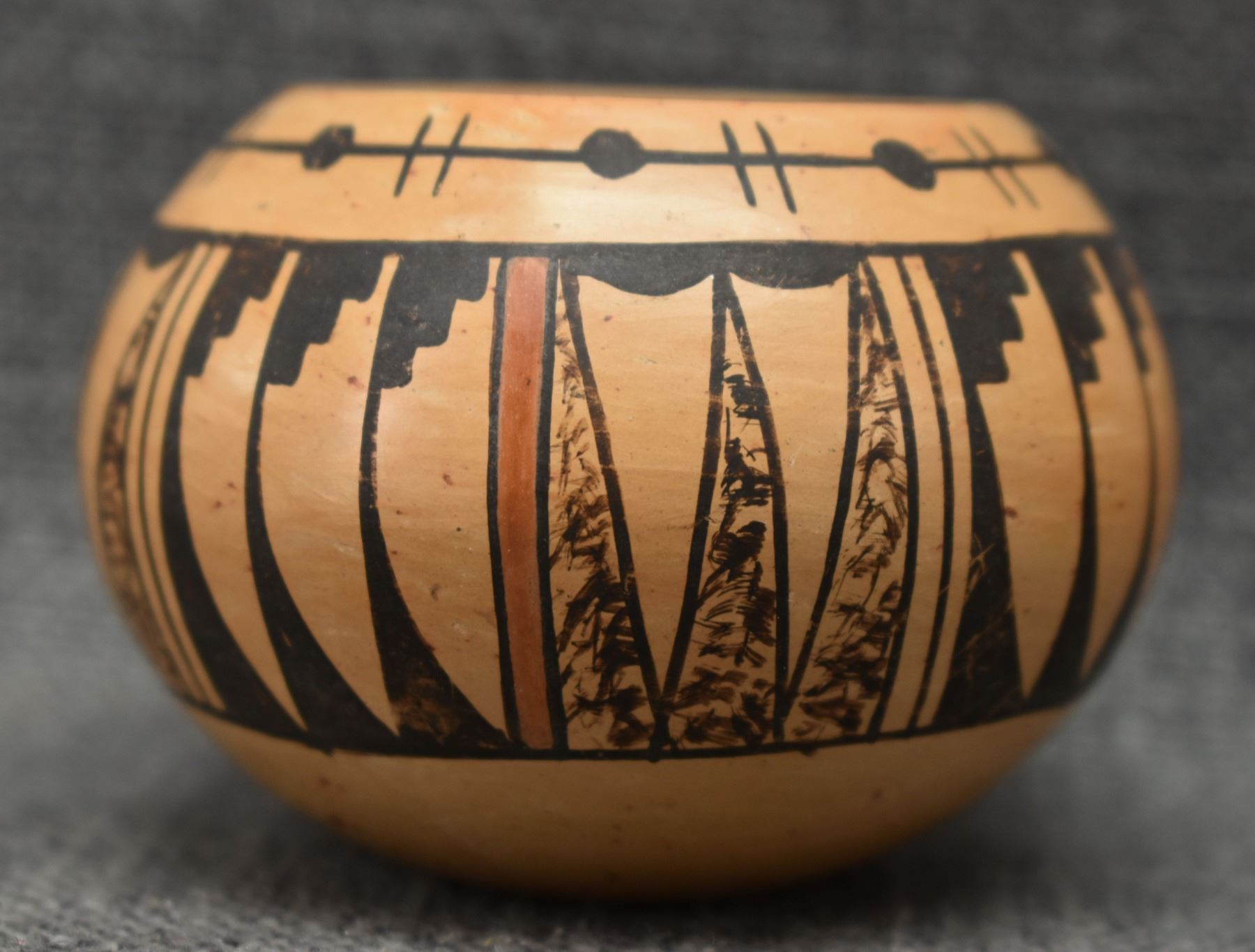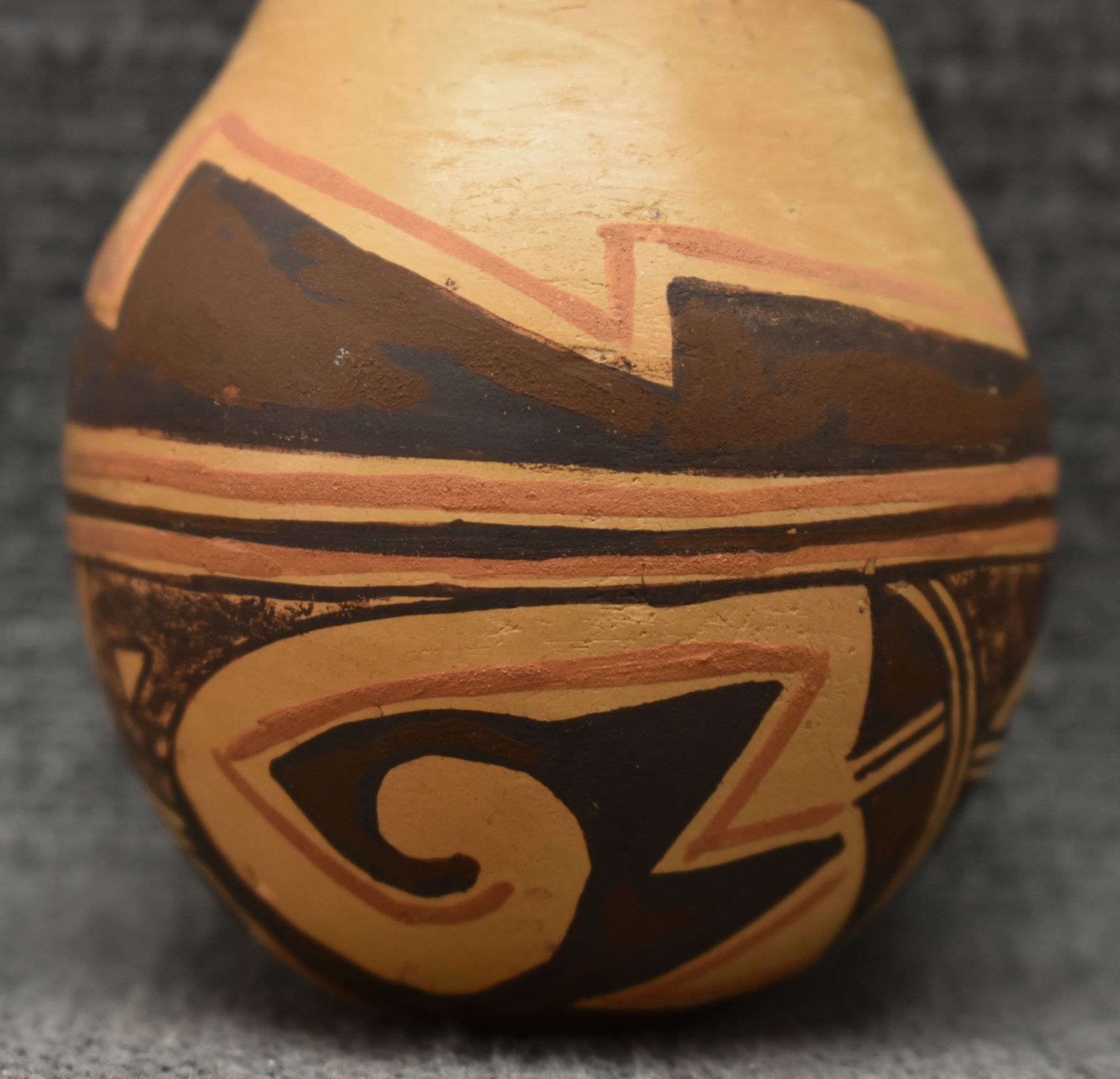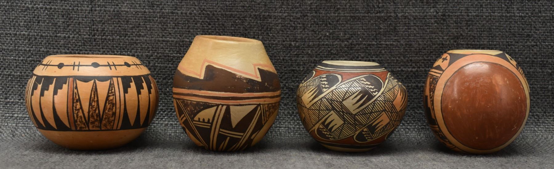1980's Hopi. Hand coiled and polychrome painted design pottery bowls. All signed. Largest is 2.25'' x 3''