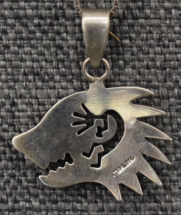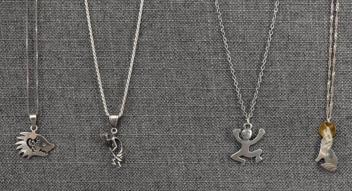 four Hopi sterling silver pendants with commercial sterling chains. Depicting Kokopelli's wolves and dancer. Total weight 53 grams. Longest 2"