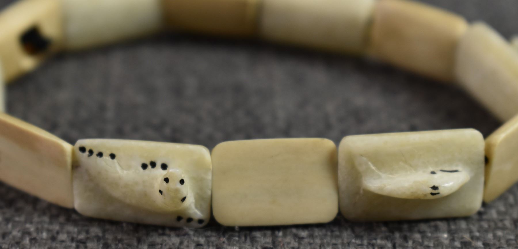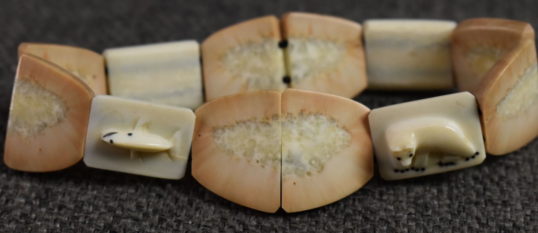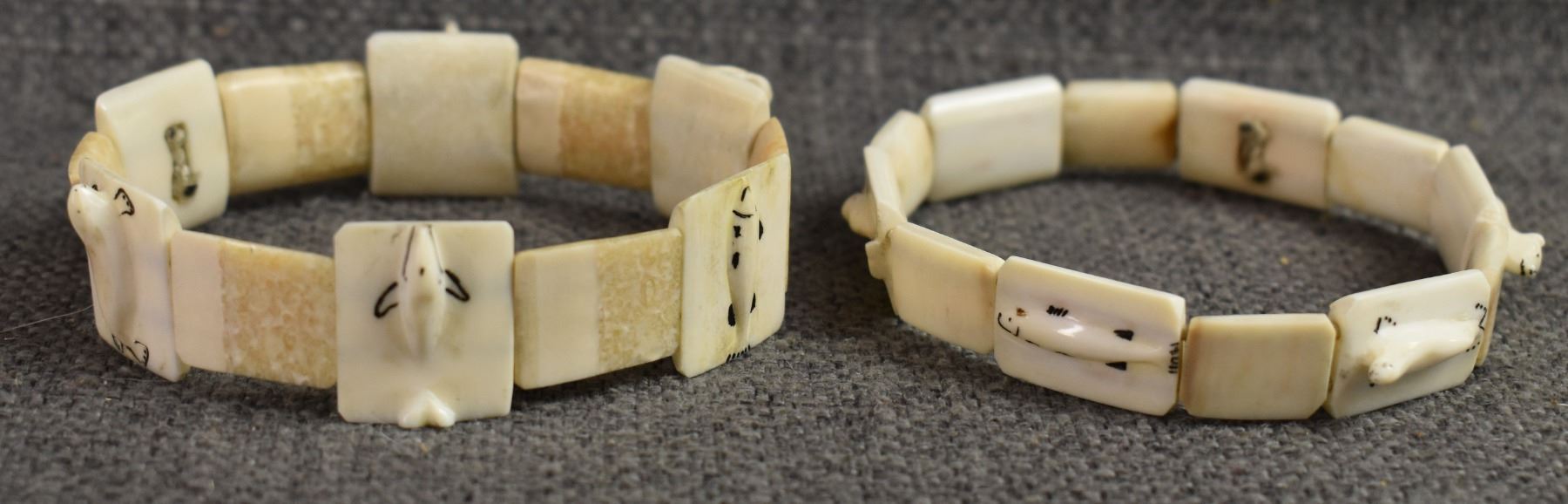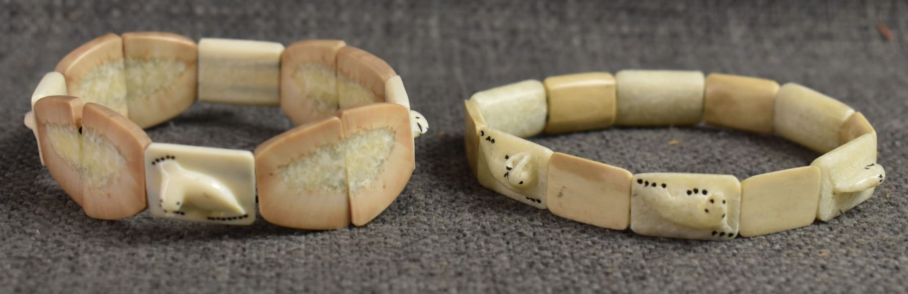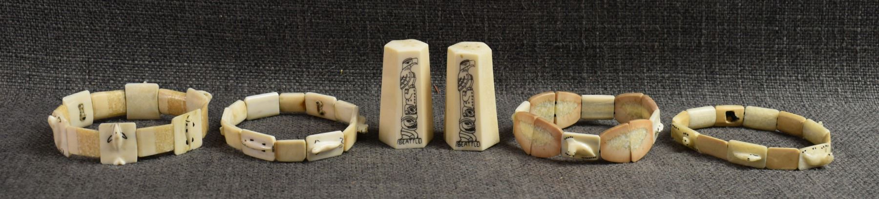 20th century. Inuit, carved animal on ivory bracelets. Largest is .75'' x 6'' salt & pepper shakers 2'' tall