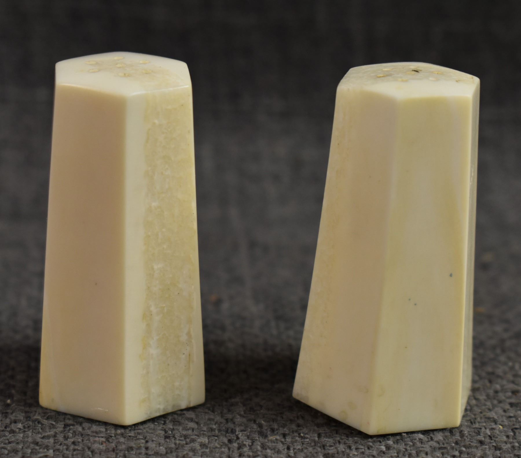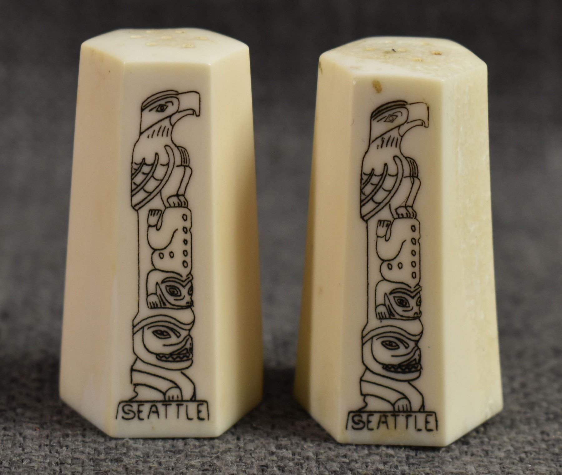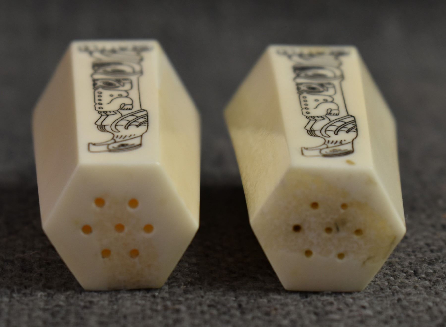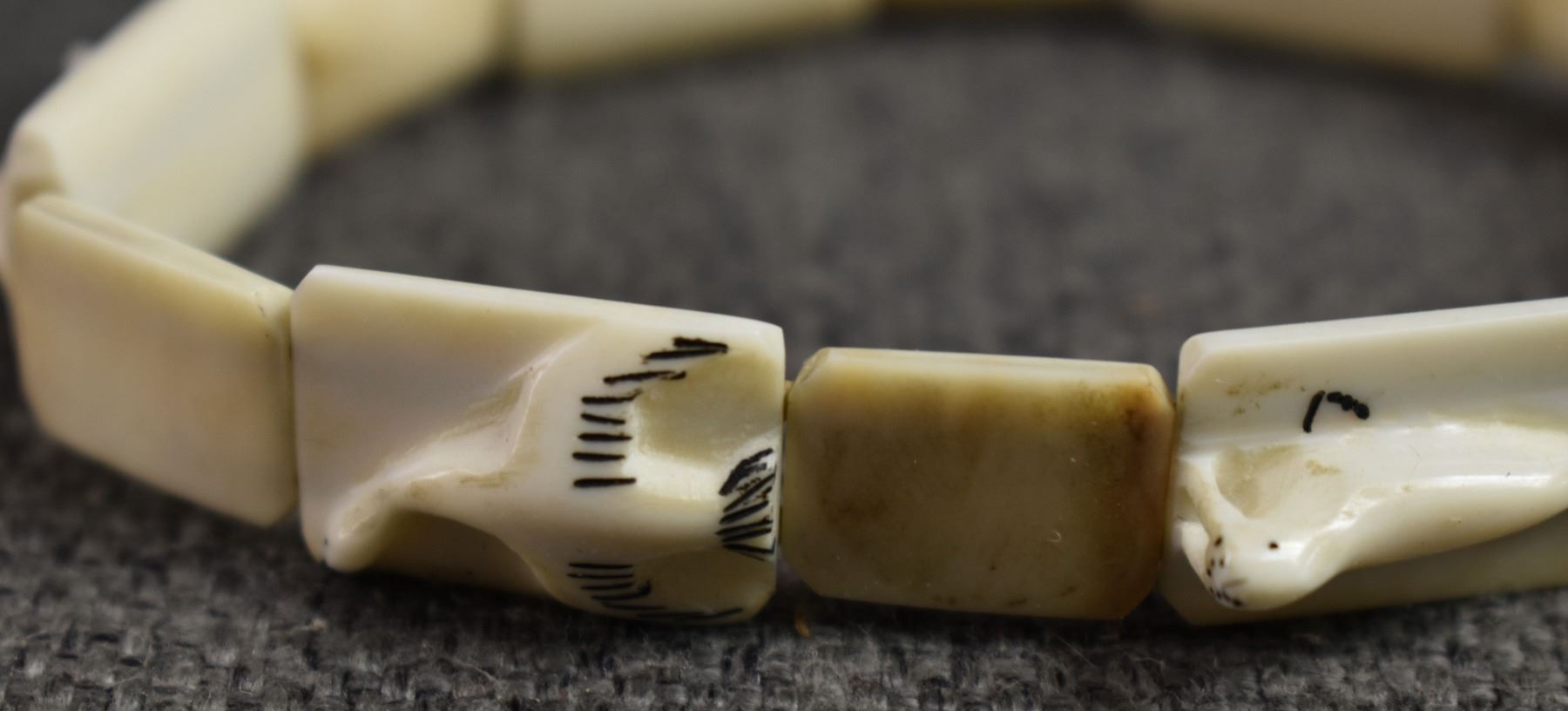 20th century. Inuit, carved animal on ivory bracelets. Largest is .75'' x 6'' salt & pepper shakers 2'' tall