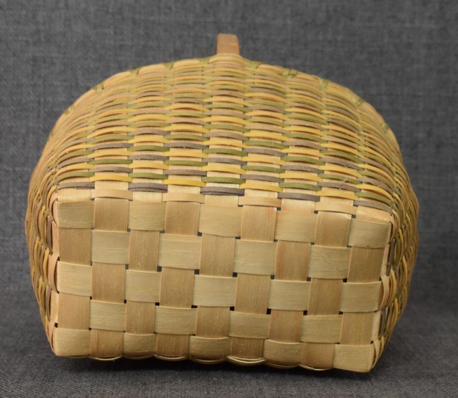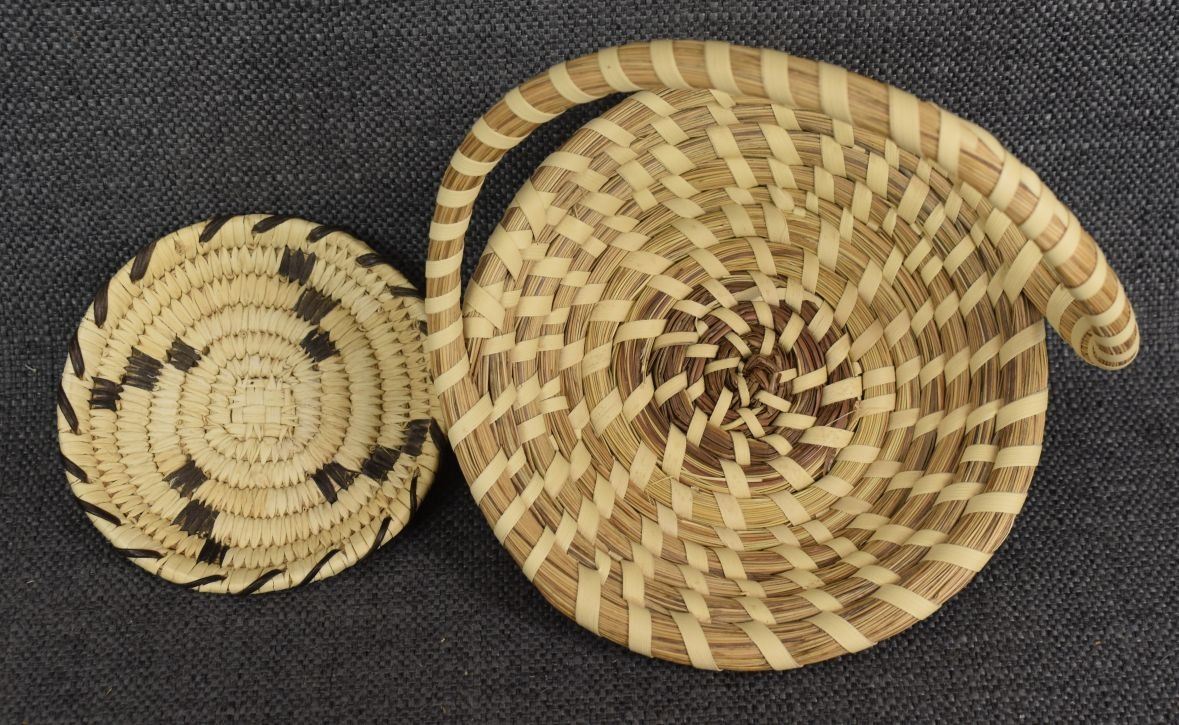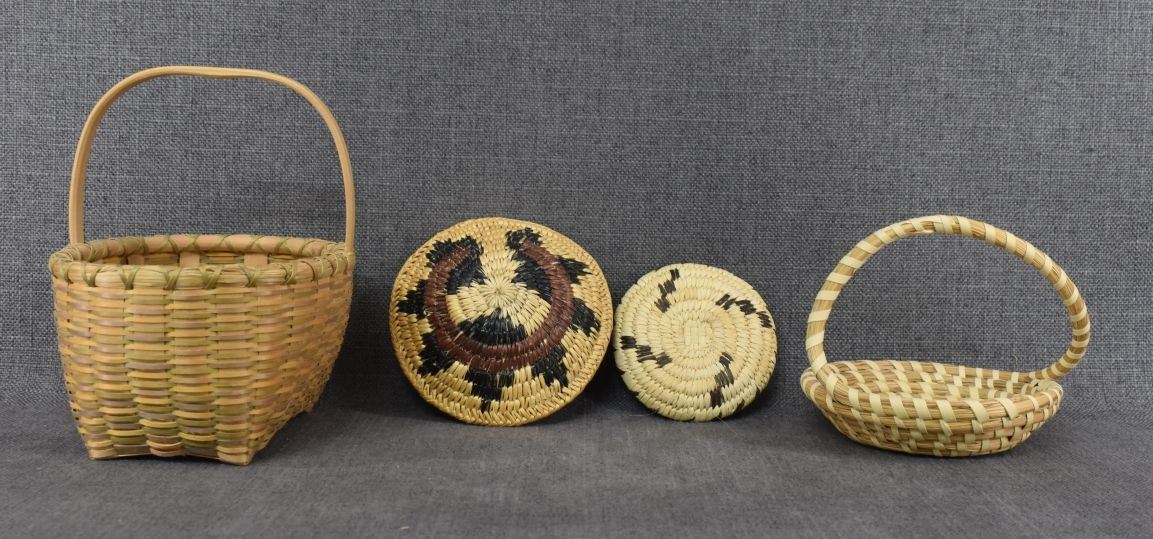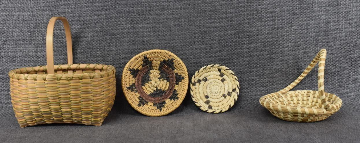 Four native American Basketry items. One Papago try with geometric design, One Papago basket with gap stich design. One Navajo Wedding basket, One Cherokee Basket With handle. Largest