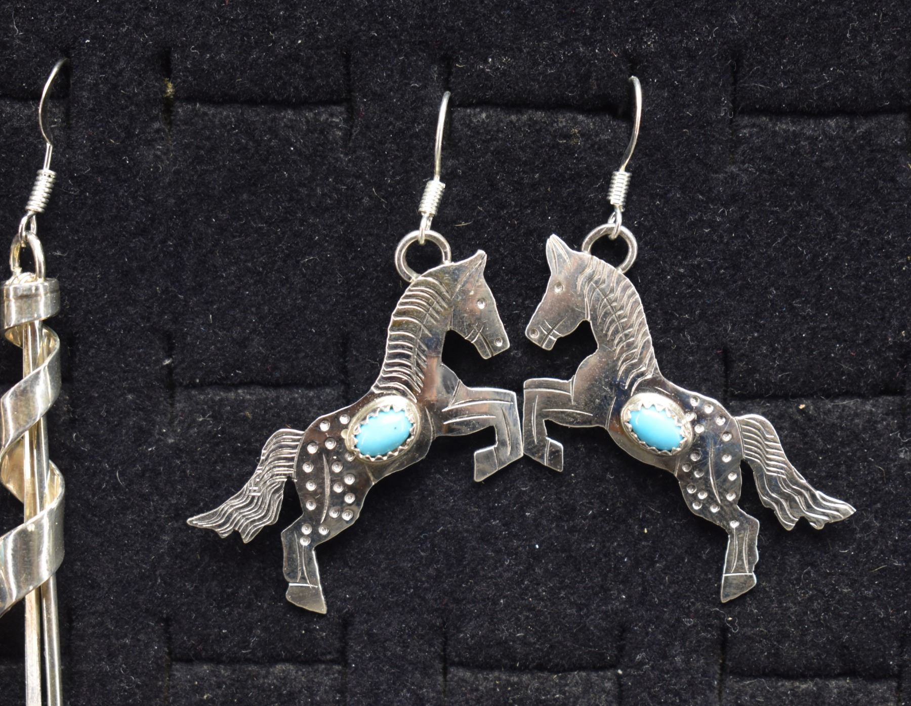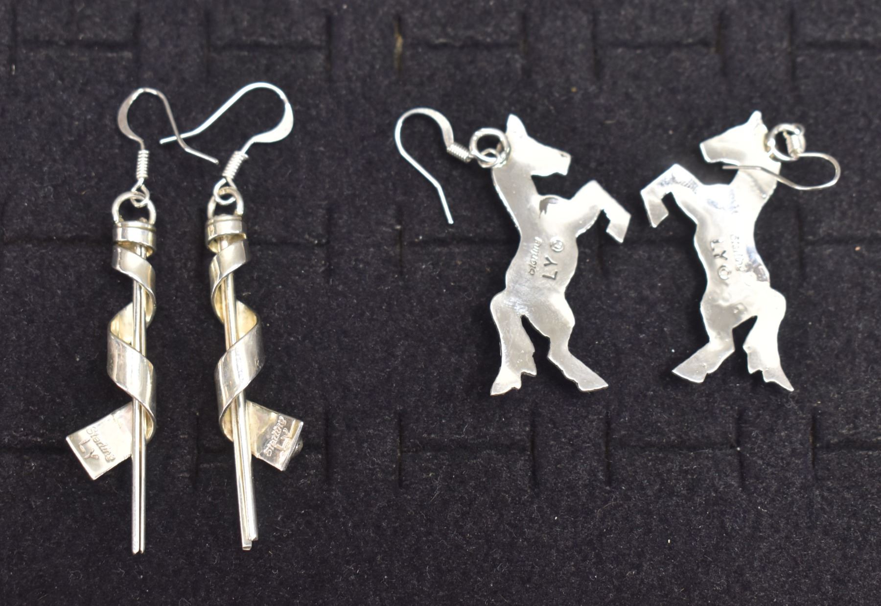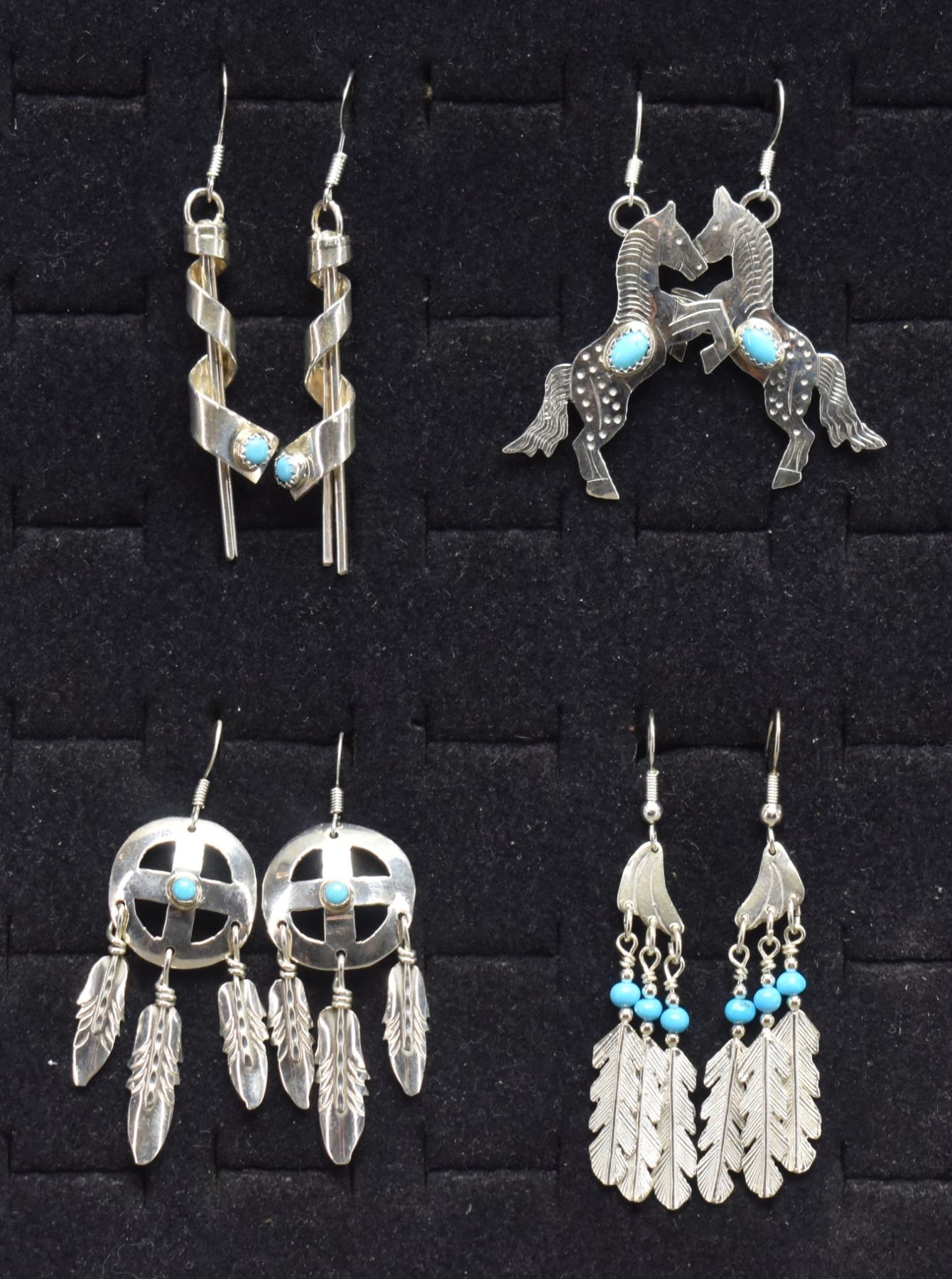 four sterling silver and turquoise earrings signed L.Y., J.W., L.Y., unsigned. Total weight 24 grams. Longest 2.5".