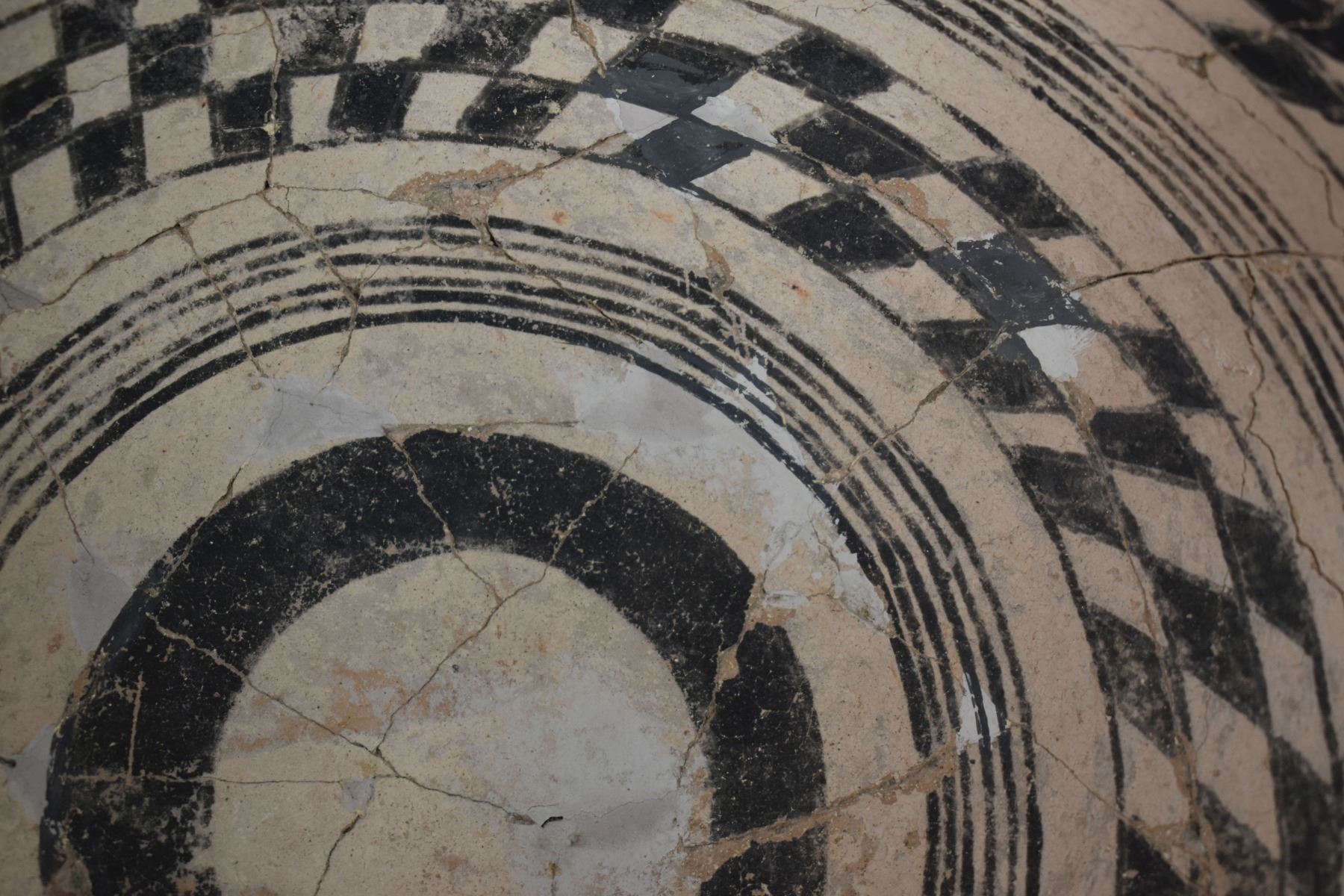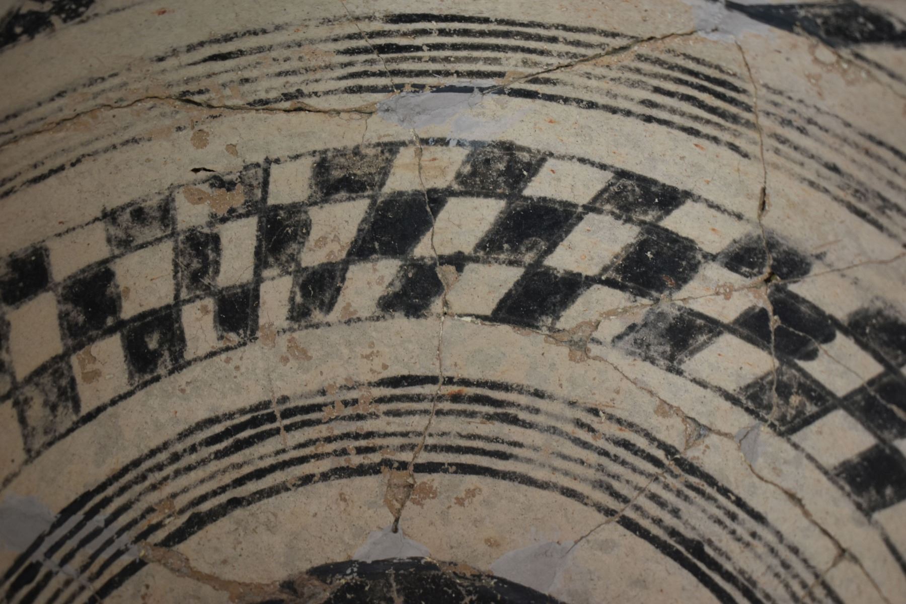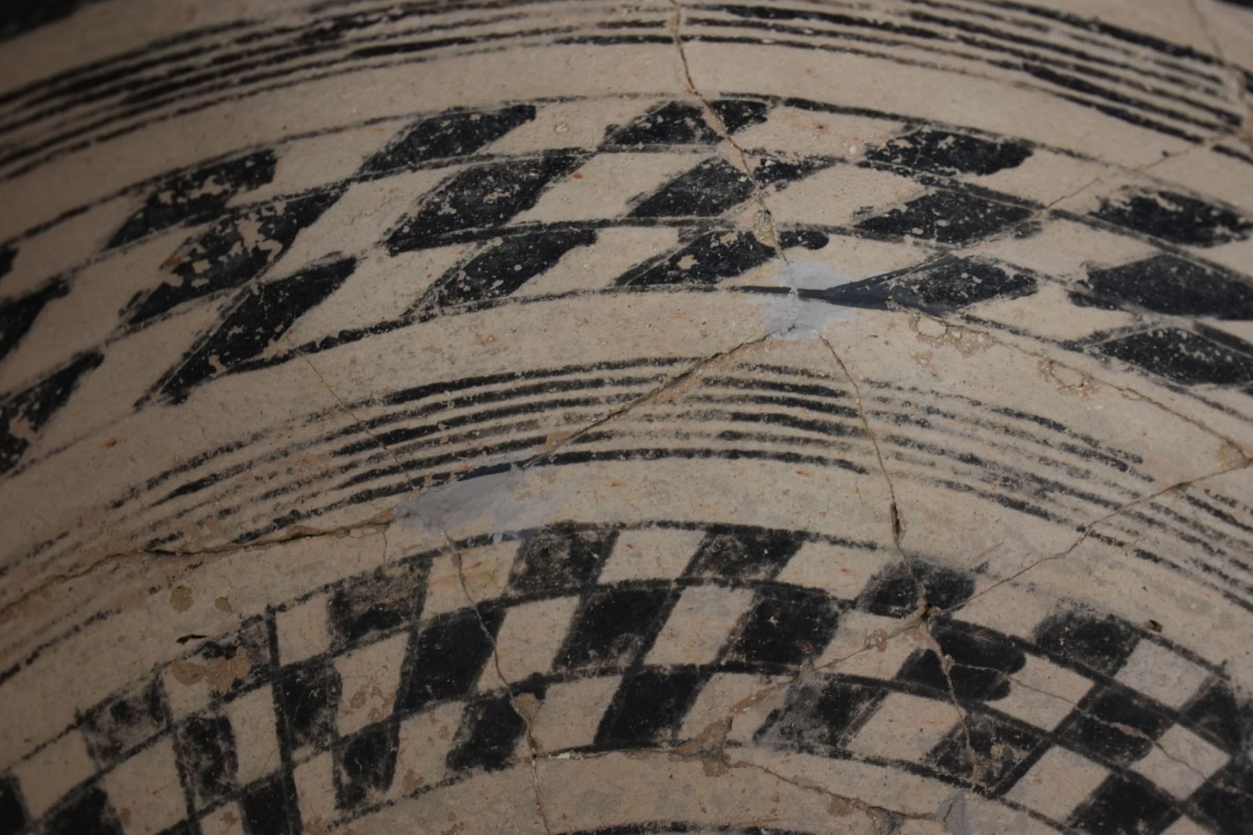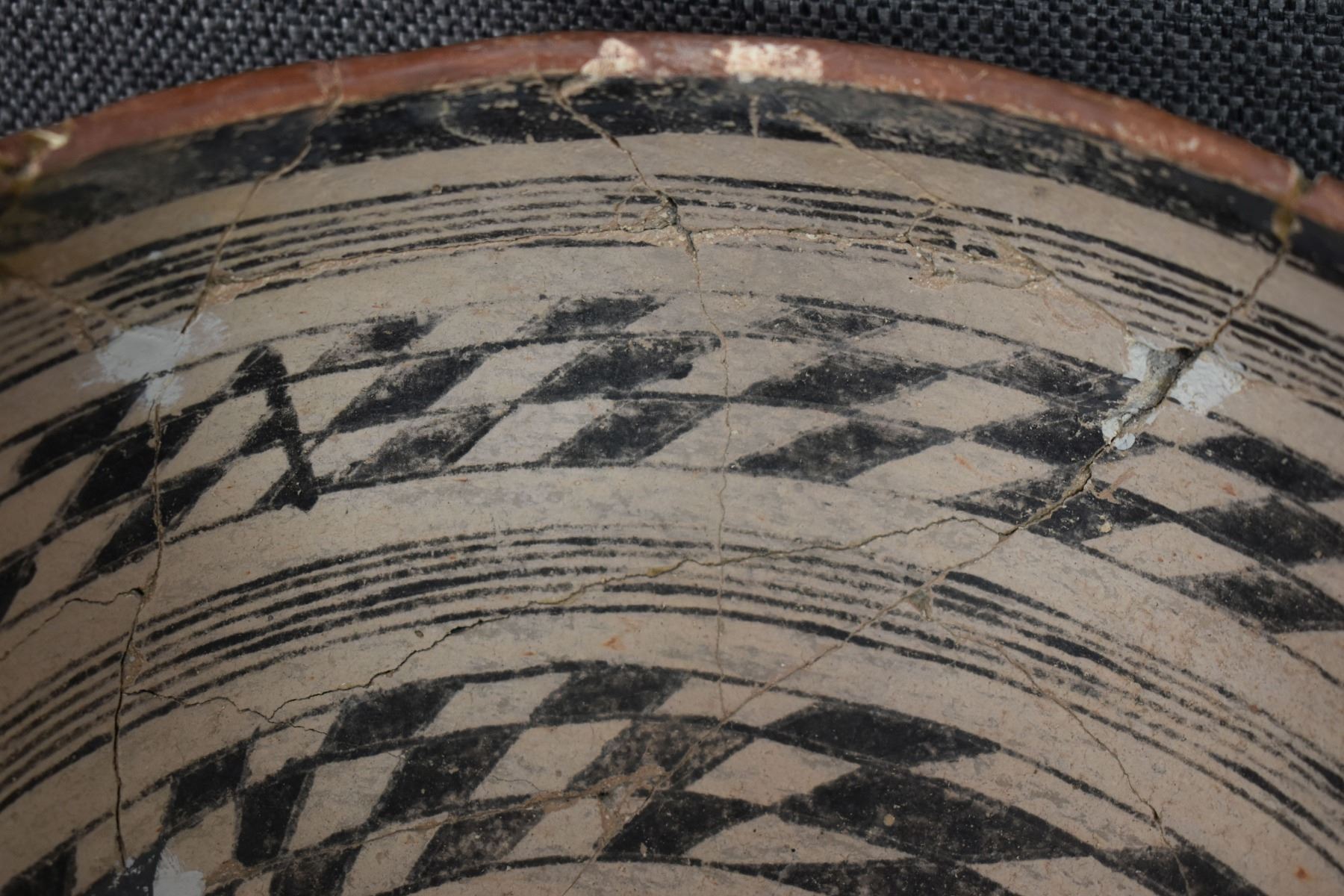 prehistoric Gila, hand coiled with black on white painted checkerboard and banded design. 4.75" x 9.25" has restoration