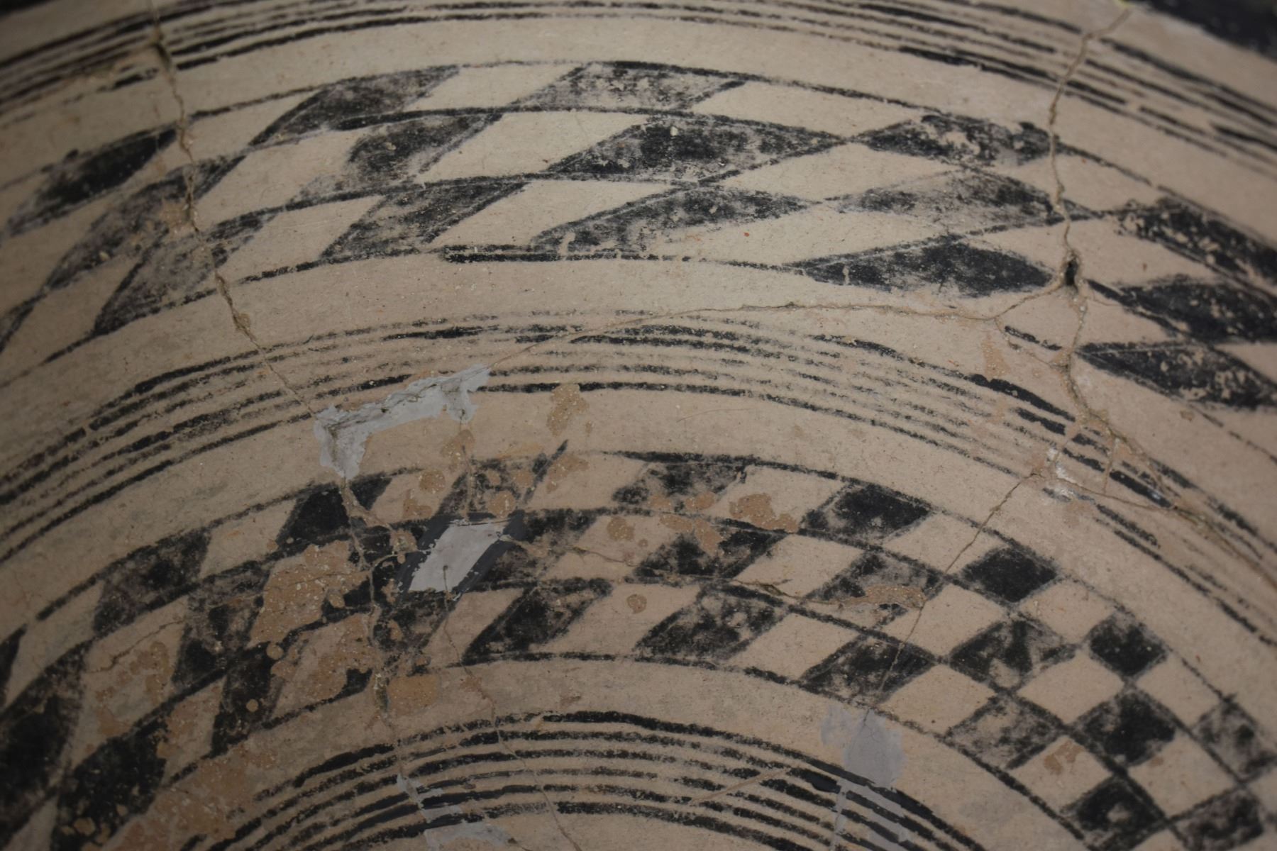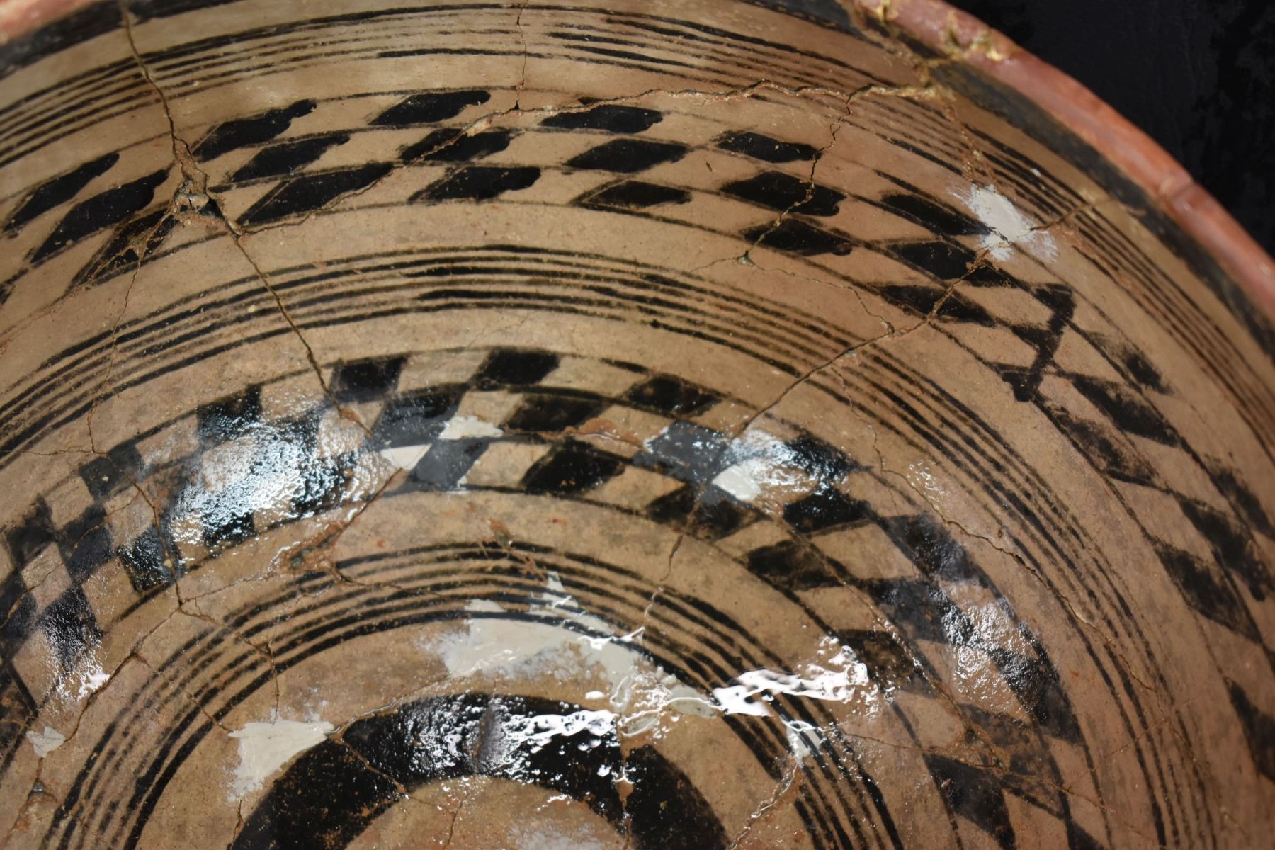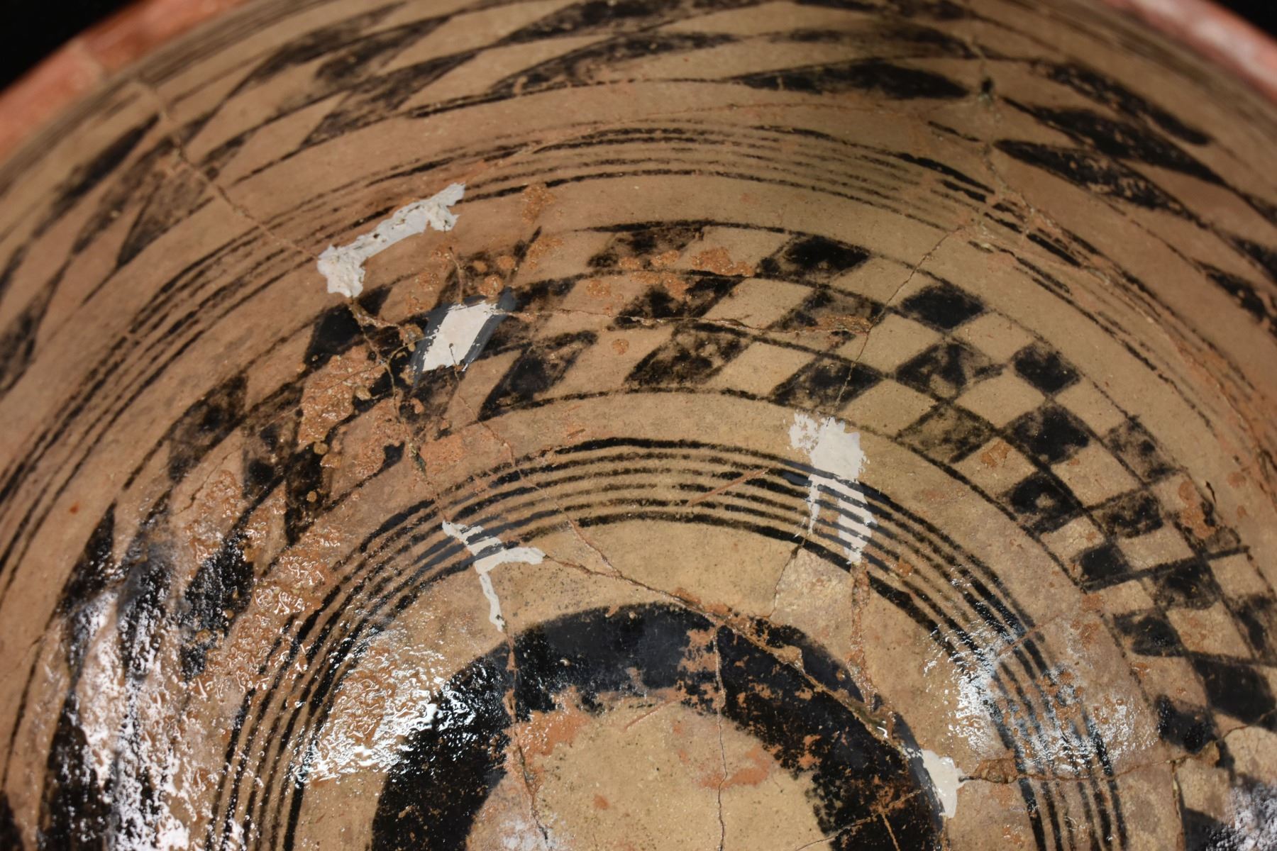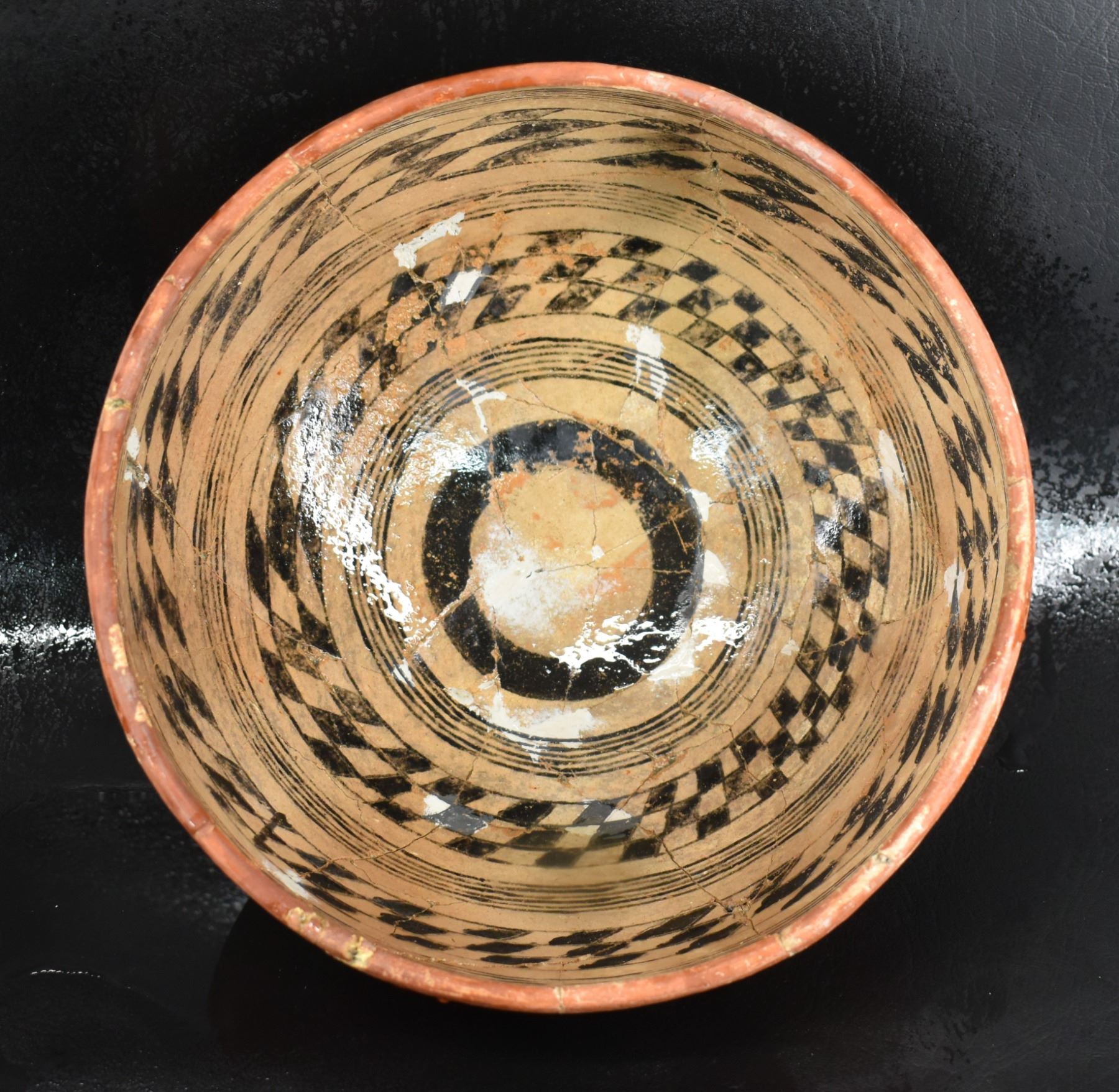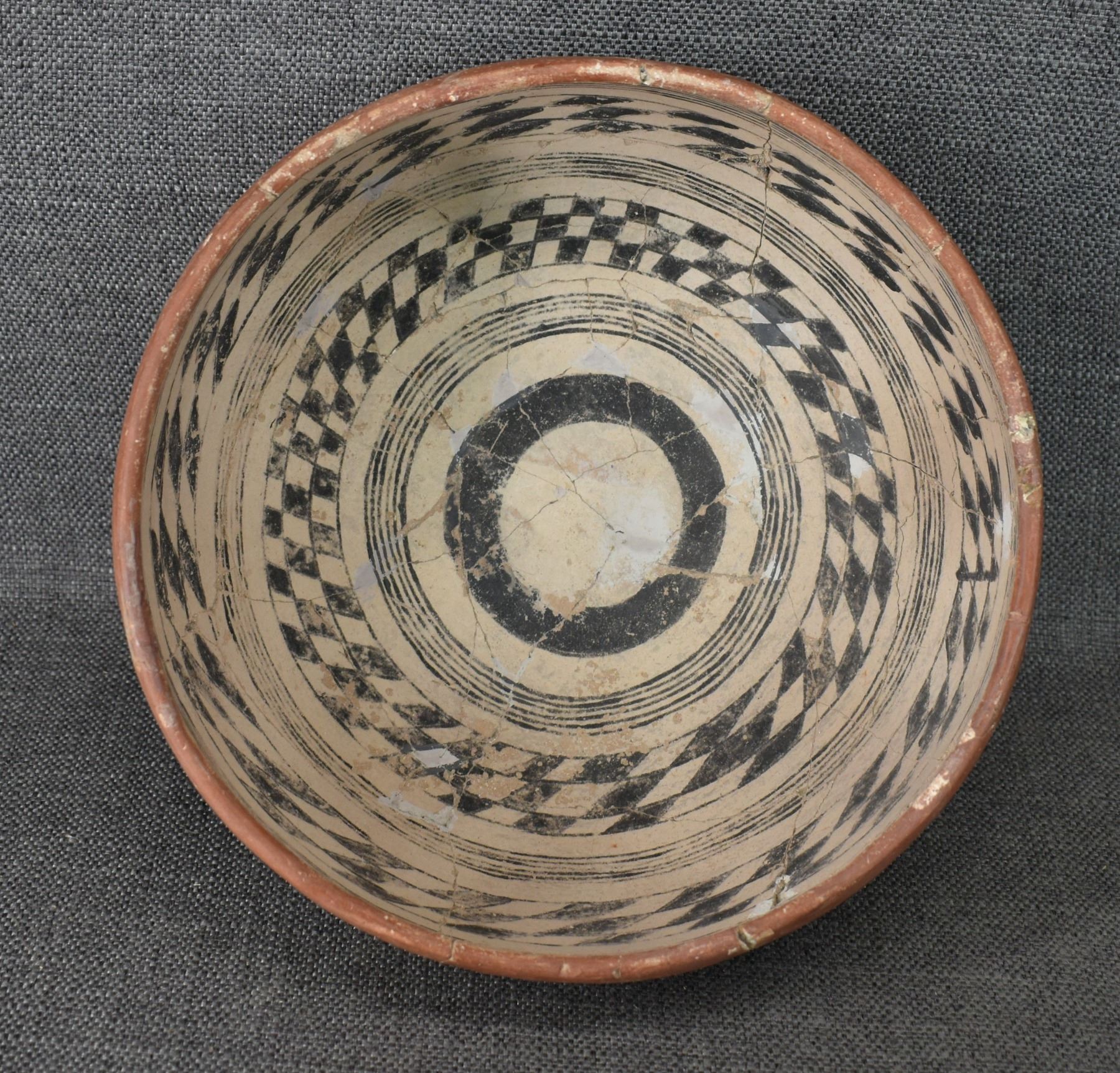 prehistoric Gila, hand coiled with black on white painted checkerboard and banded design. 4.75" x 9.25" has restoration