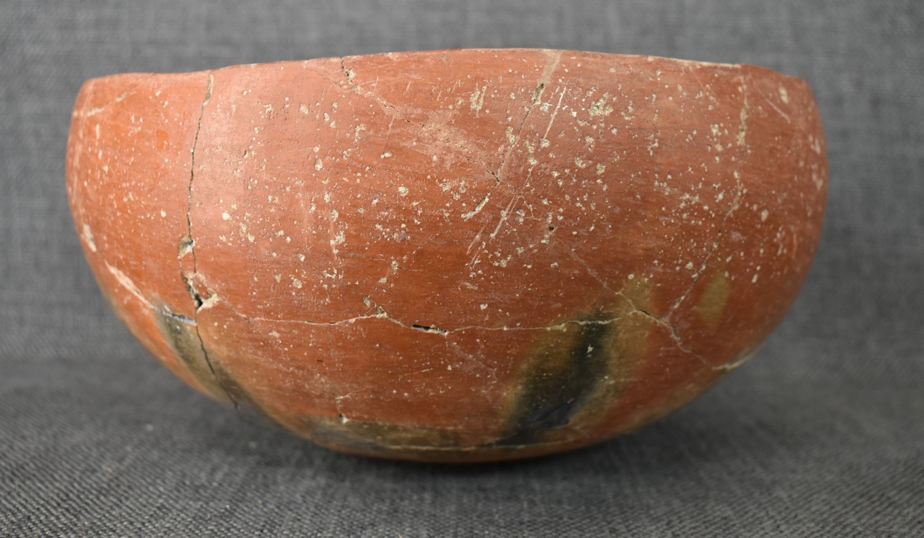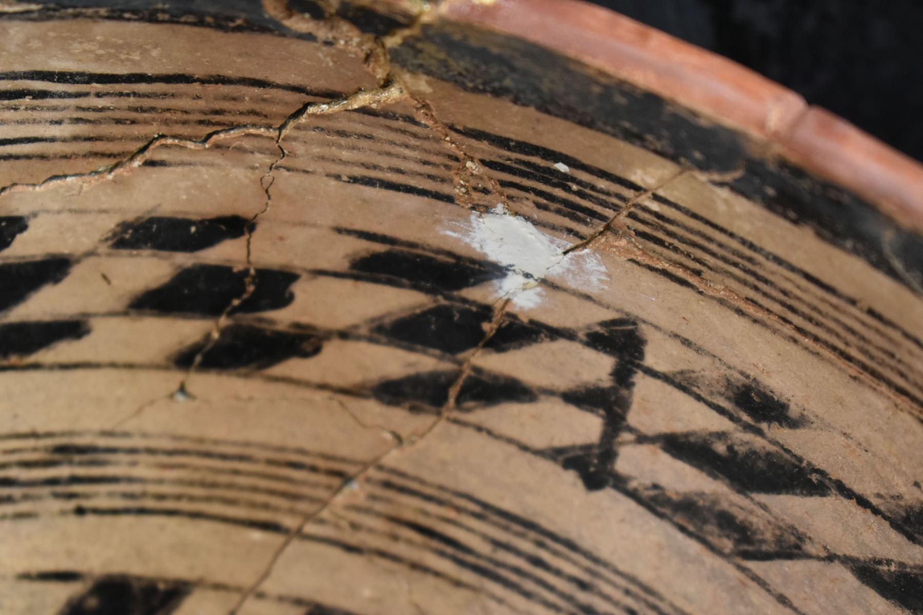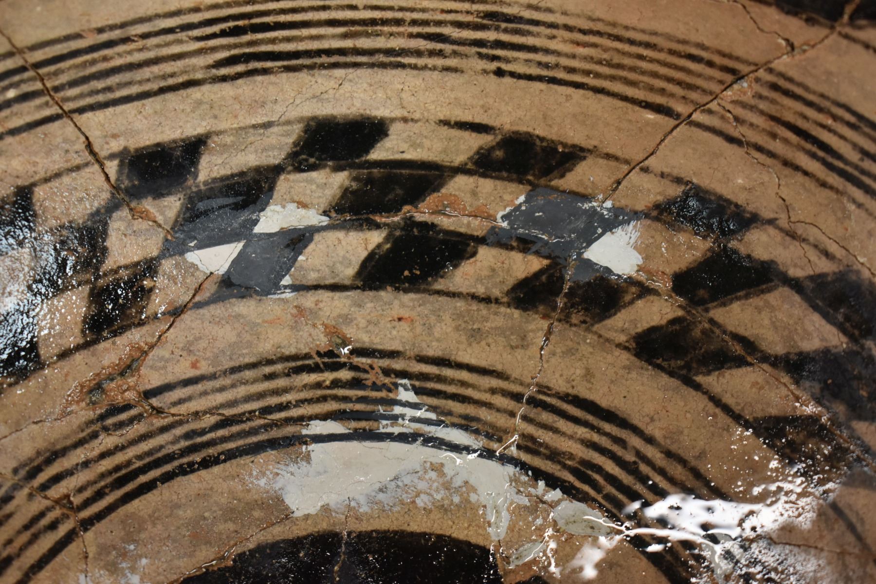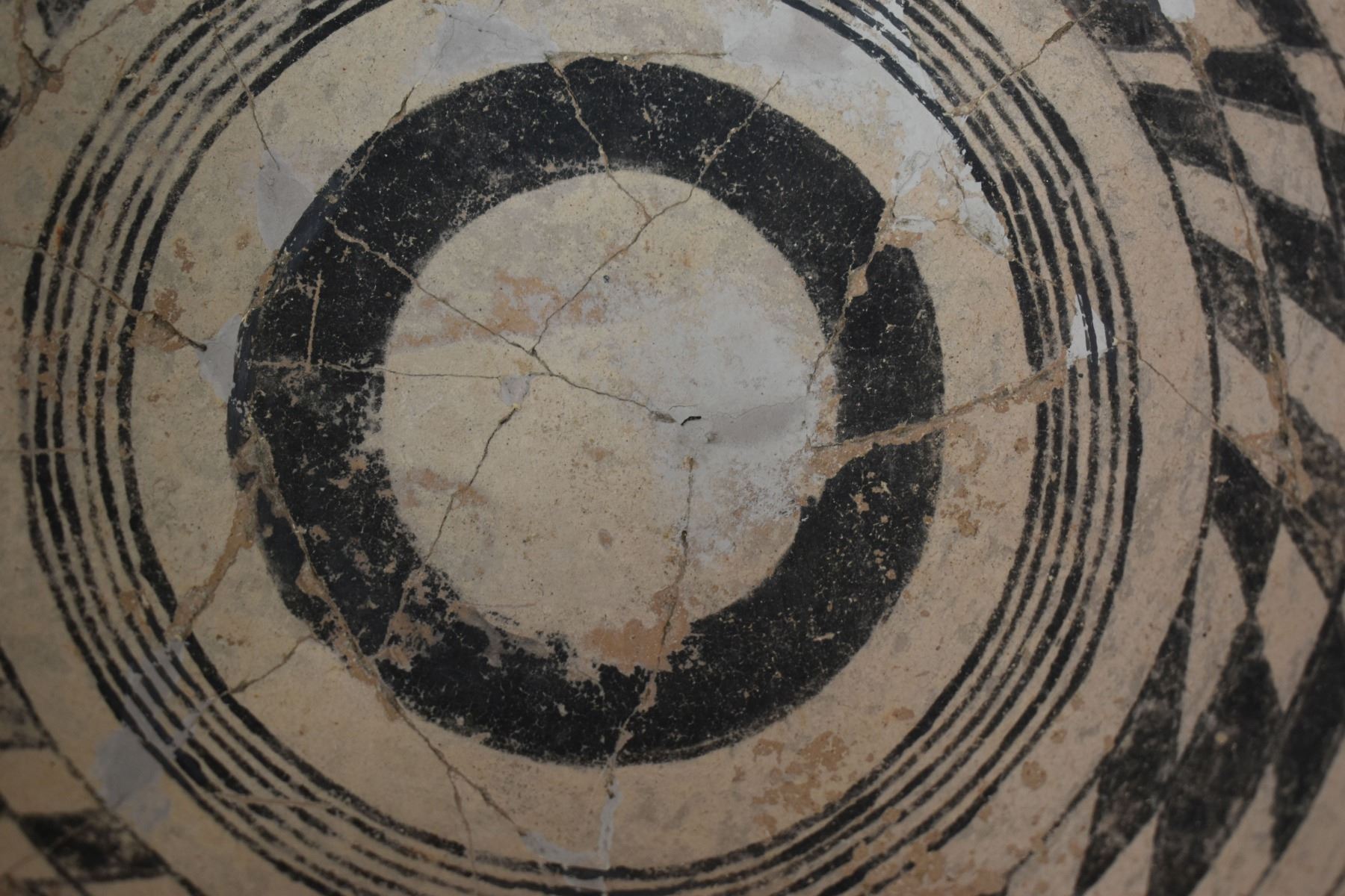 prehistoric Gila, hand coiled with black on white painted checkerboard and banded design. 4.75" x 9.25" has restoration