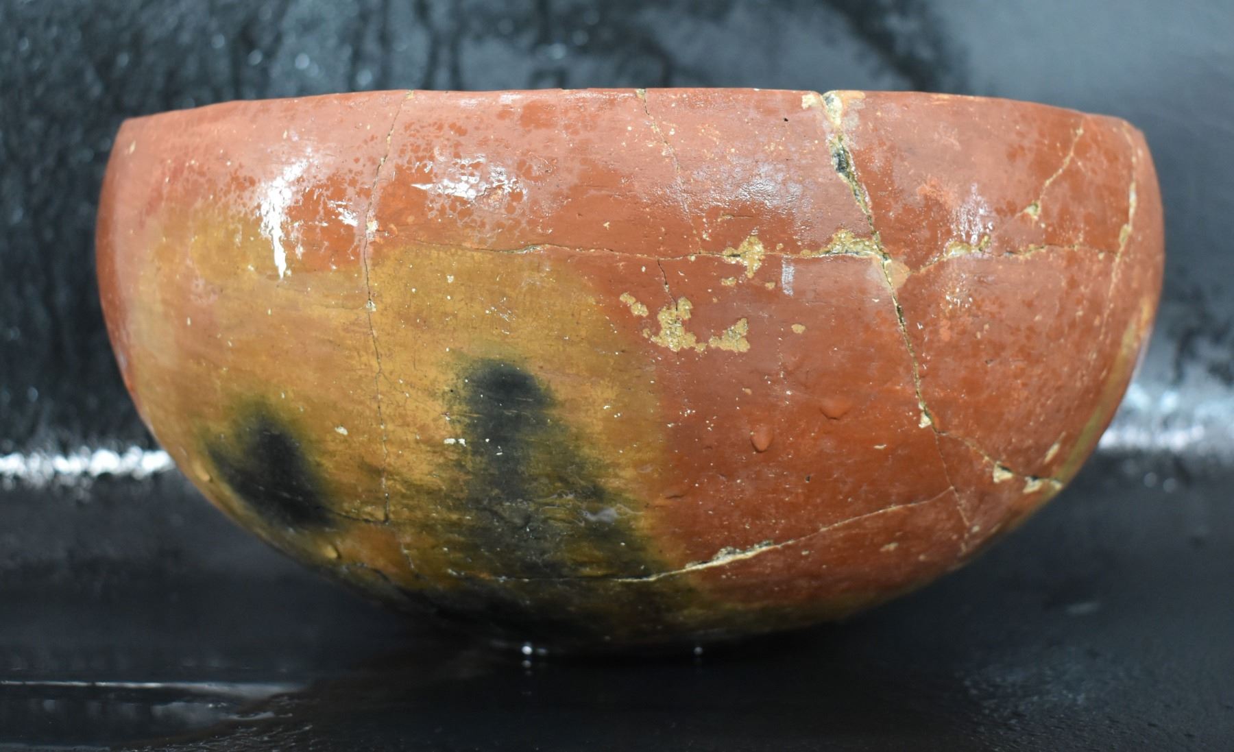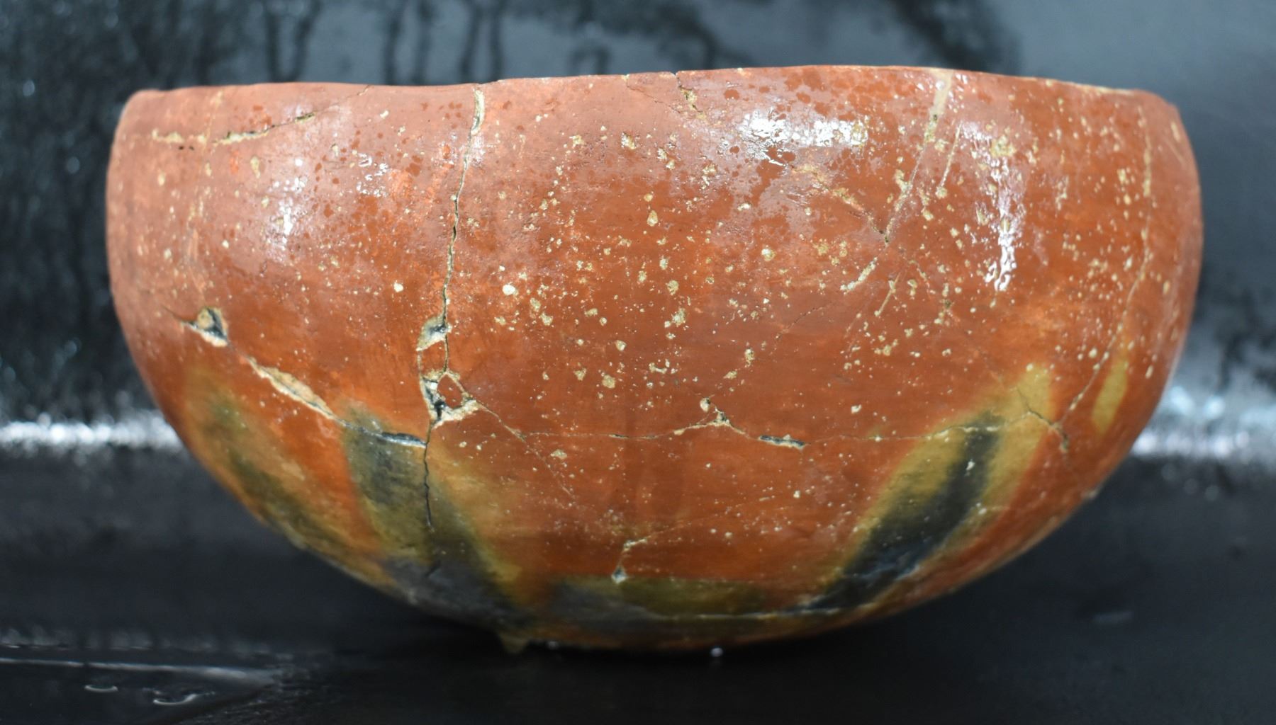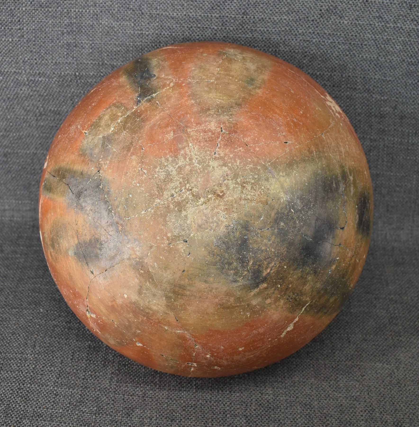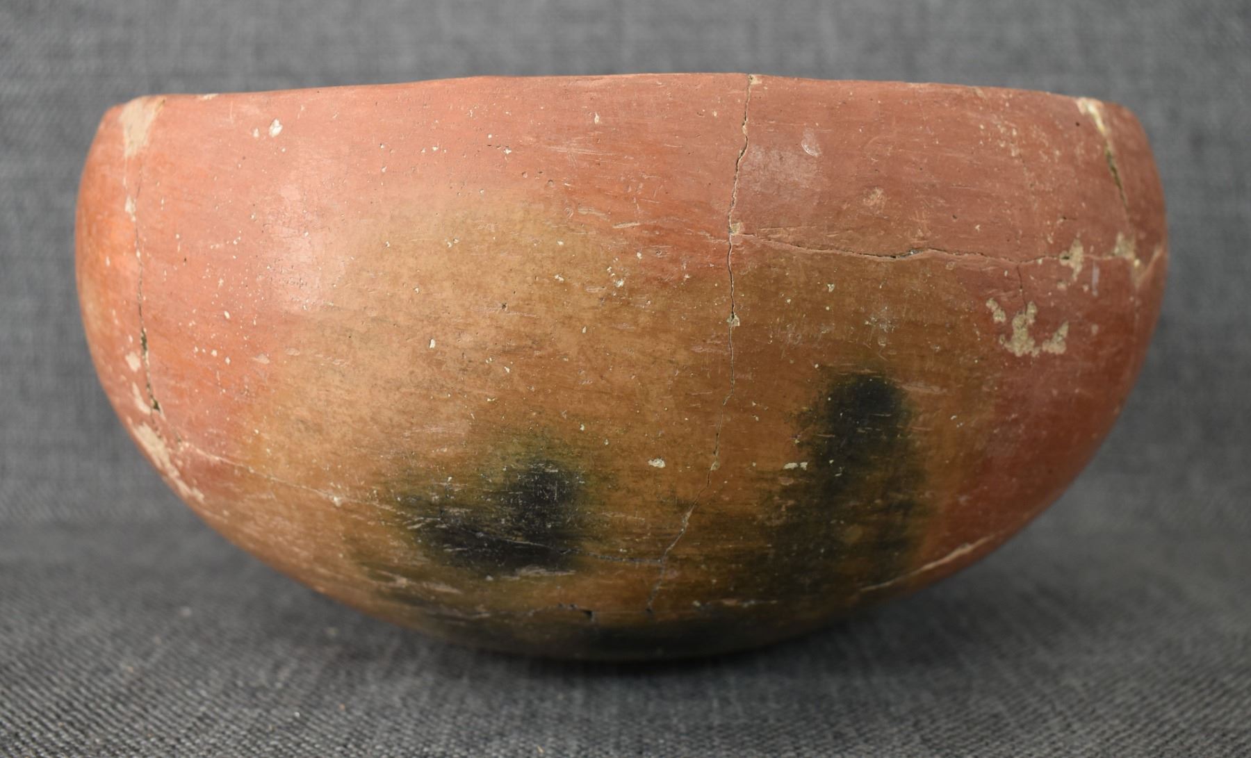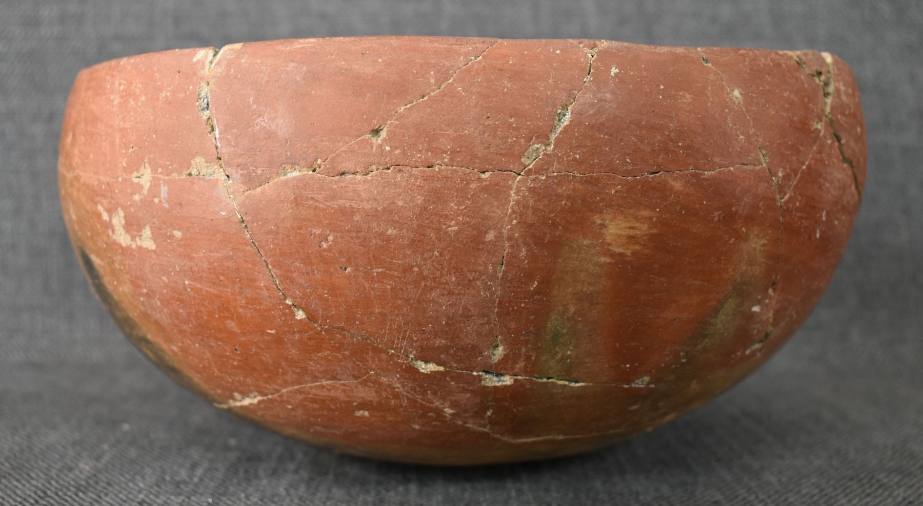 prehistoric Gila, hand coiled with black on white painted checkerboard and banded design. 4.75" x 9.25" has restoration