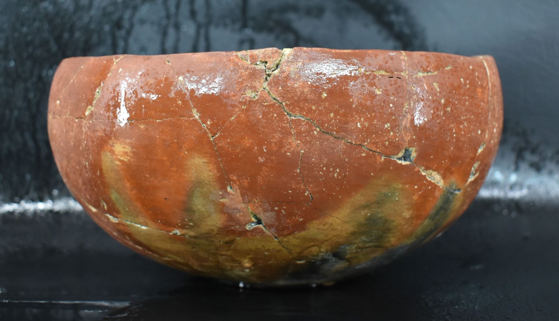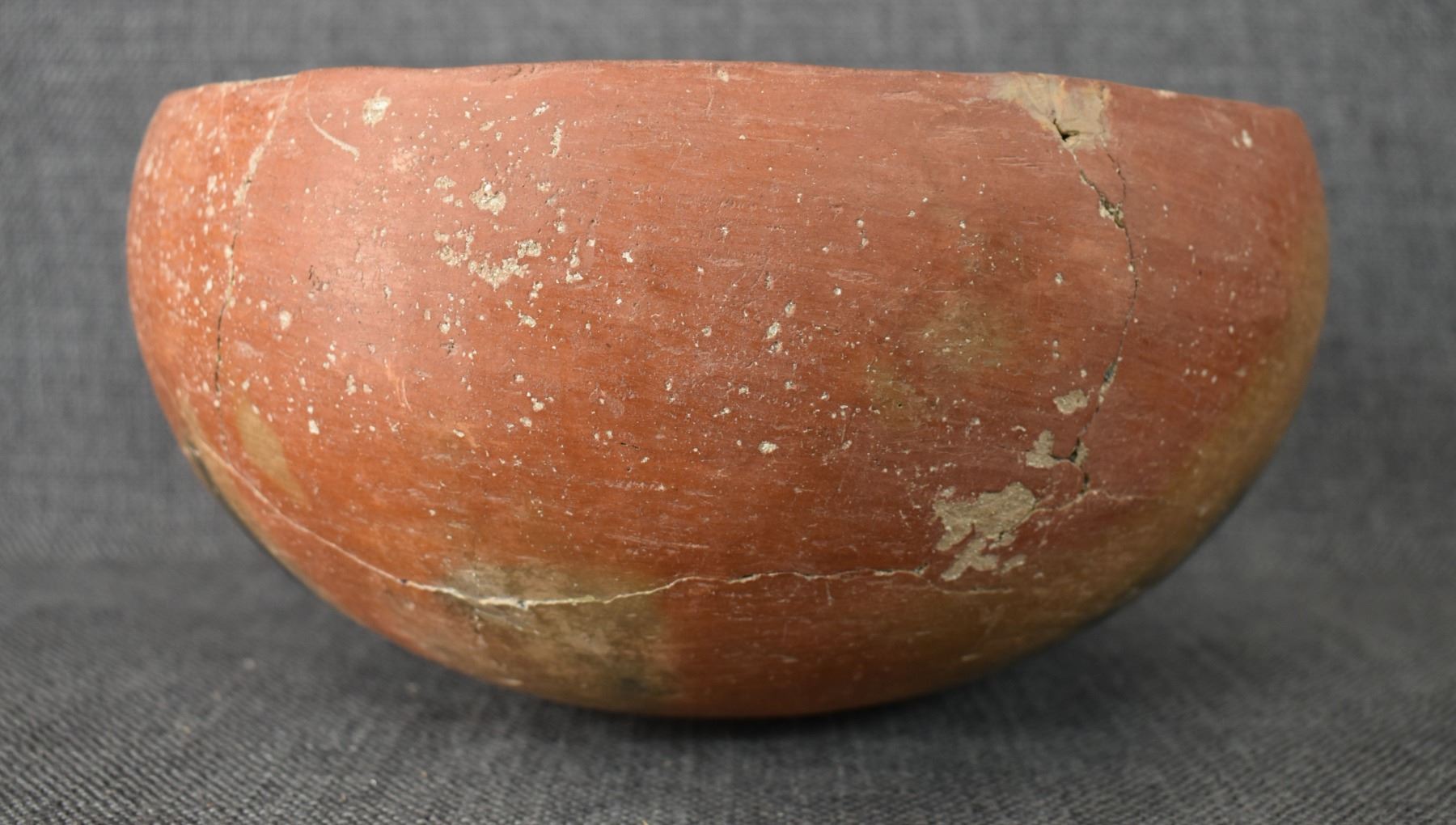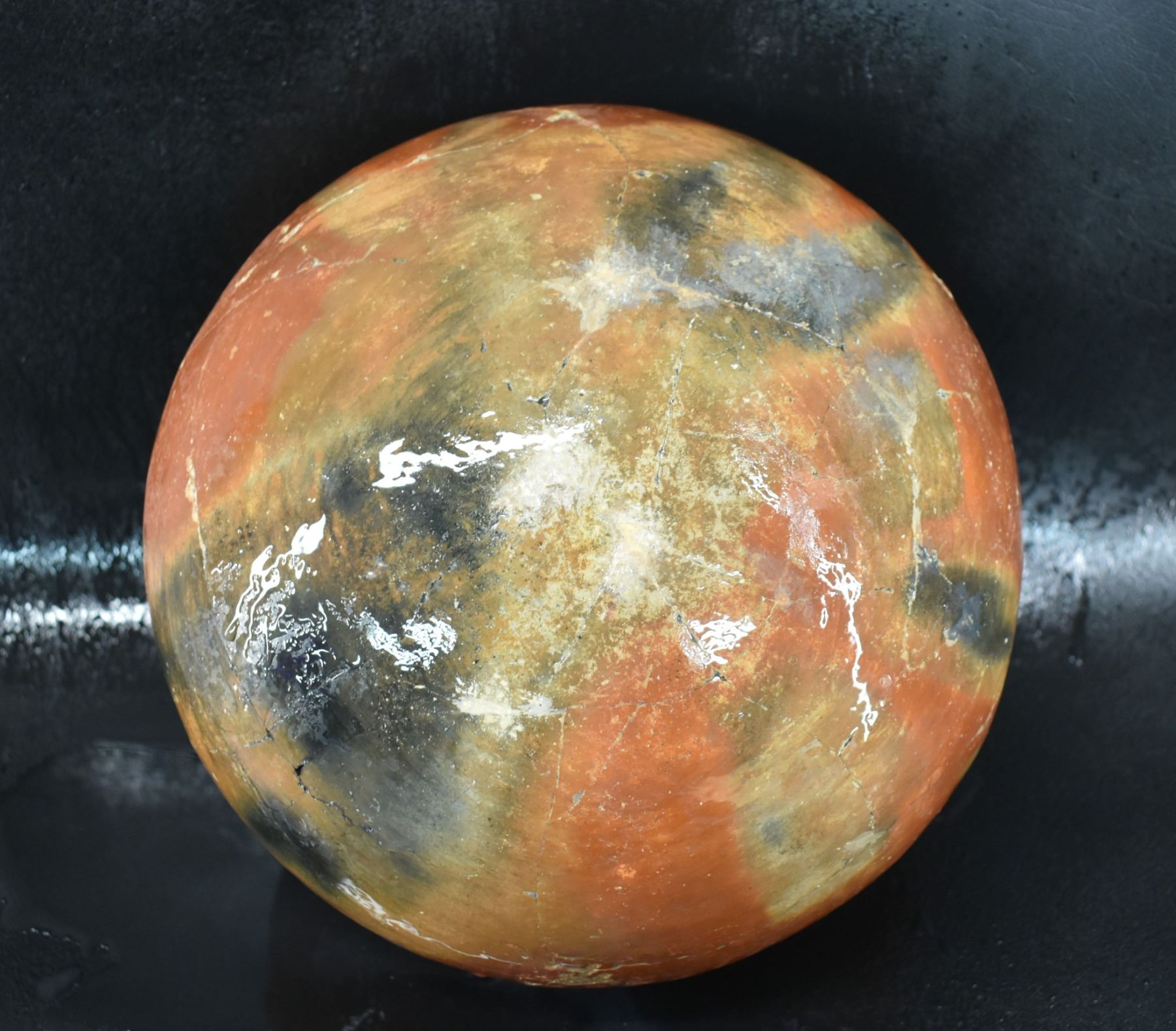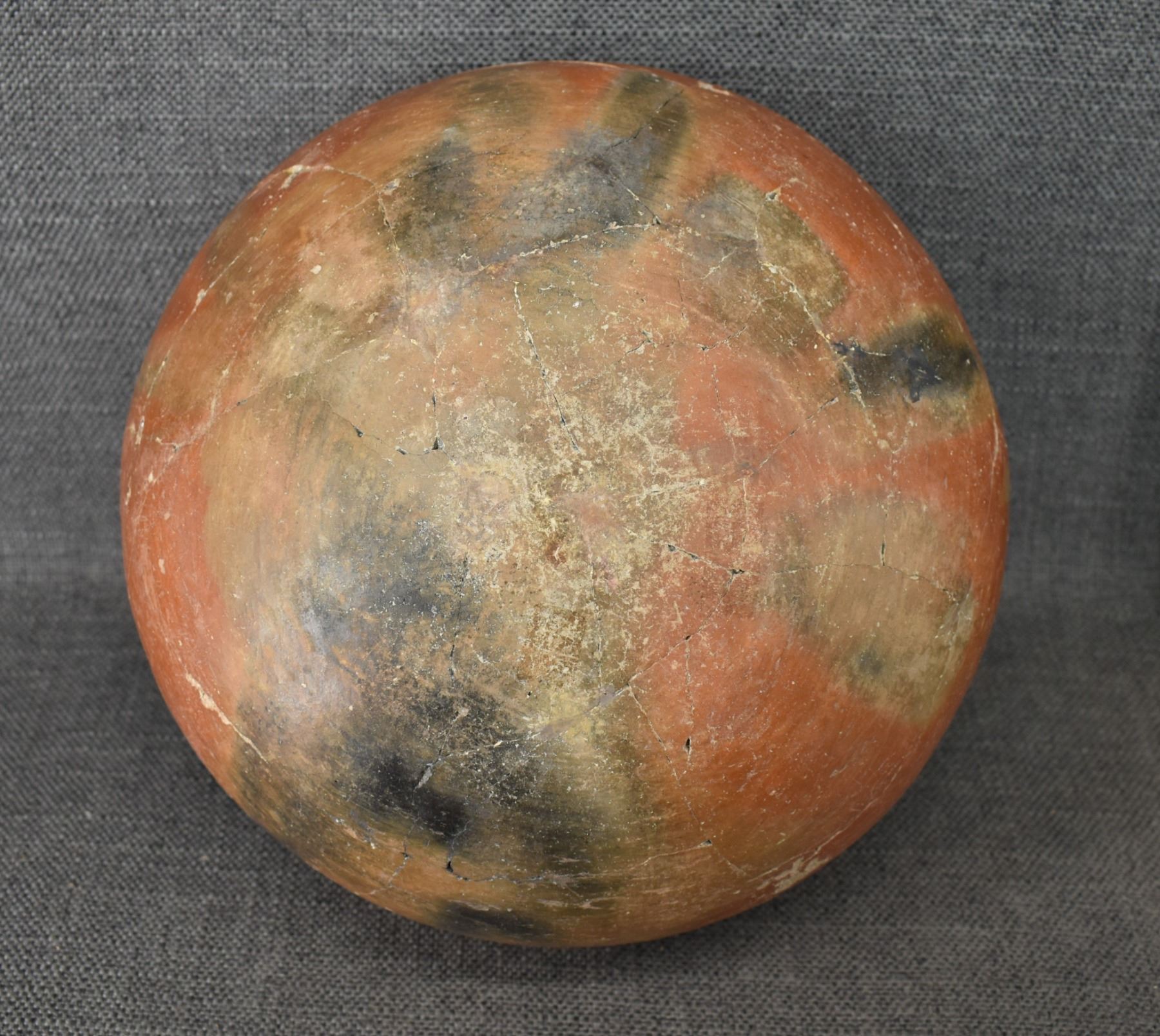 prehistoric Gila, hand coiled with black on white painted checkerboard and banded design. 4.75" x 9.25" has restoration