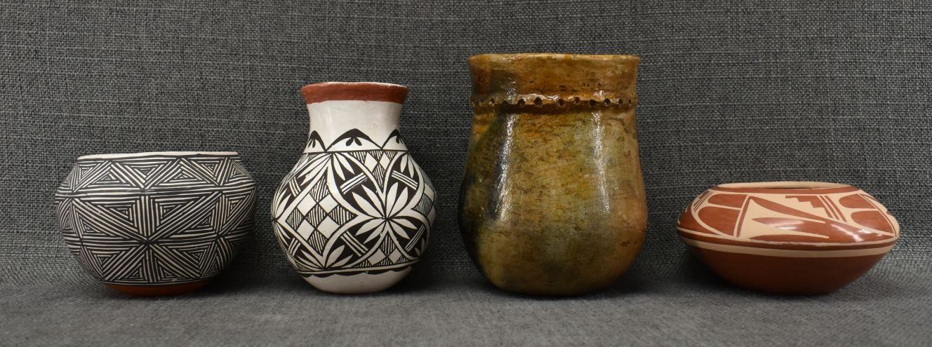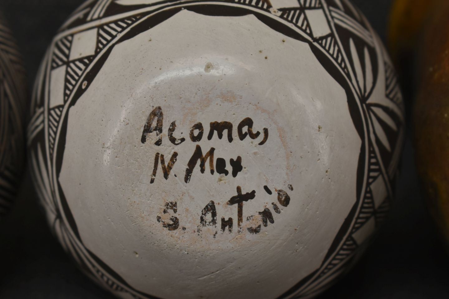 1980-90's Acoma, hand coiled with fine line painted design signed S Antonio and M.S. Juanico. Jemez hand coiled and painted signed G Sandia. Navajo pot with raised design. Largest 5.25" x 4.25"
