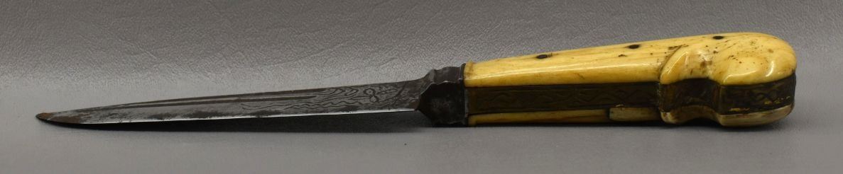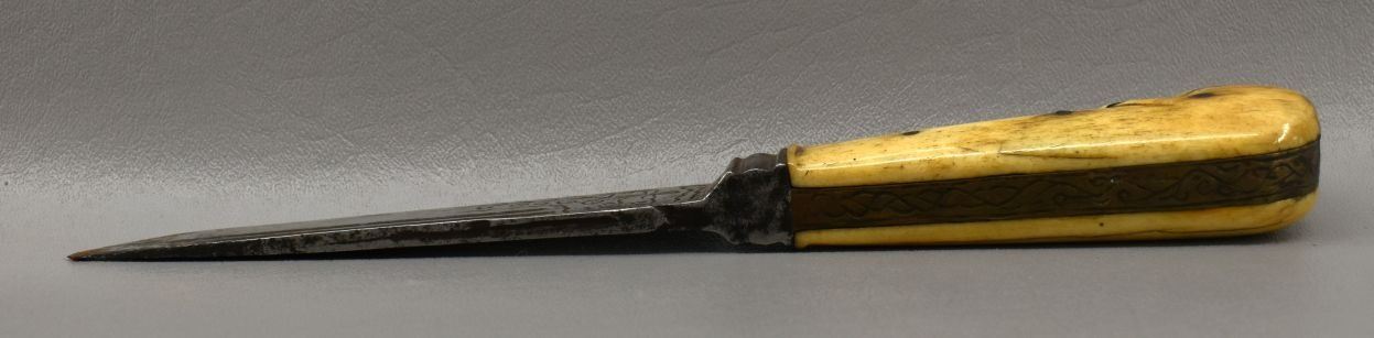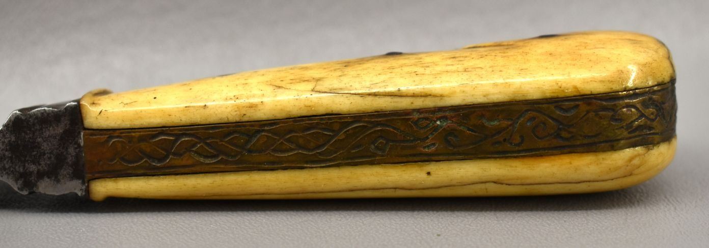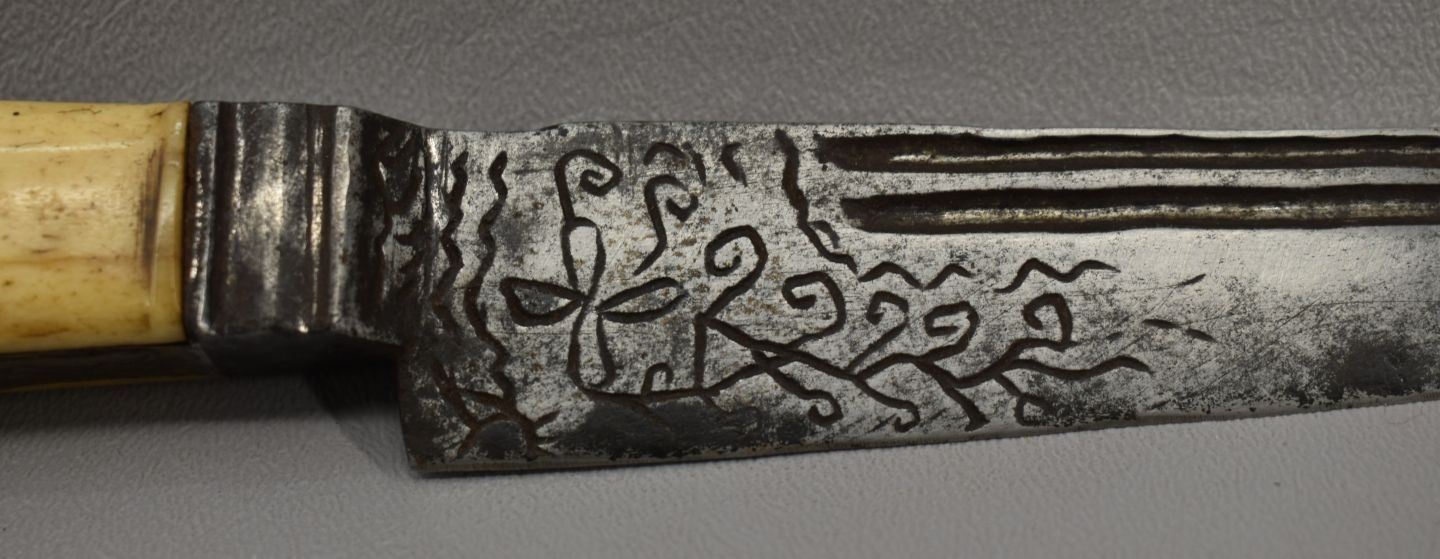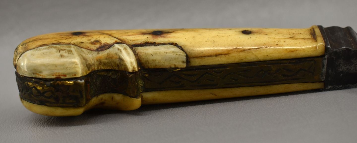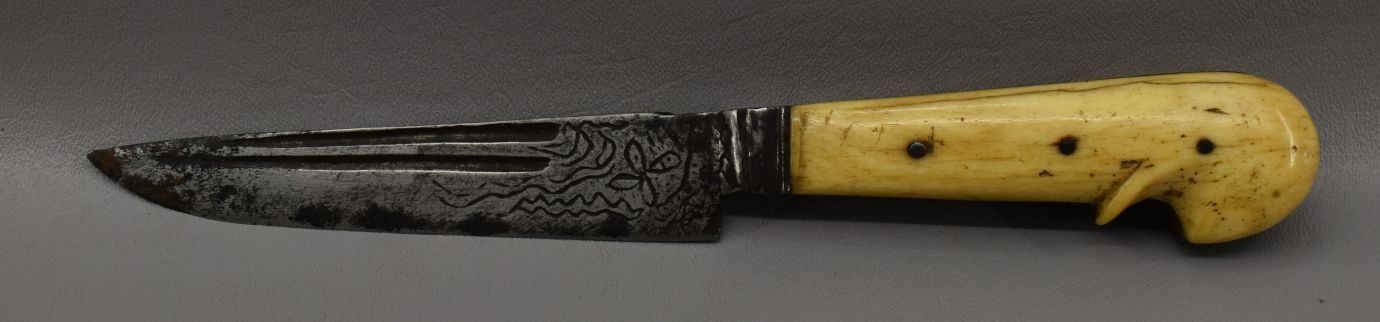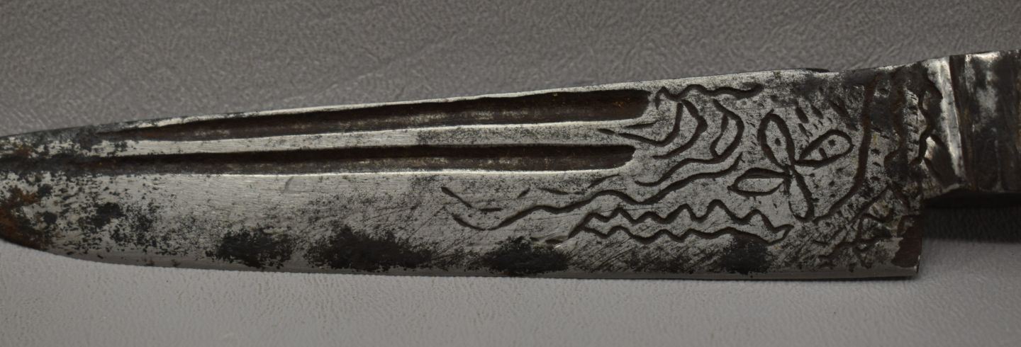 20th century, hand made knife with engraved design with bone handle 9.75" long