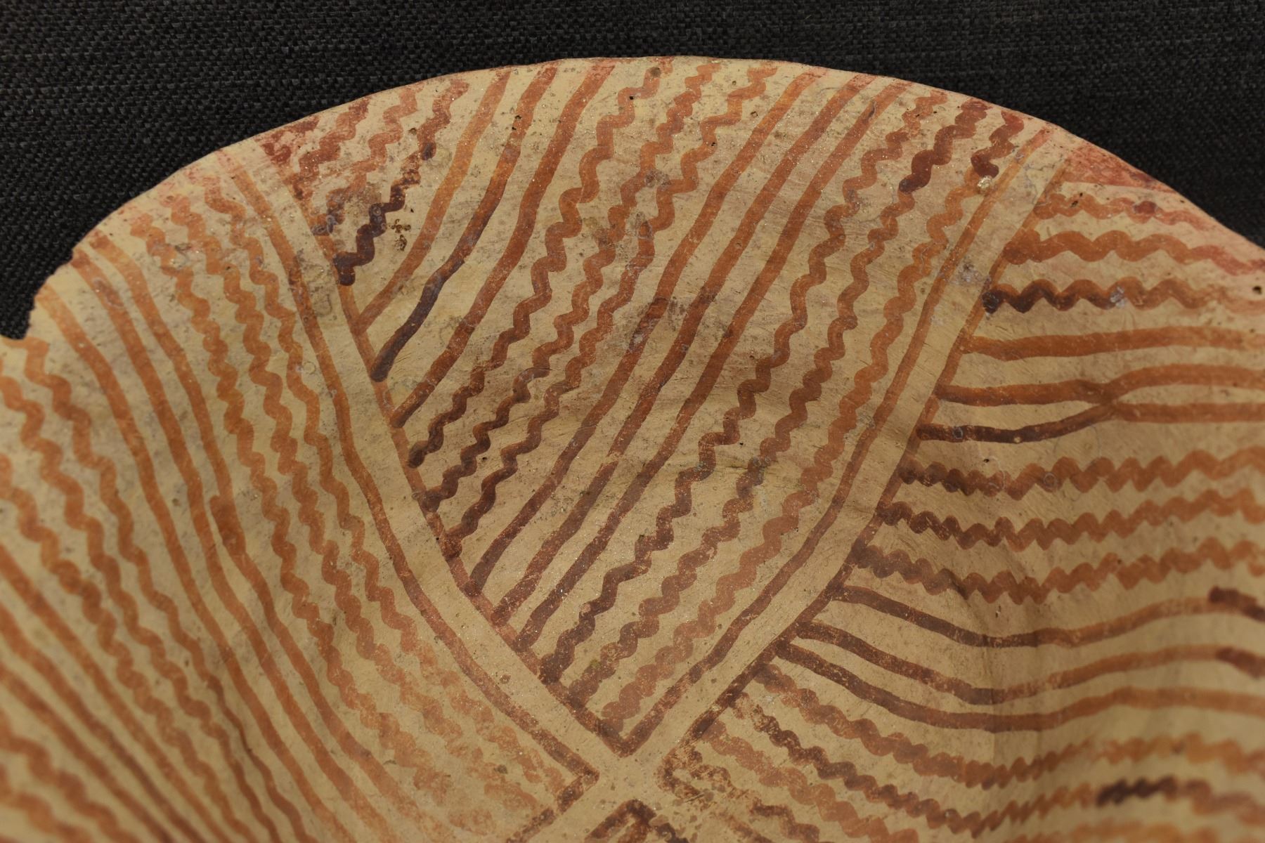prehistoric Hohokam, hand coiled and painted red on buff design. 5'' x 10''. has chip and minor restoration