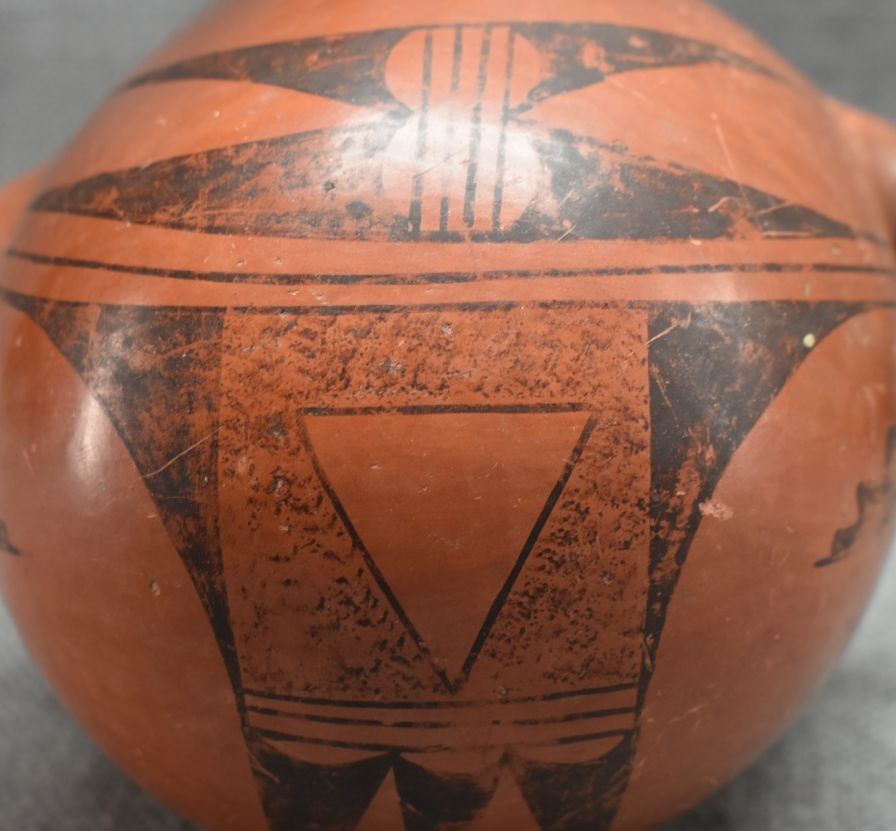 1960's Hopi. Hand coiled and painted pottery canteens 5.5'' x 4'' and 4'' x 3.5'' x 2.5''. Acoma hand painted polychrome design 4'' x 3.5'' x 2.5''