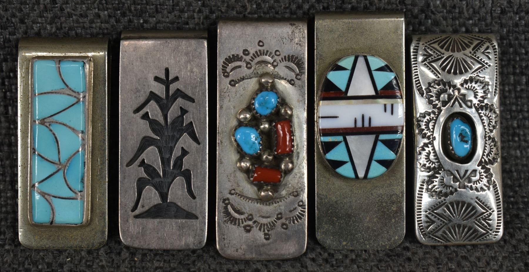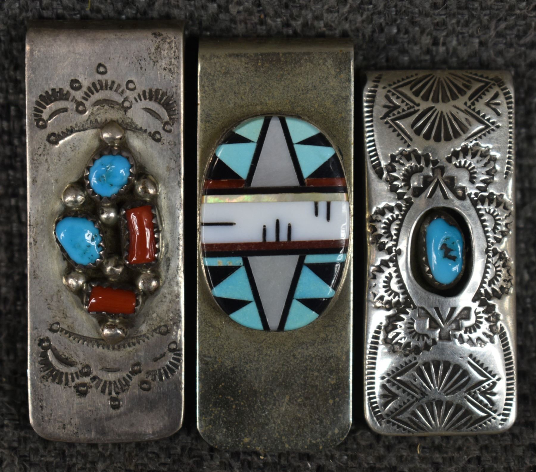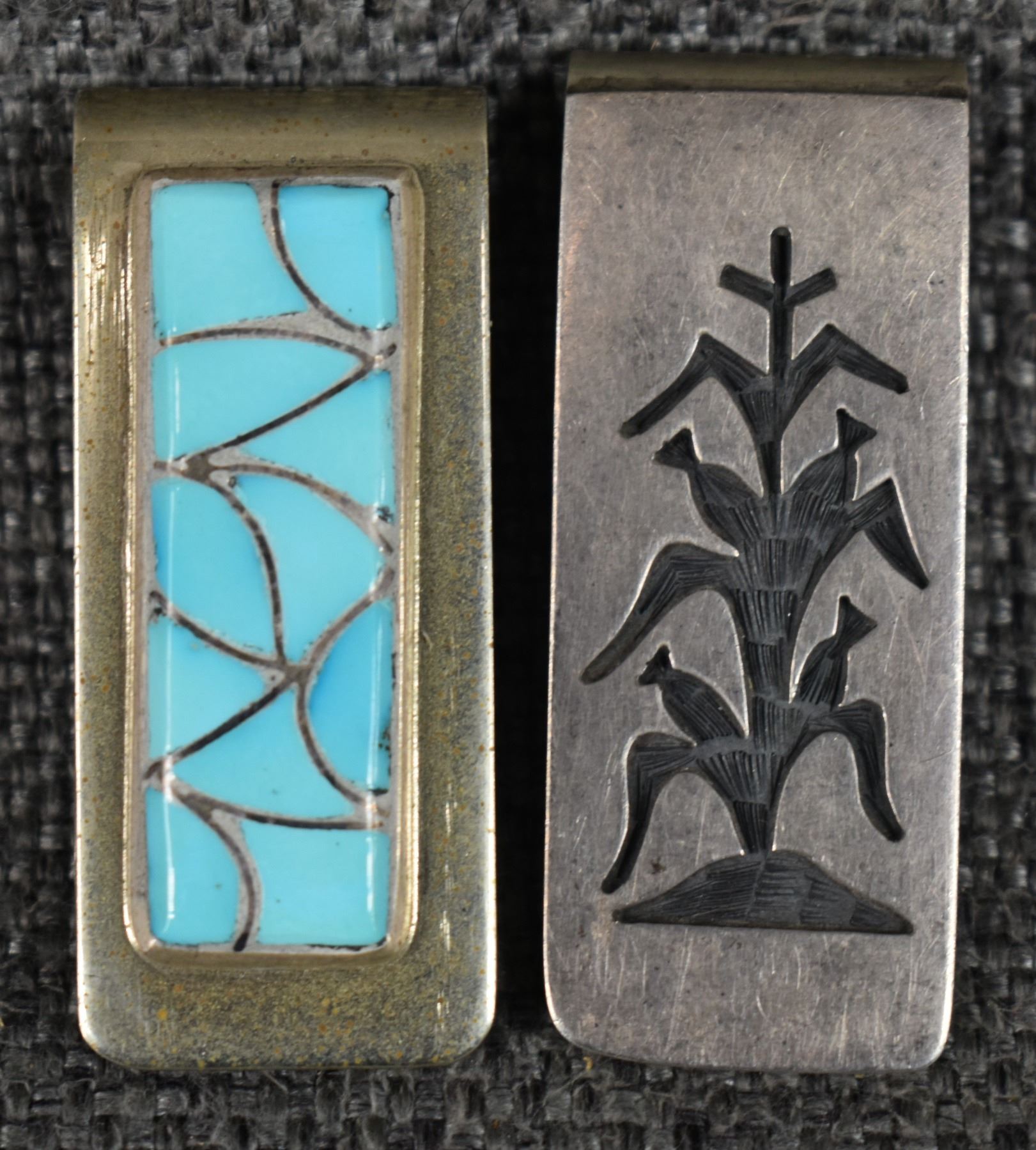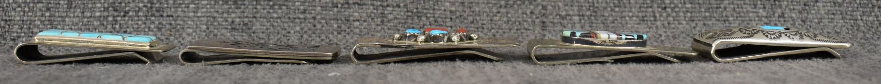 1970's Hopi and Navajo. Sterling silver turquoise and coral money clips. 2'' x .75''. Total weight 93 grams
