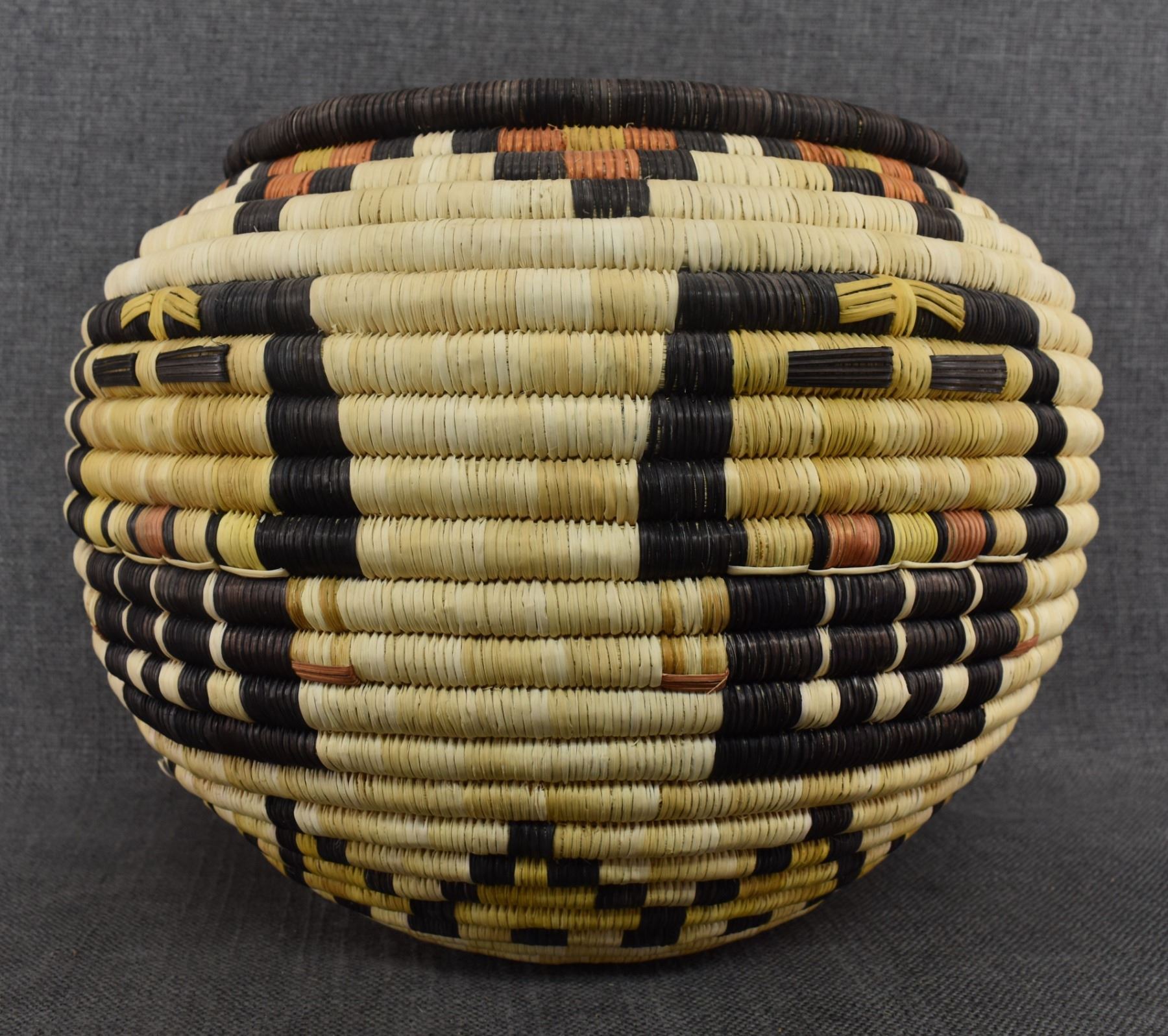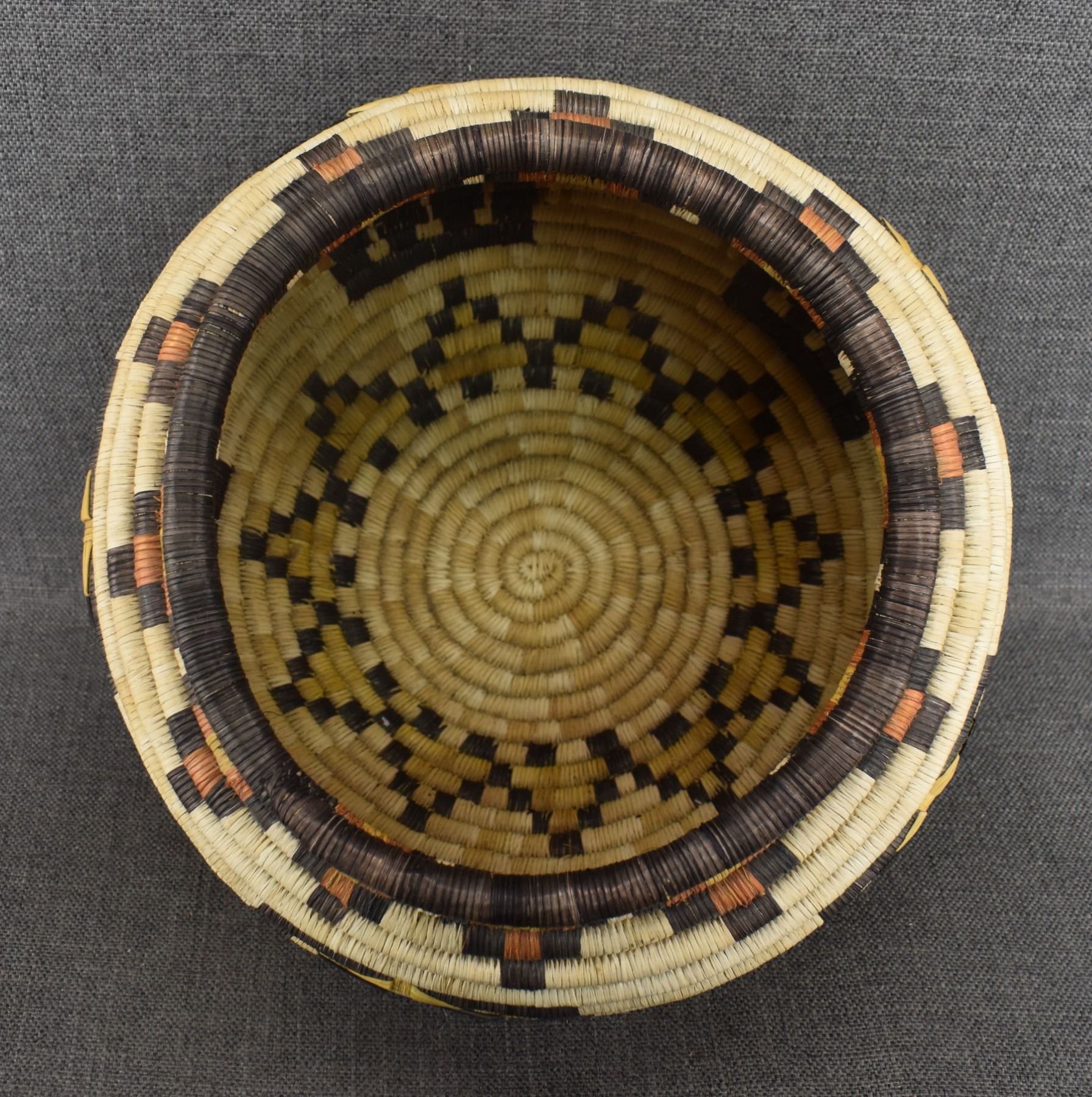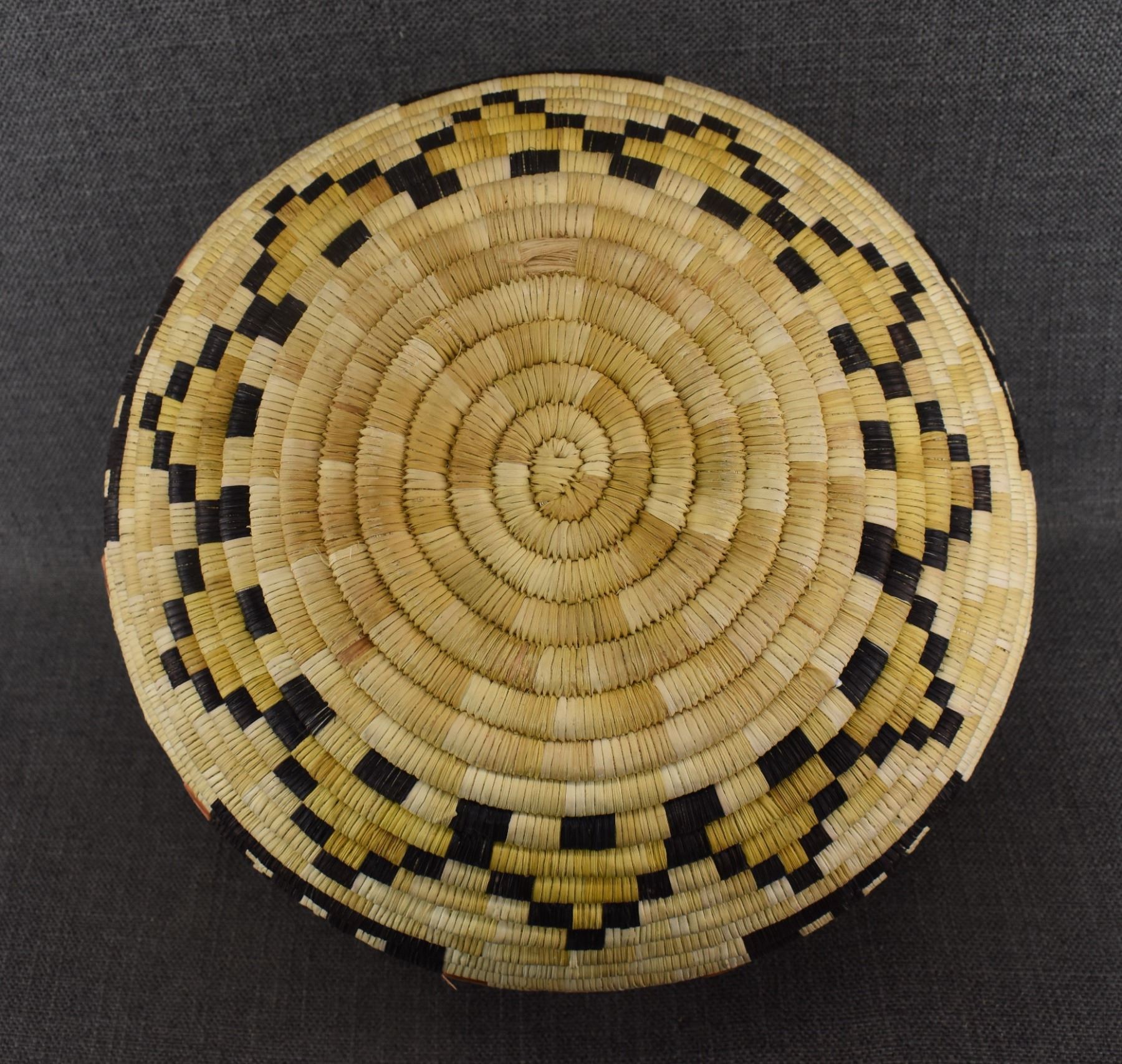 1970's Hopi. Hand woven polychrome kachina face design, second mesa coil basket. 9'' x 12''