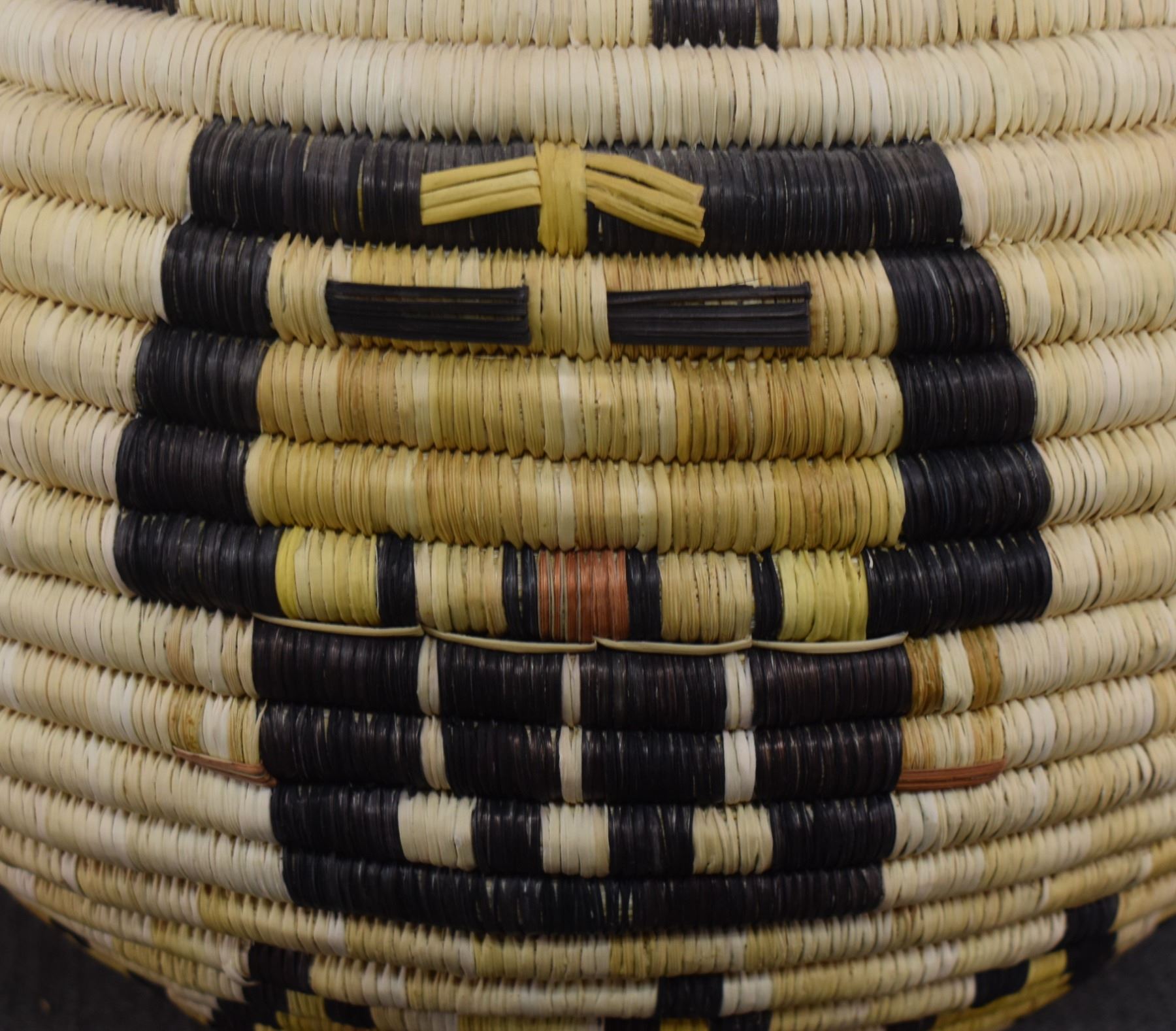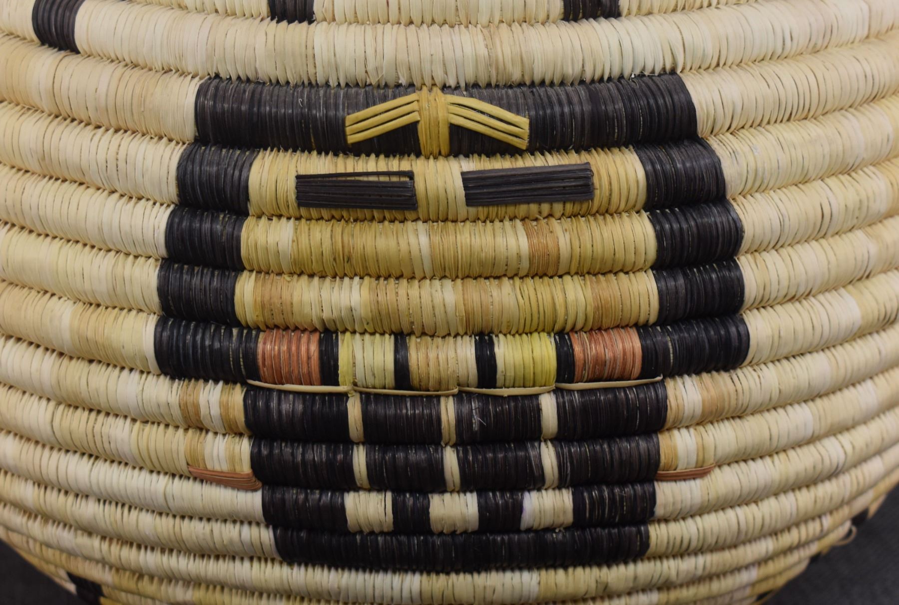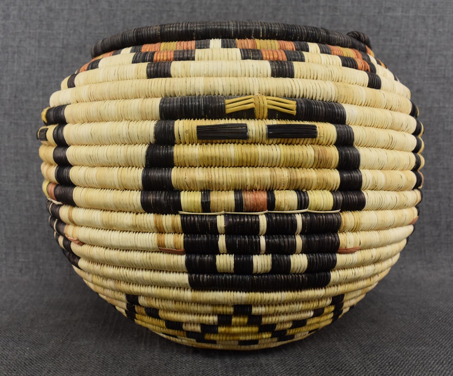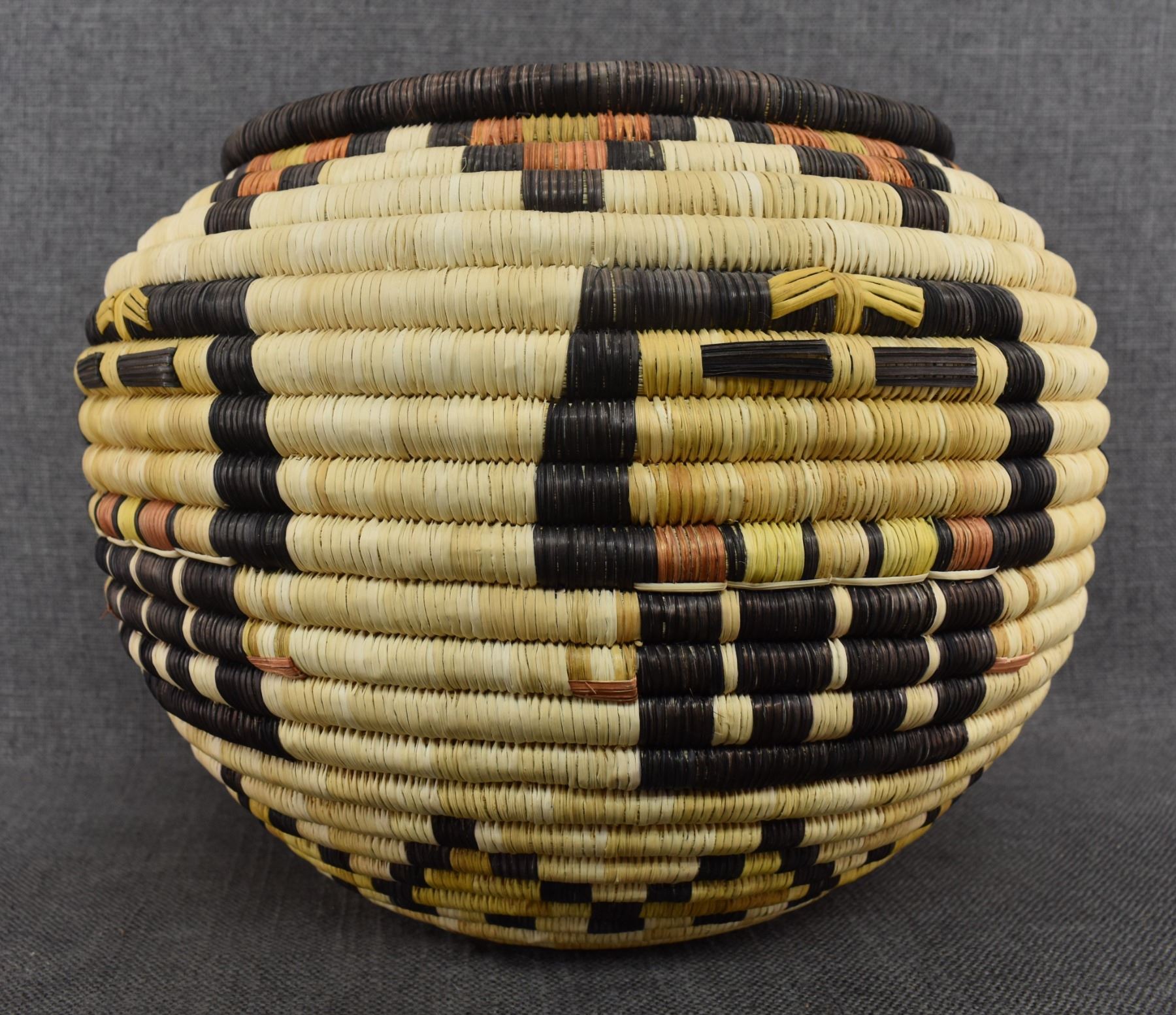 1970's Hopi. Hand woven polychrome kachina face design, second mesa coil basket. 9'' x 12''