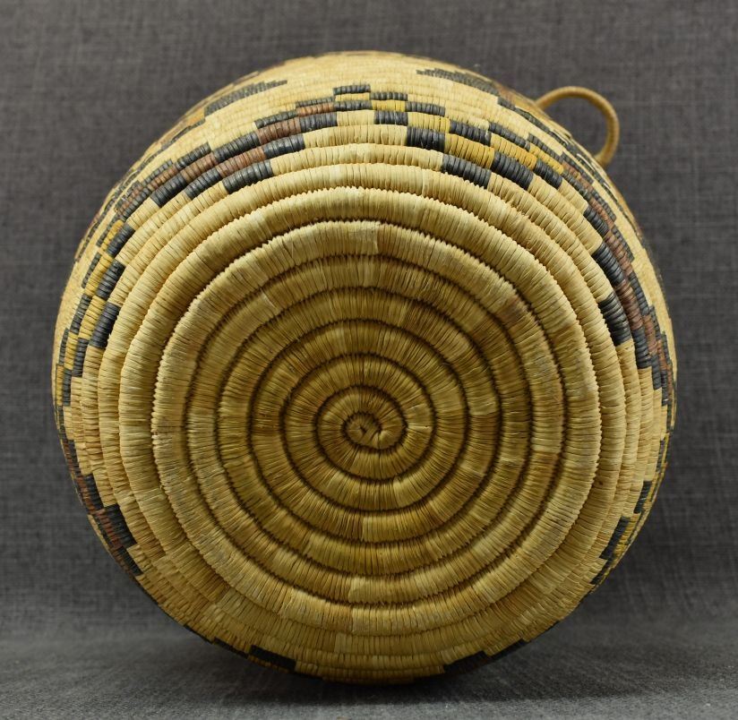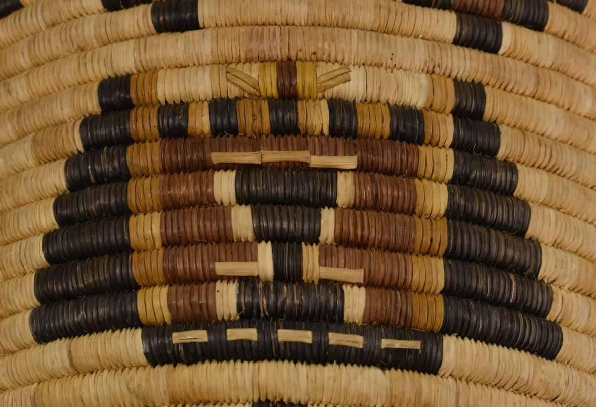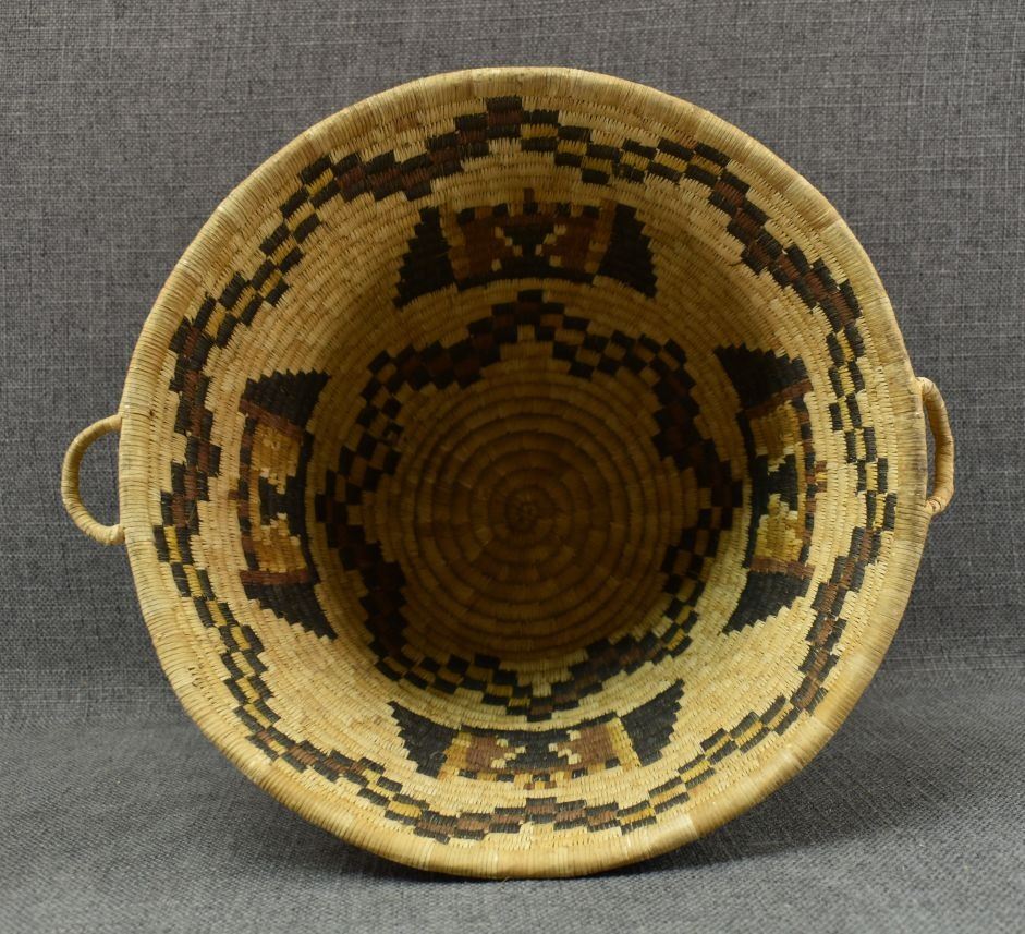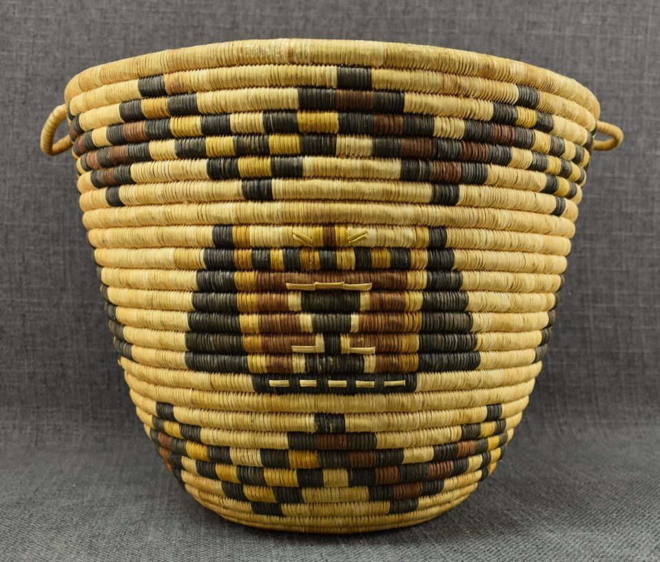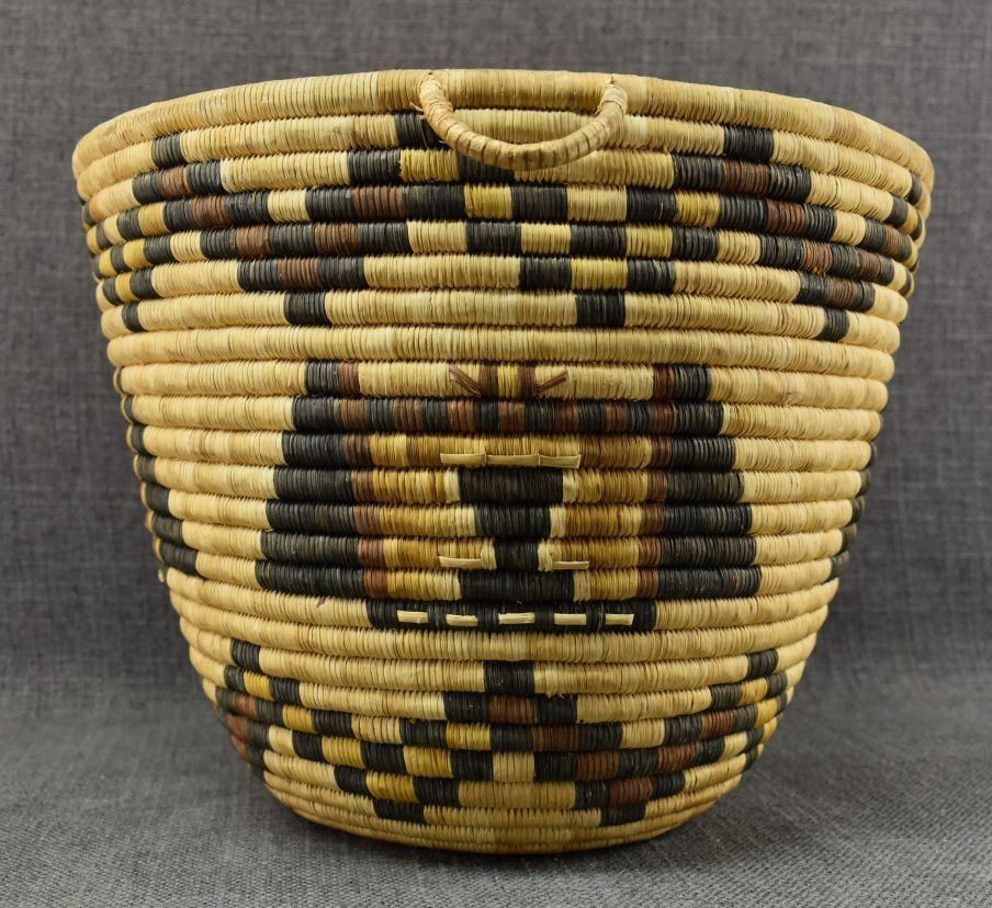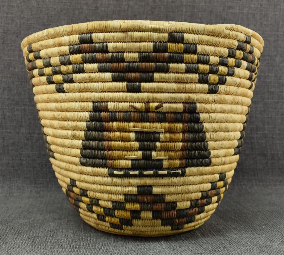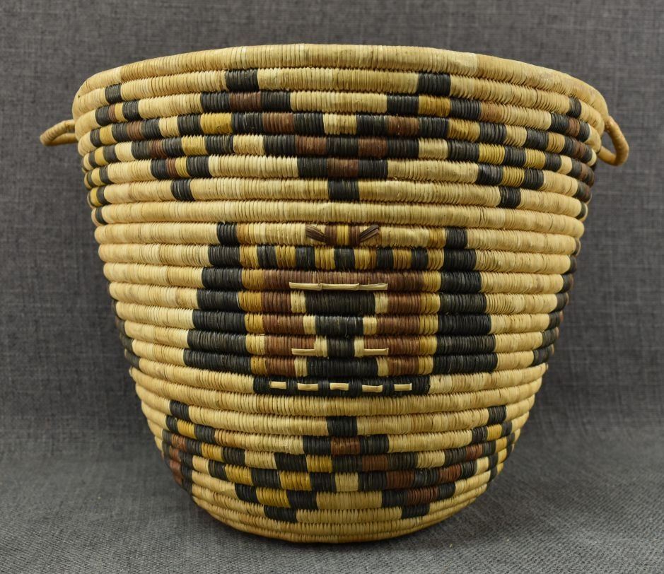 1970-80's Hopi 2nd Mesa, hand woven polychrome kachina face design 8.5" x 11" excluding handles