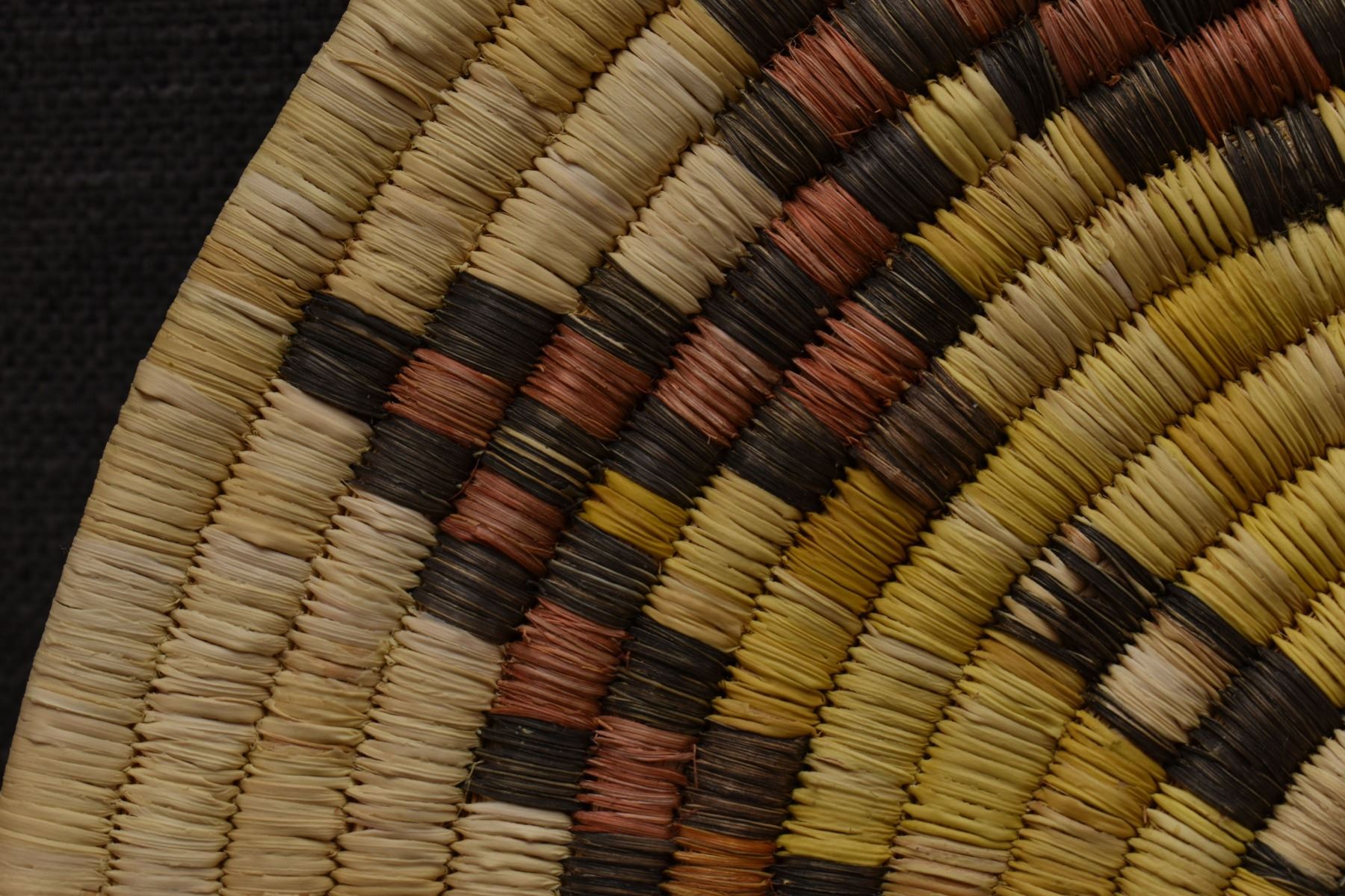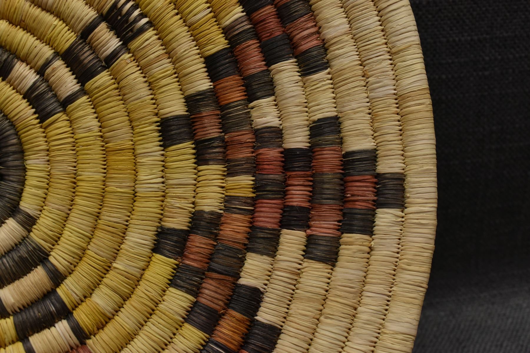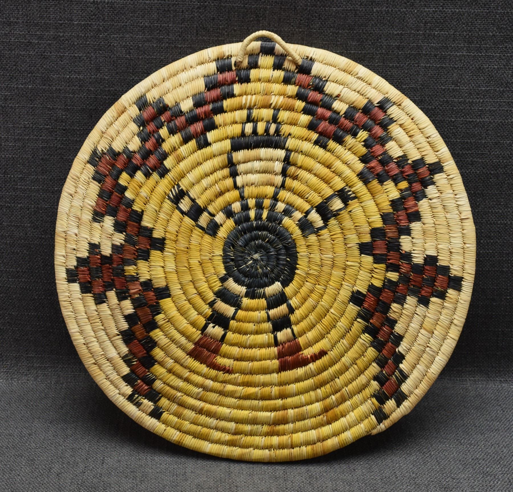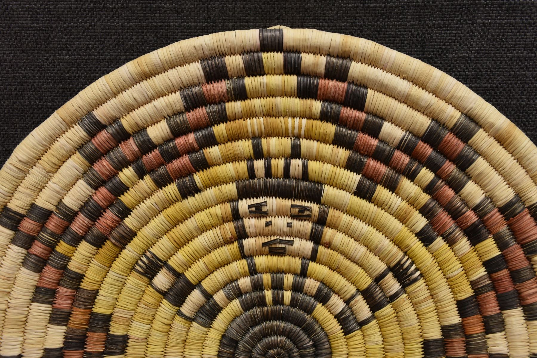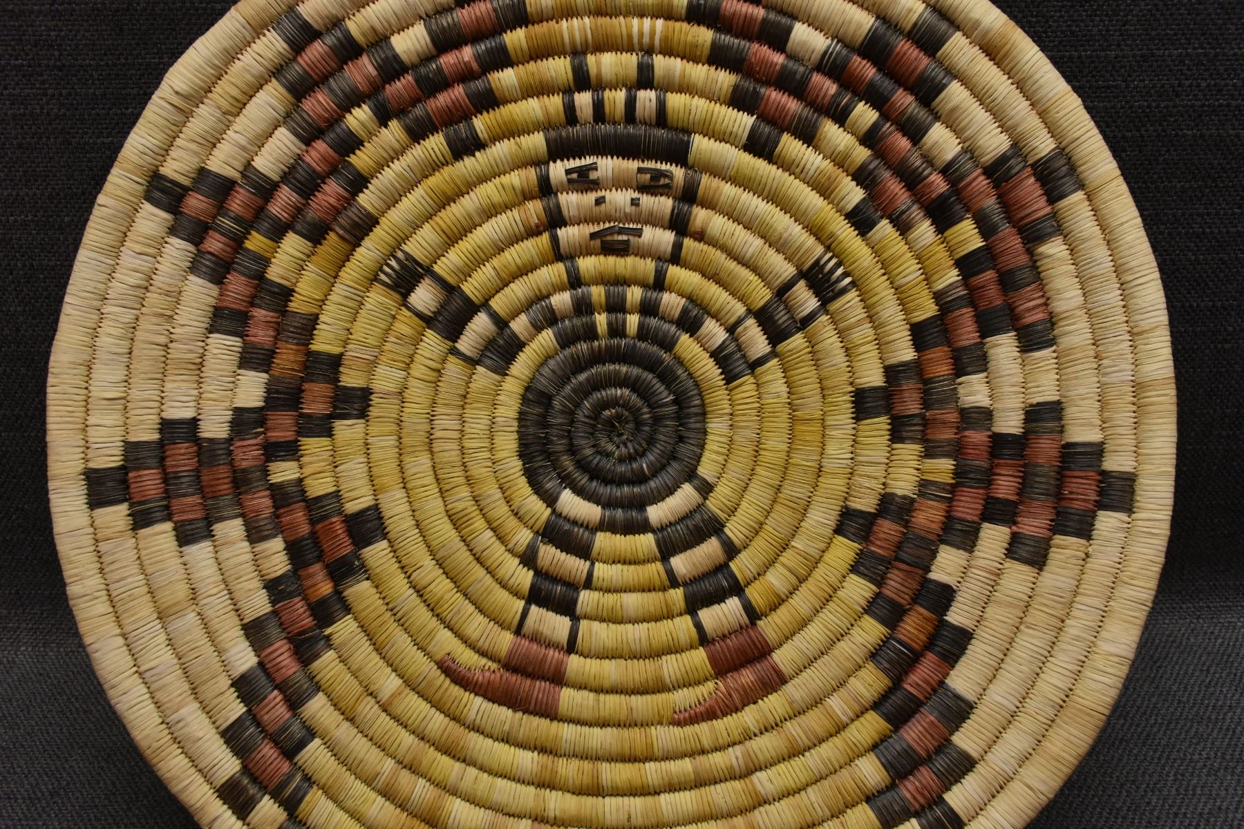 1970's Hopi. Hand woven polychrome kachina design second mesa basketry plaque. 13'' dia