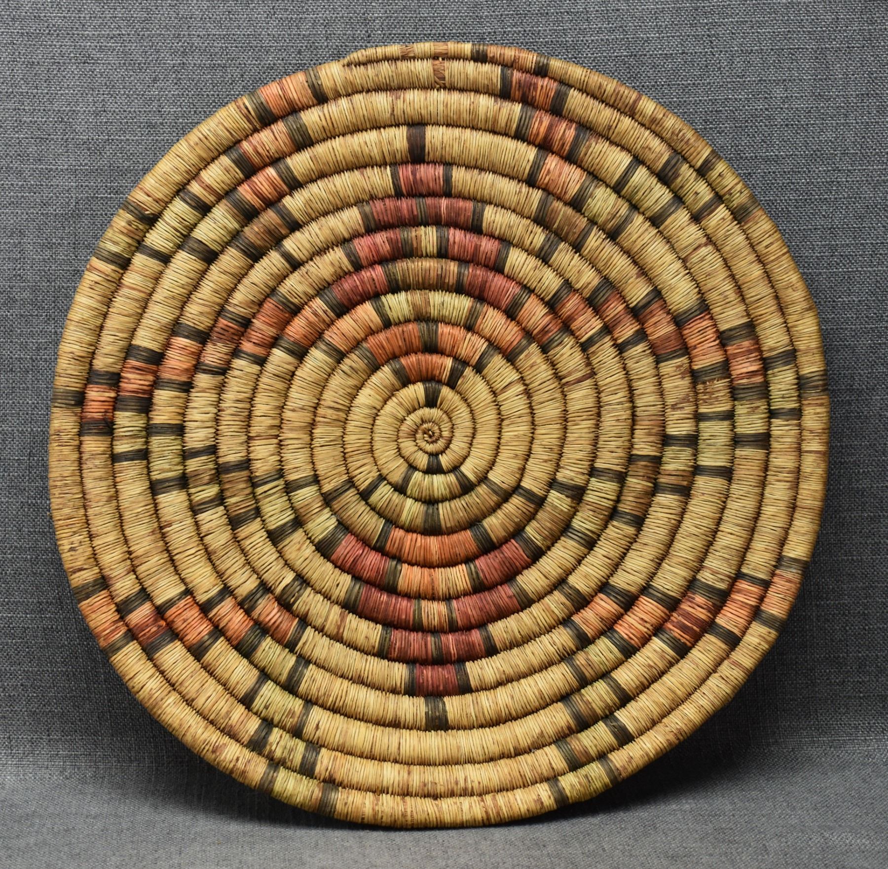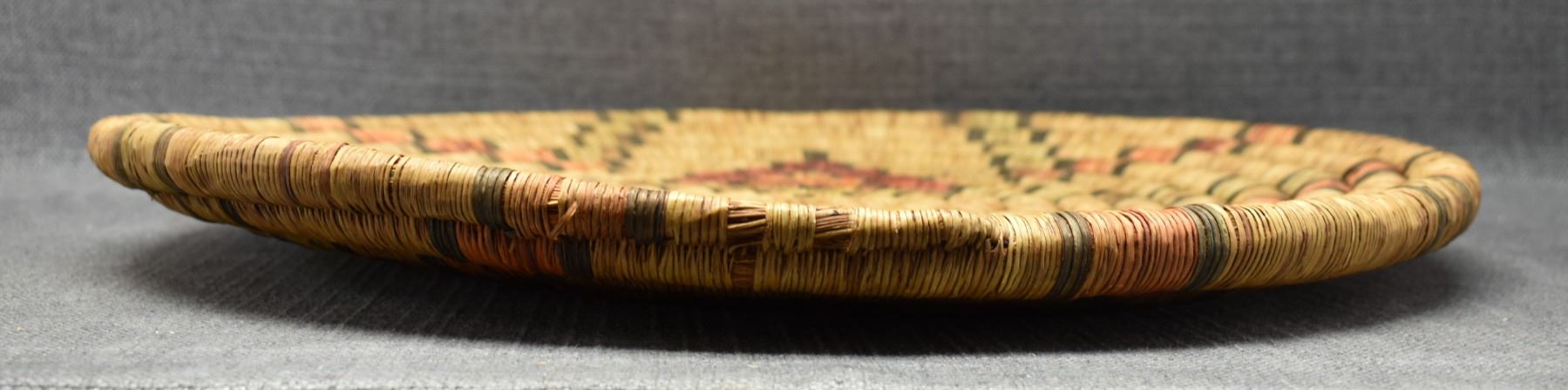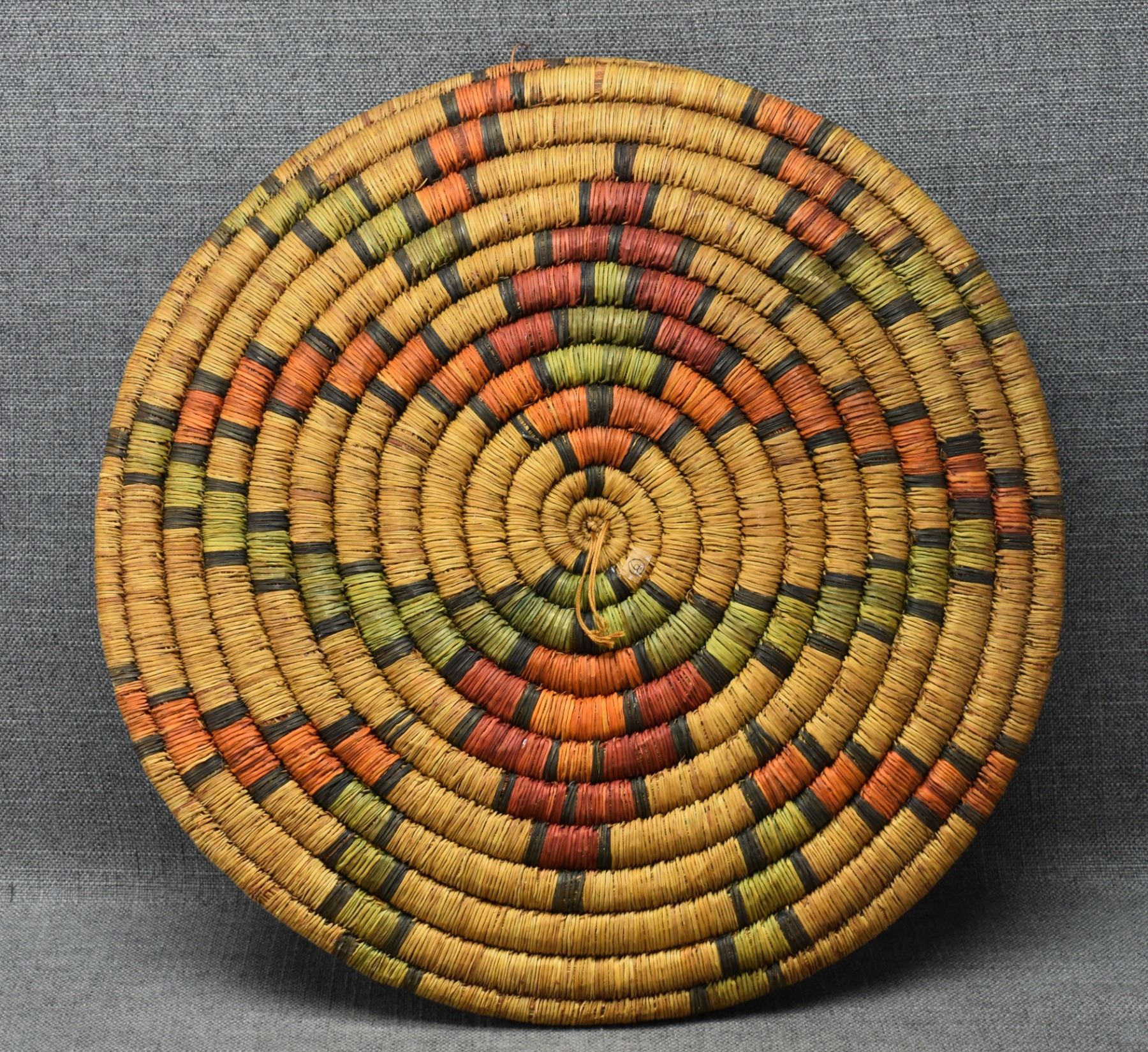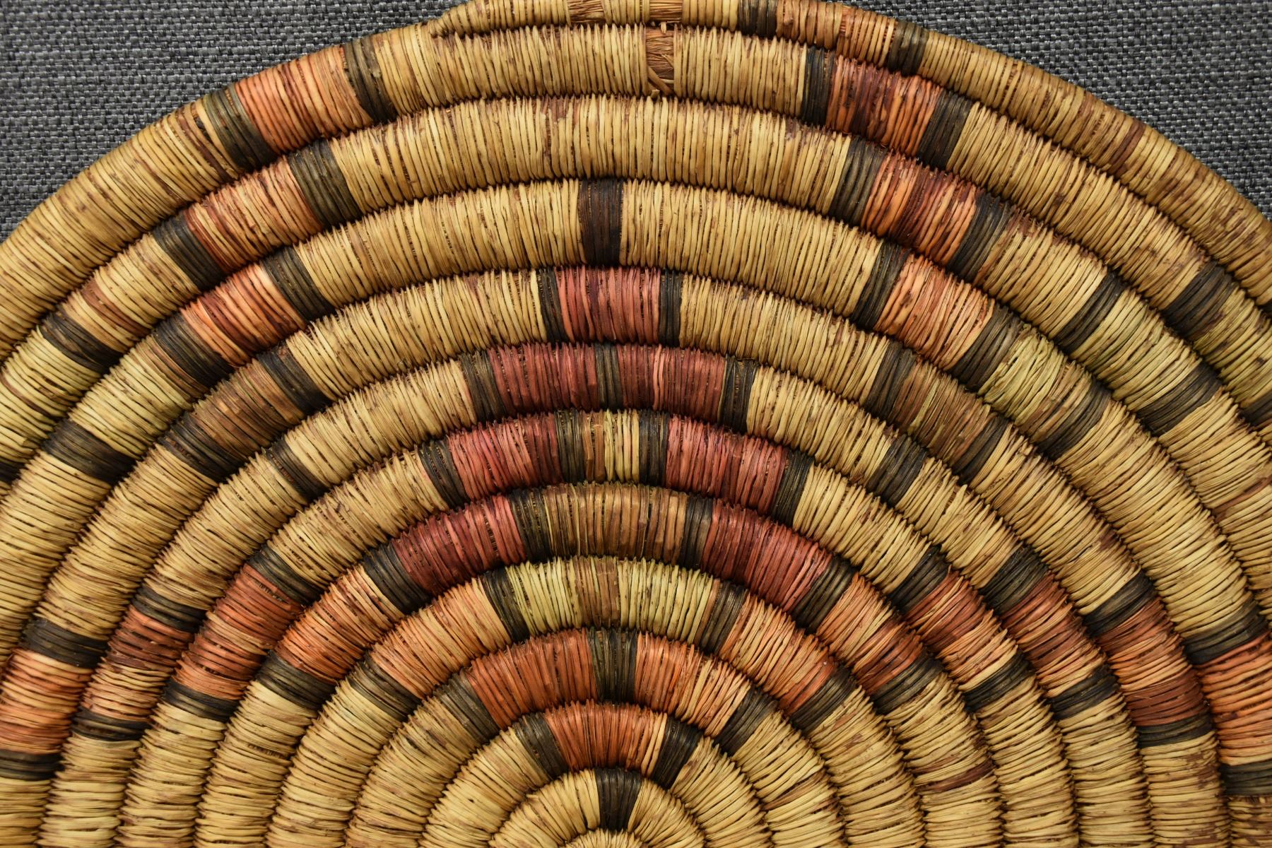 1960's Hopi. Hand woven polychrome design second mesa basketry plaque. 17'' dia