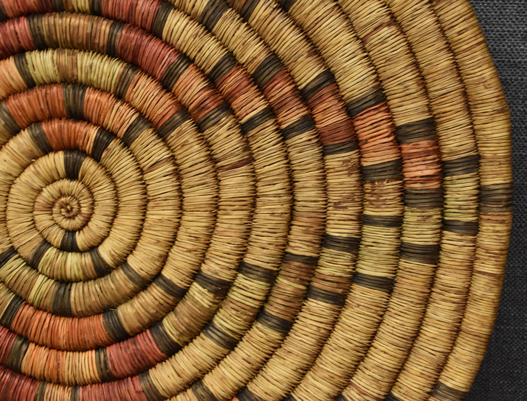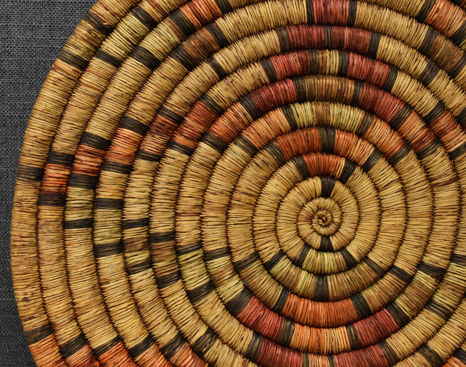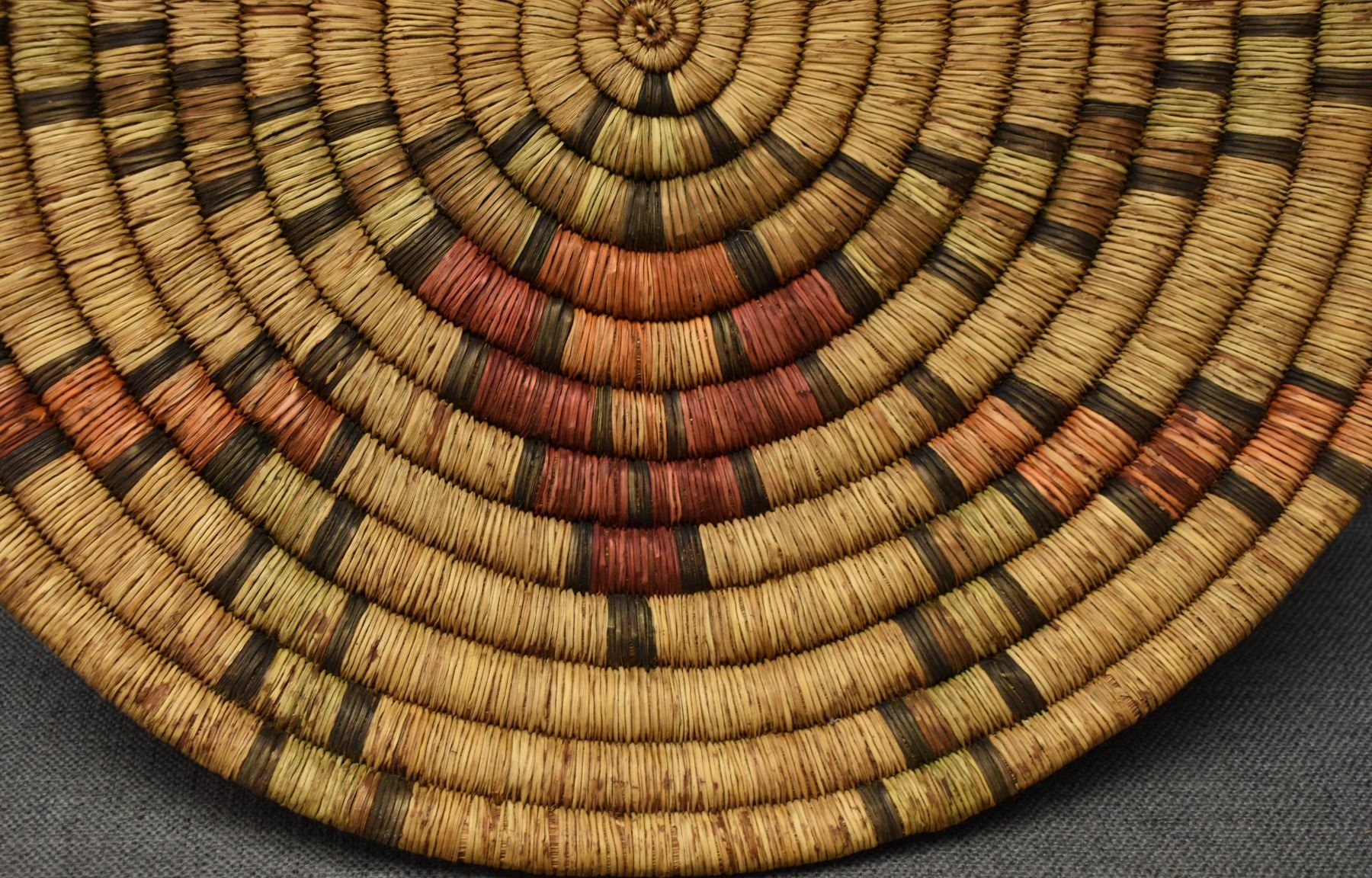 1960's Hopi. Hand woven polychrome design second mesa basketry plaque. 17'' dia
