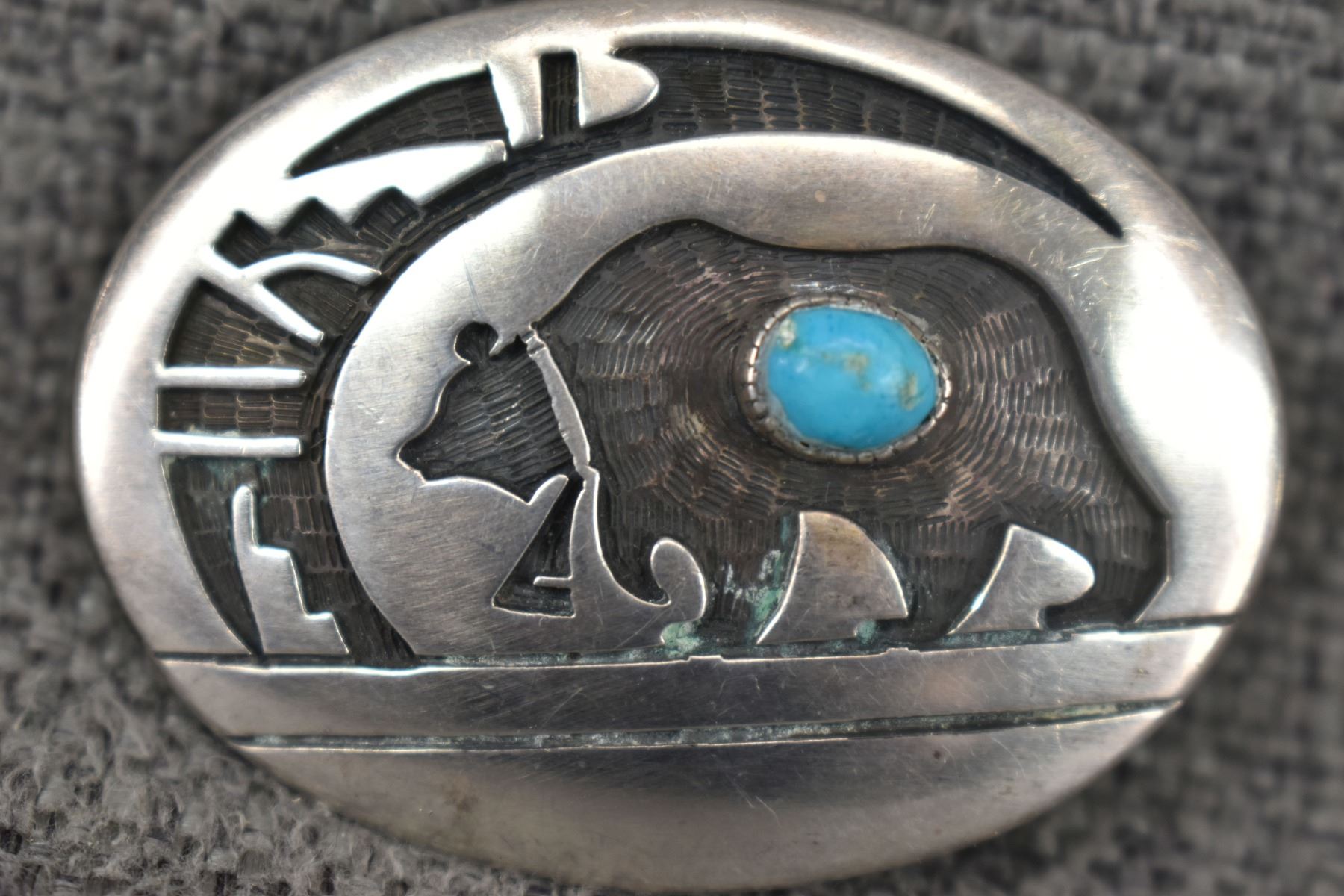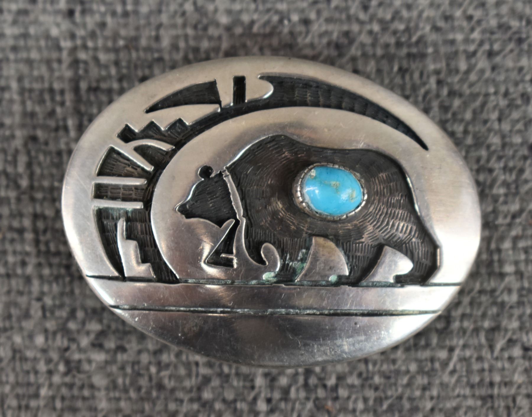 1990's Hopi, sterling silver overlay bear design with turquoise stone signed with hallmark for Gary Masawytewa, 1.5" x 2" fits 1" belt total weight 22 grams
