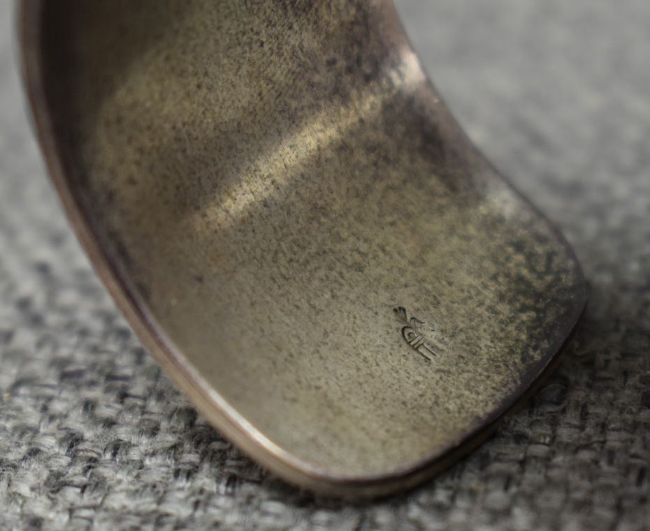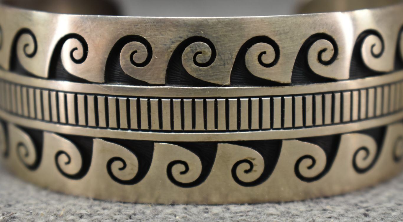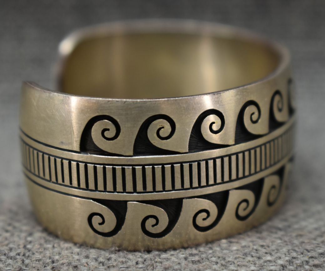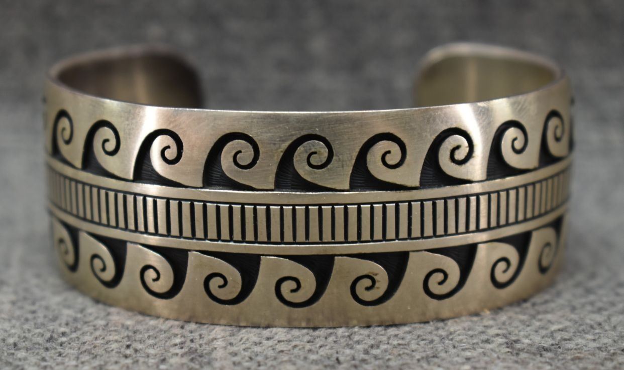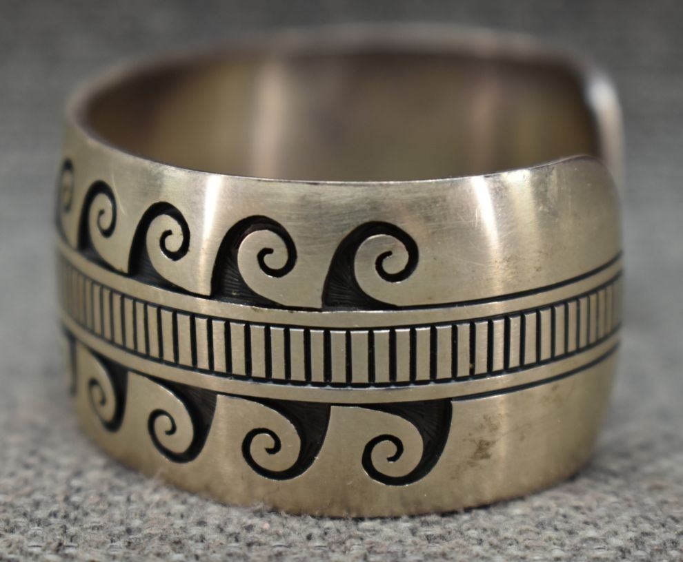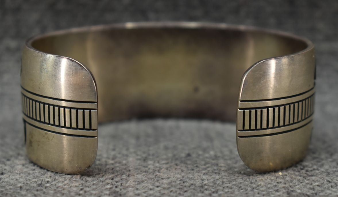 1990's/2000's Hopi, sterling silver bracelet with corn stalk and rain cloud logo for Charleston Lewis 1" x 5.5" x 1" 59 grams