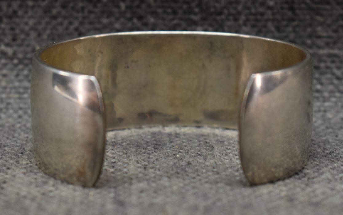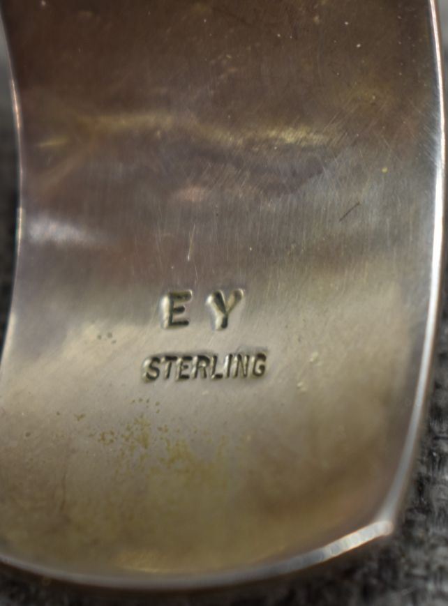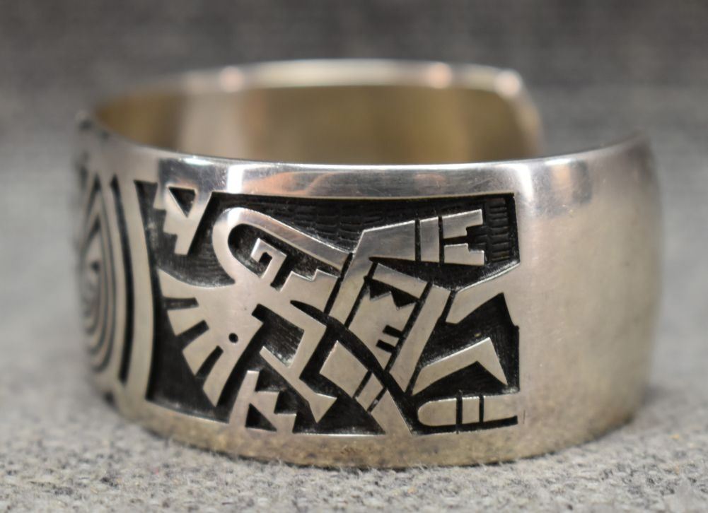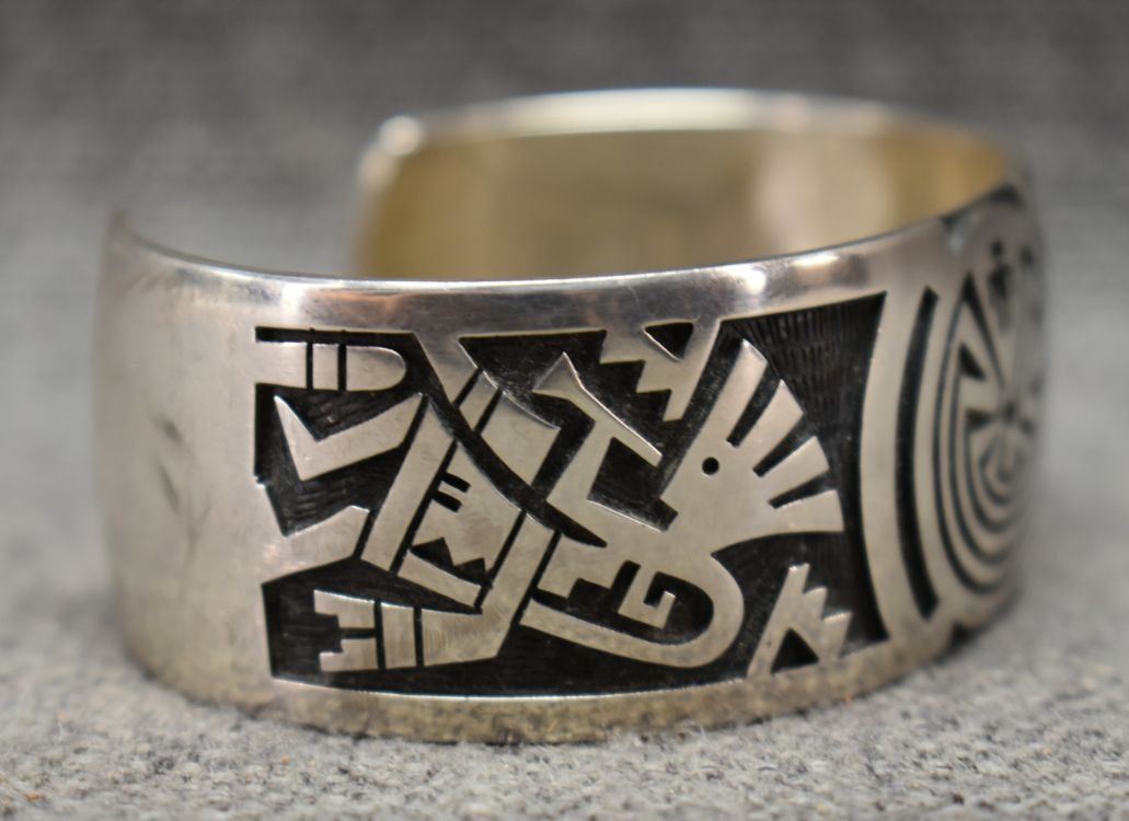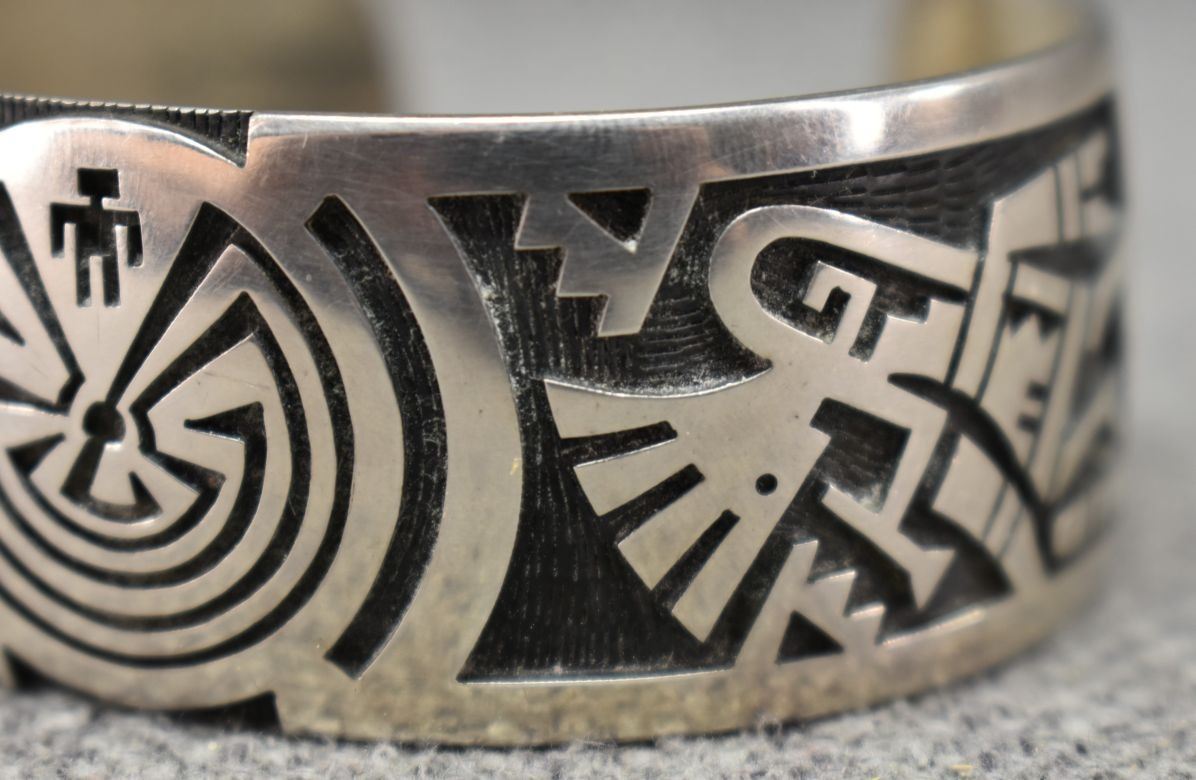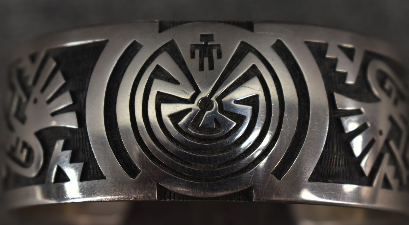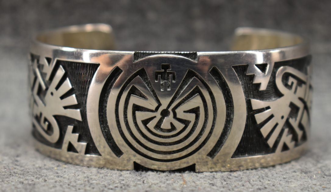 1980's Hopi, Stearling silver with cut out design depicting Man in maze and Kokopelli Stamped E. Y. 1" x 5.5" x 1.25" 552 grams