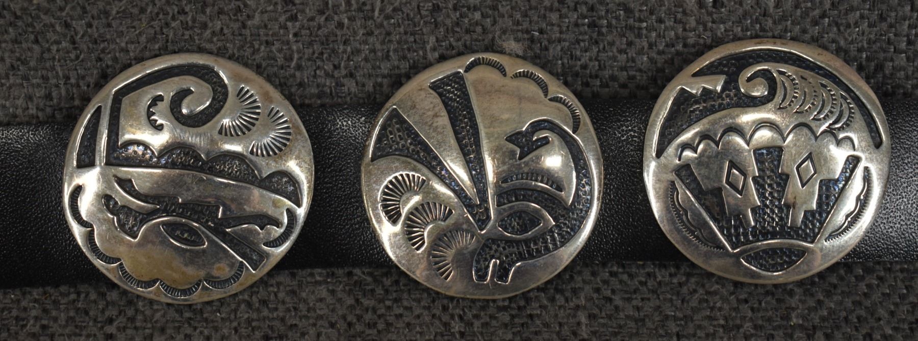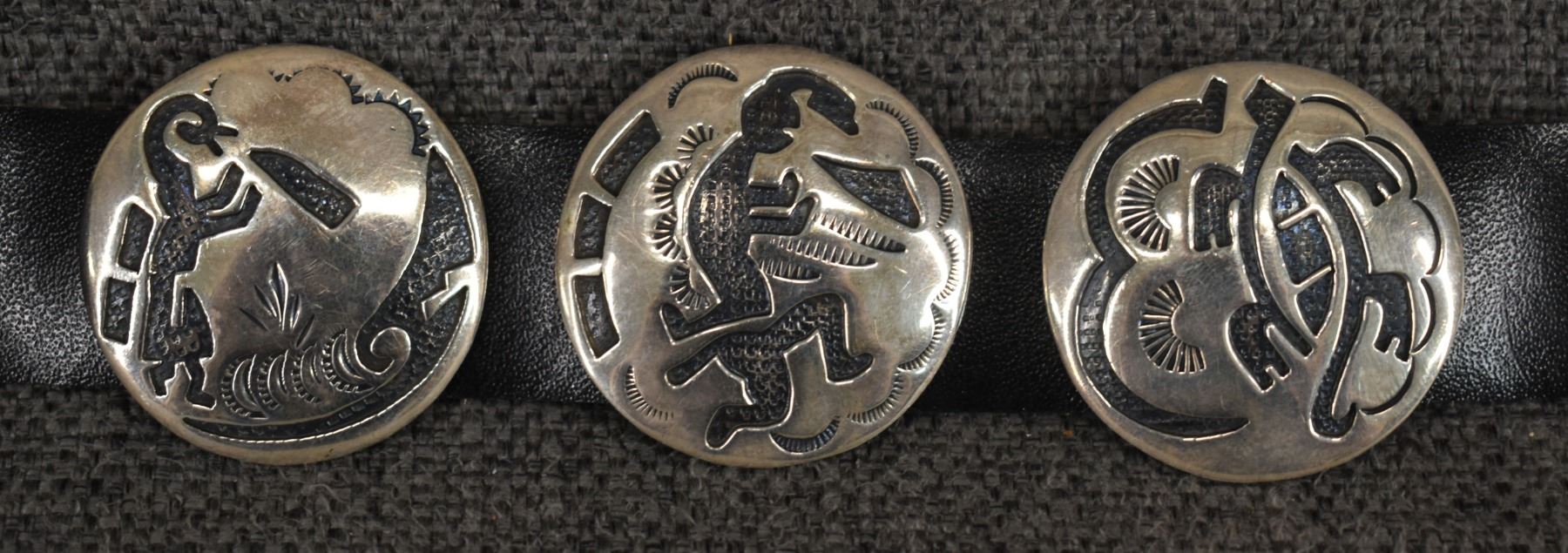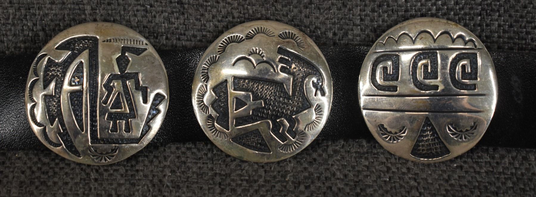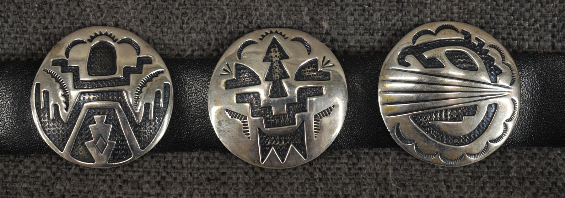 1980's Hopi. Sterling silver buckle 1.5'' Dia and sixteen conchos. Total weight 255 grams. Excluding 1'' x 38'' leather belt