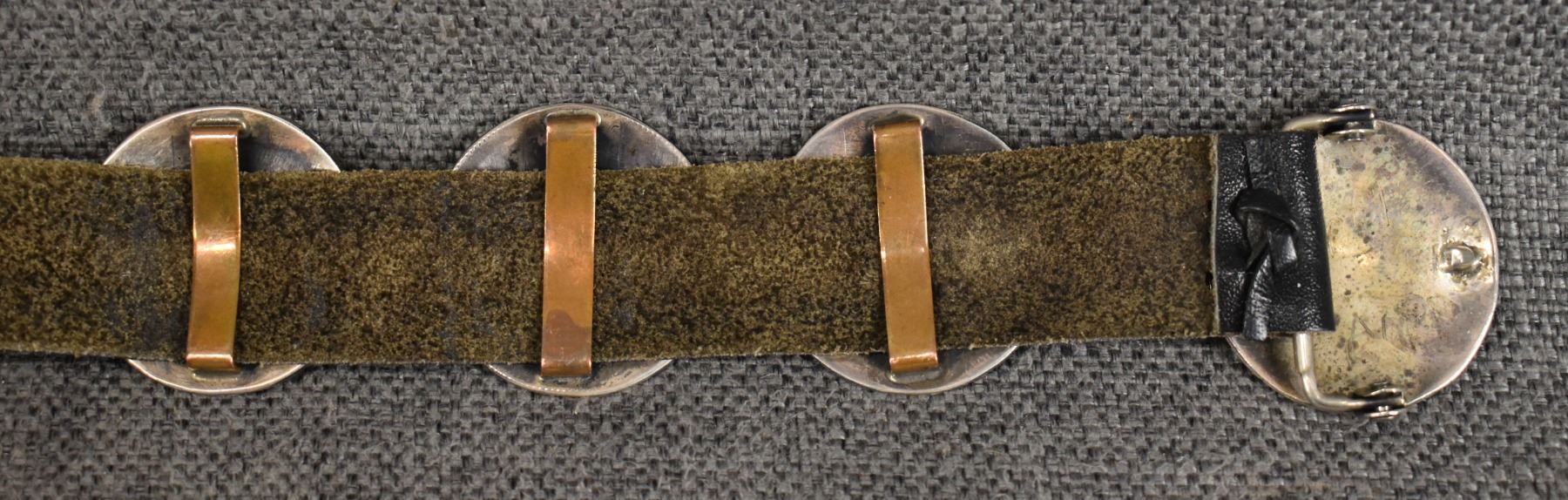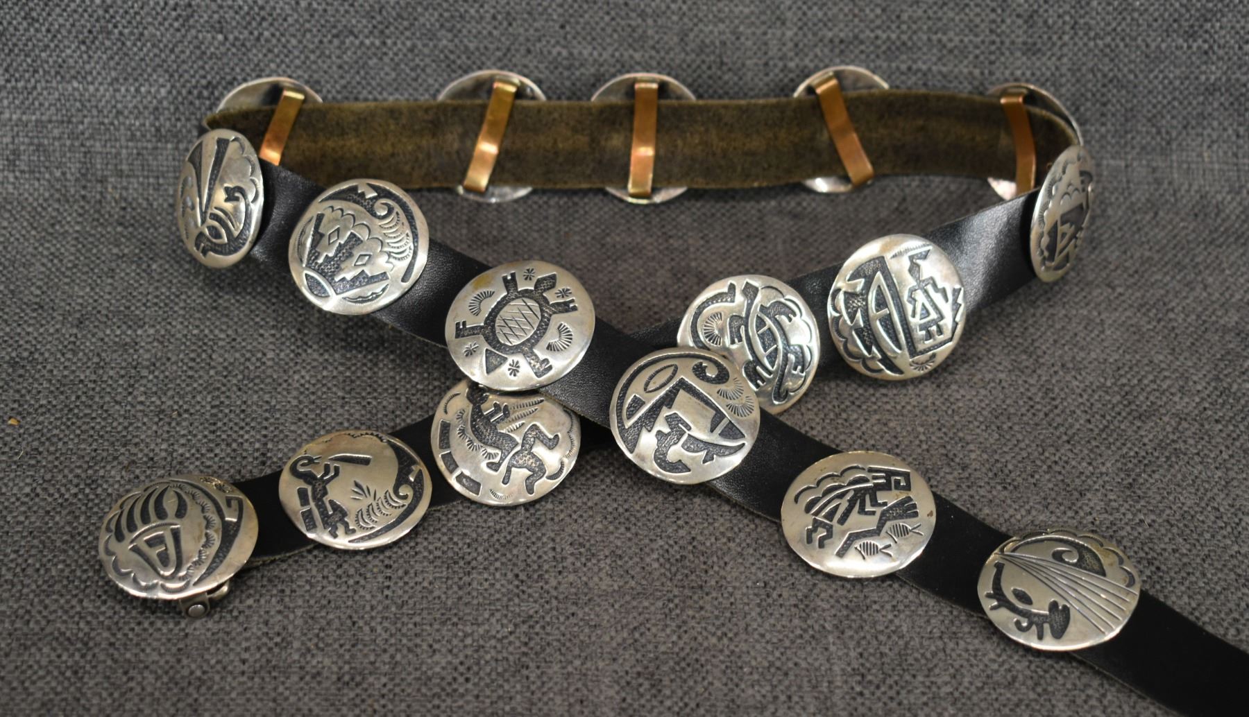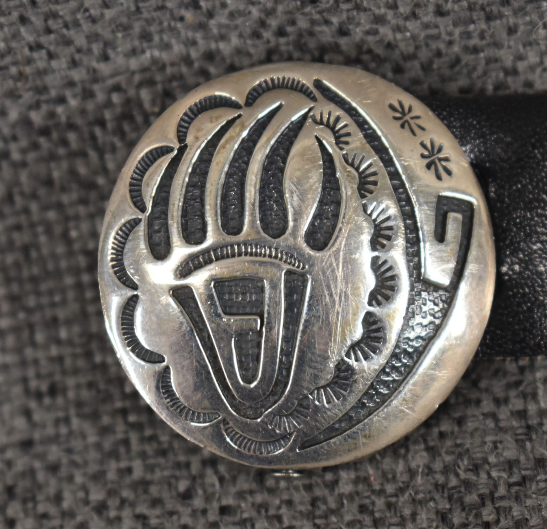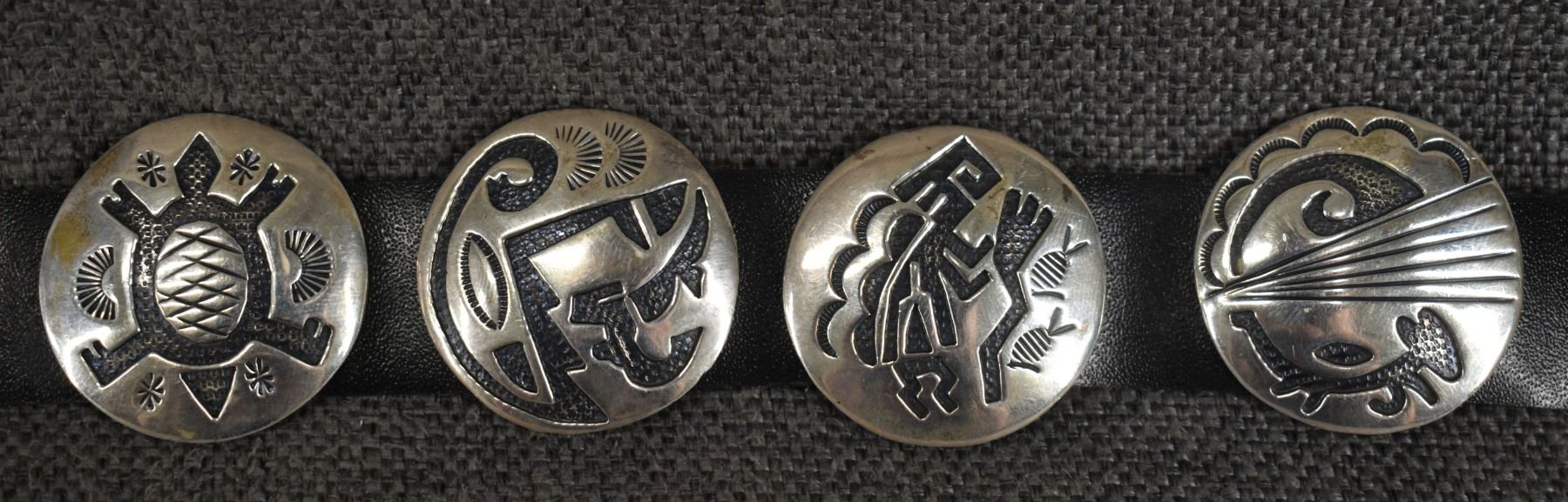 1980's Hopi. Sterling silver buckle 1.5'' Dia and sixteen conchos. Total weight 255 grams. Excluding 1'' x 38'' leather belt