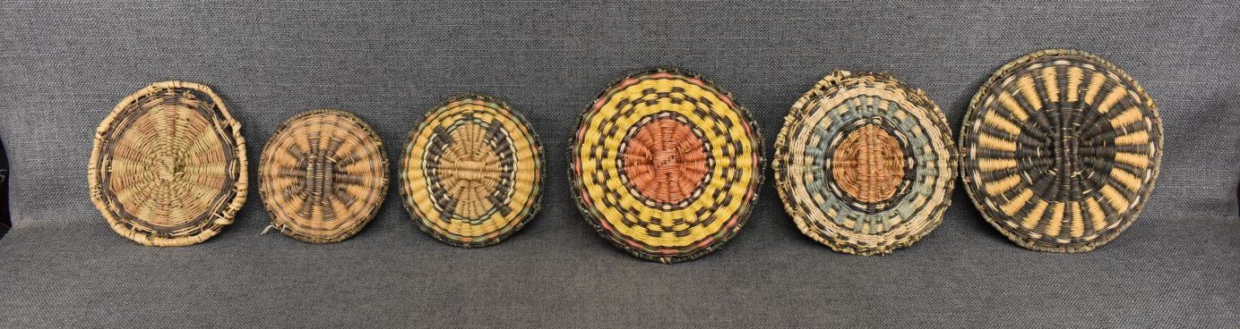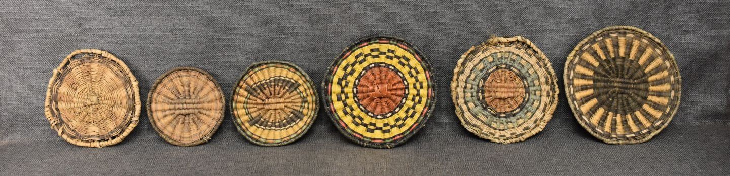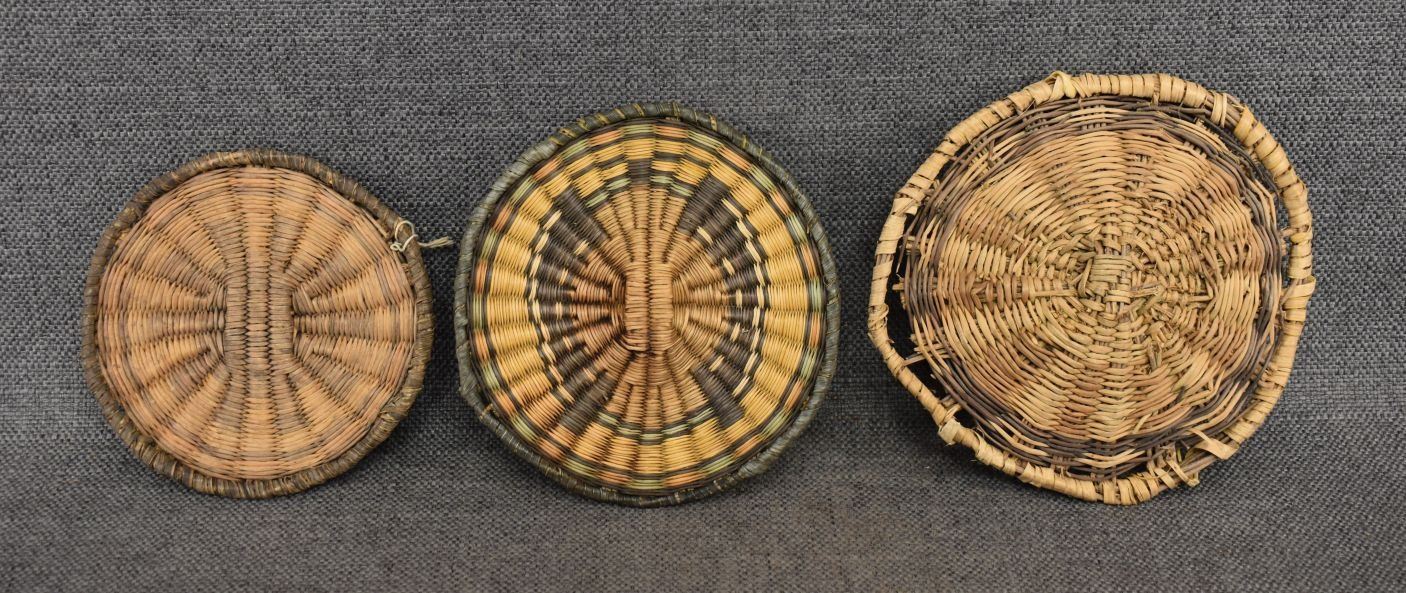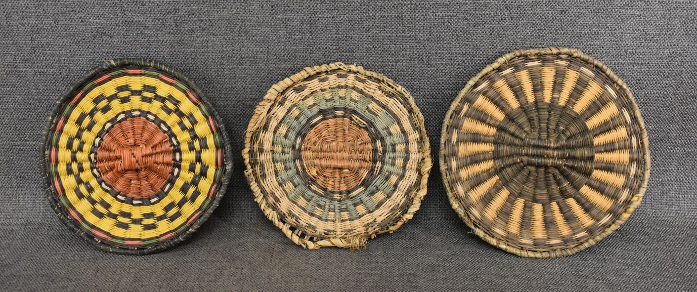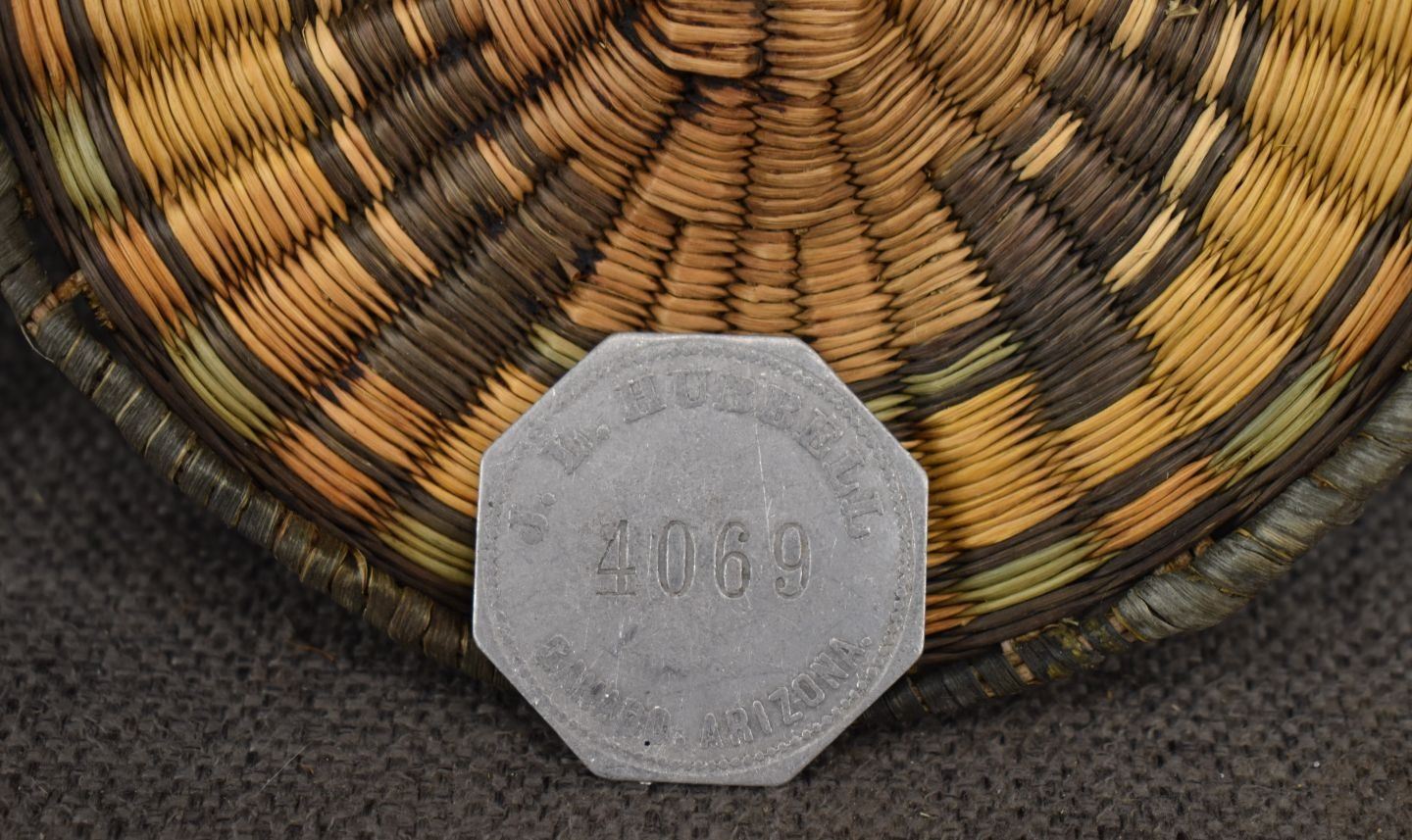 1920's Hopi Indian. Hand woven third mesa baskets. Largest is 7'' dia. And J.L. Hubbell Trading post Token