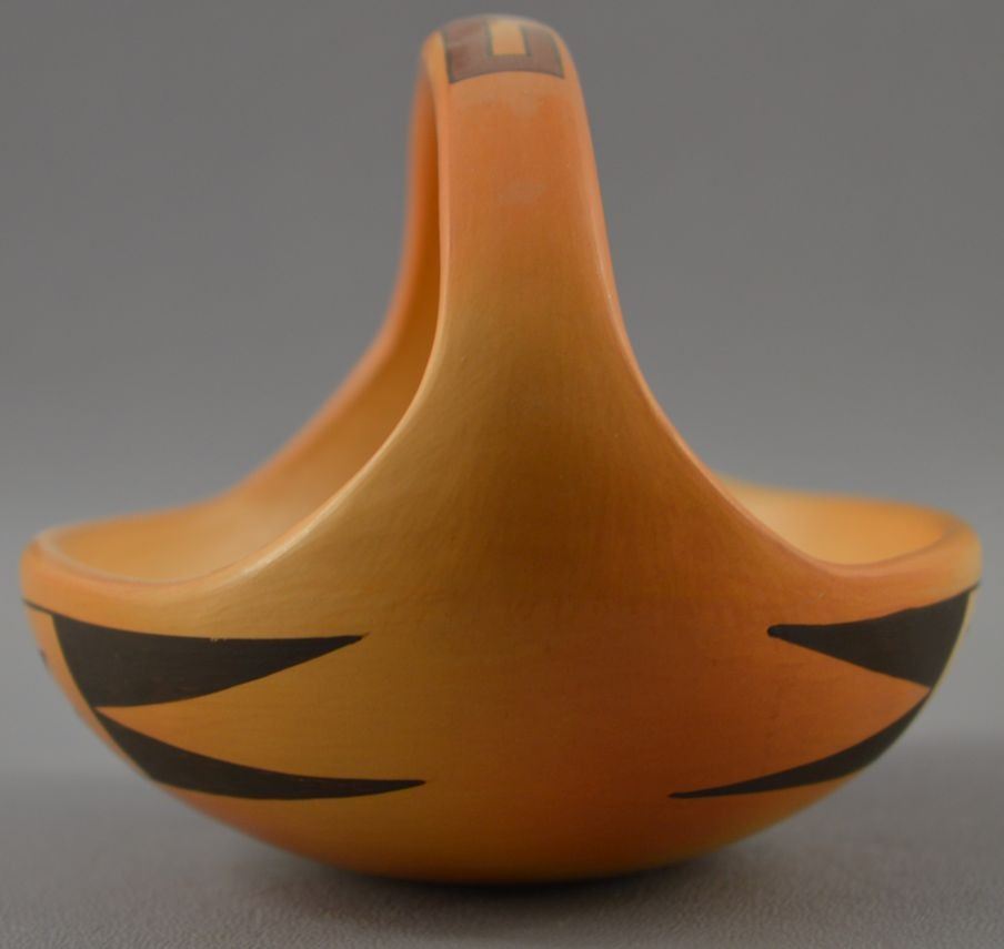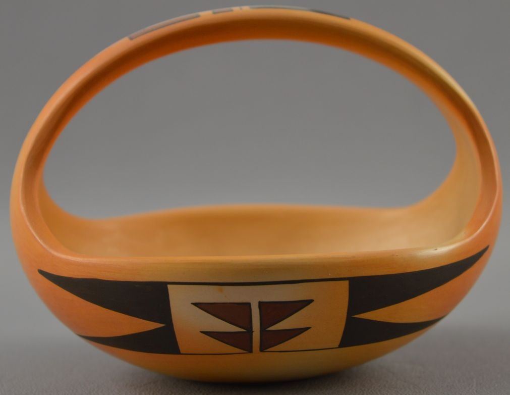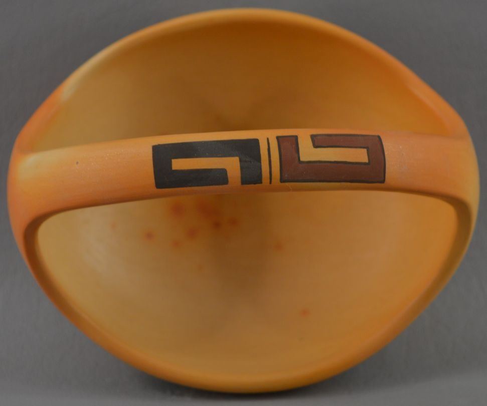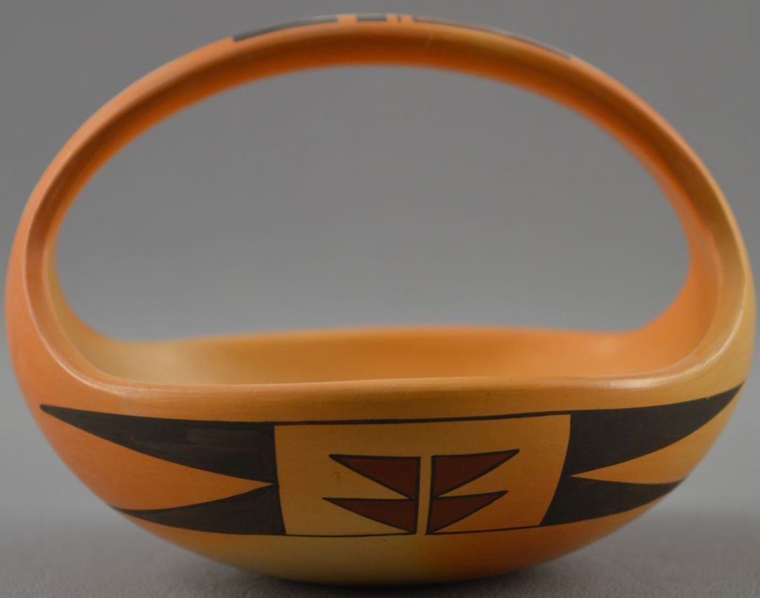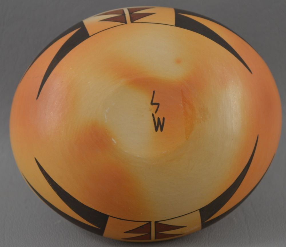 1990's Hopi Indian. Hand coiled and painted polychrome design pottery basketry signed MS for Madeline Sahneyah. 3.5'' x 5'' x 4''