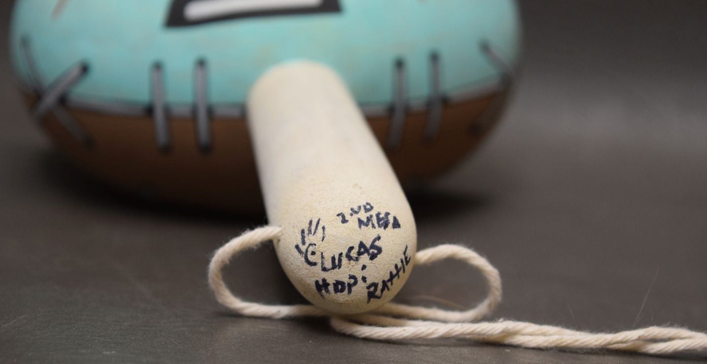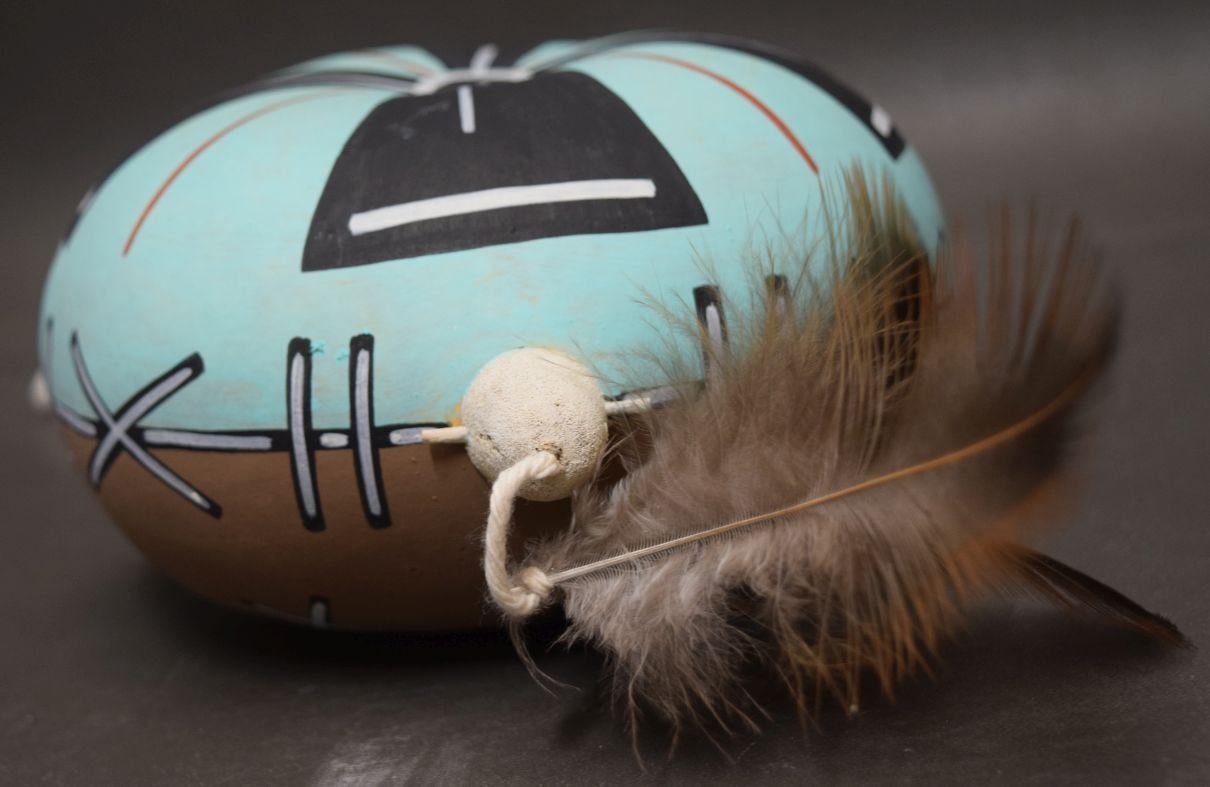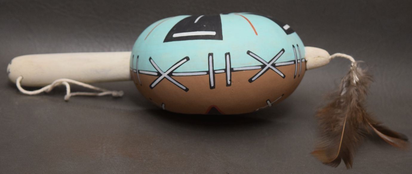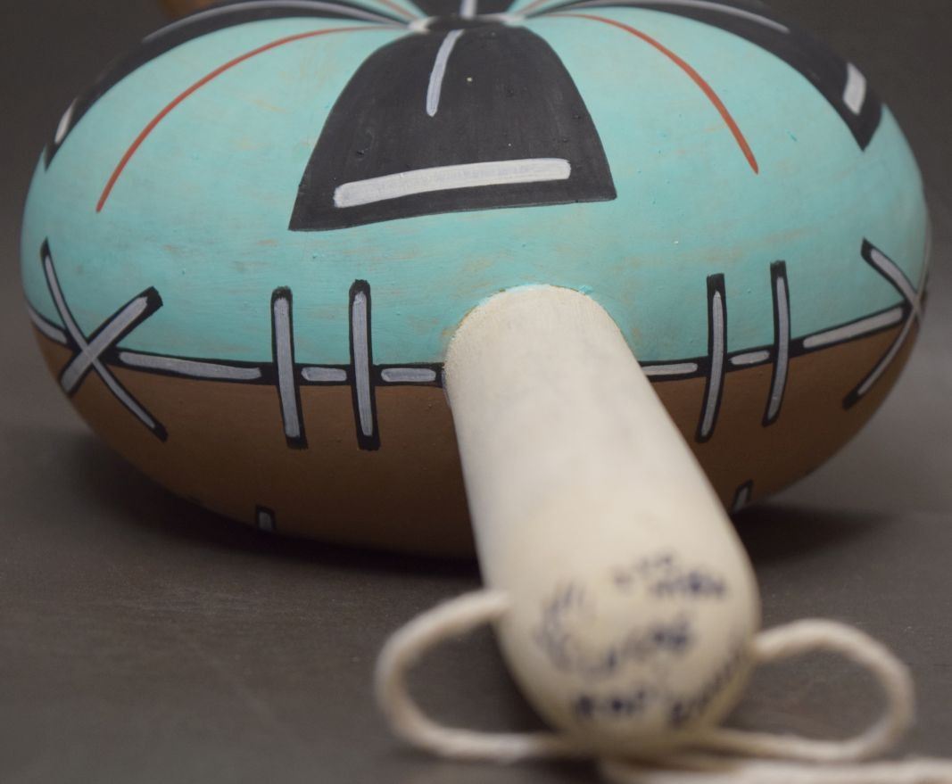 1990's Hopi Indian hand painted gourd rattle signed Lucas. 12'' x 6'' x 3''