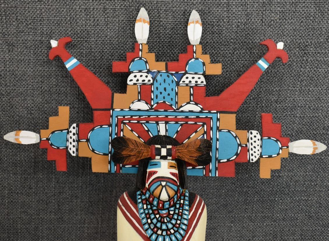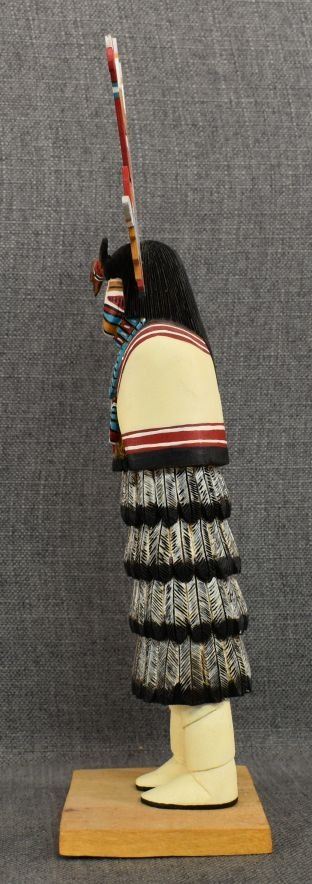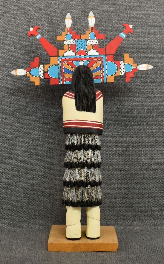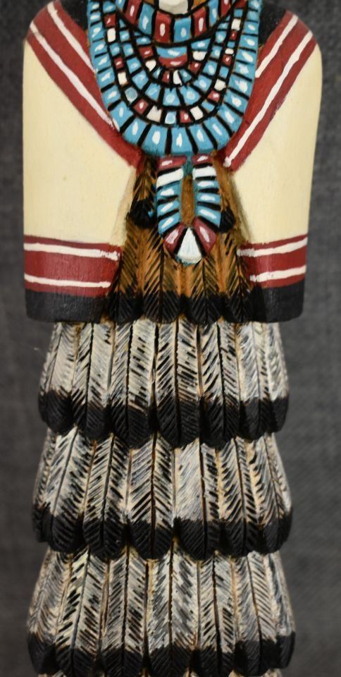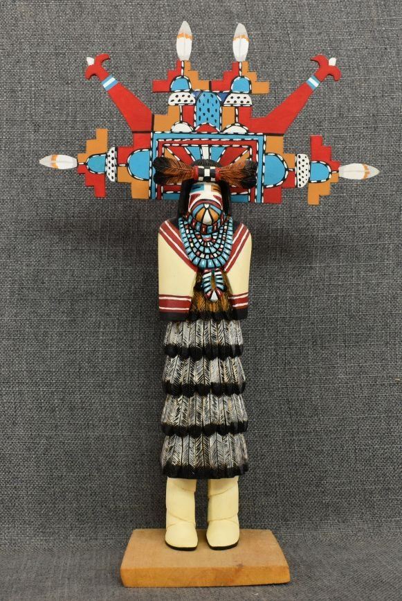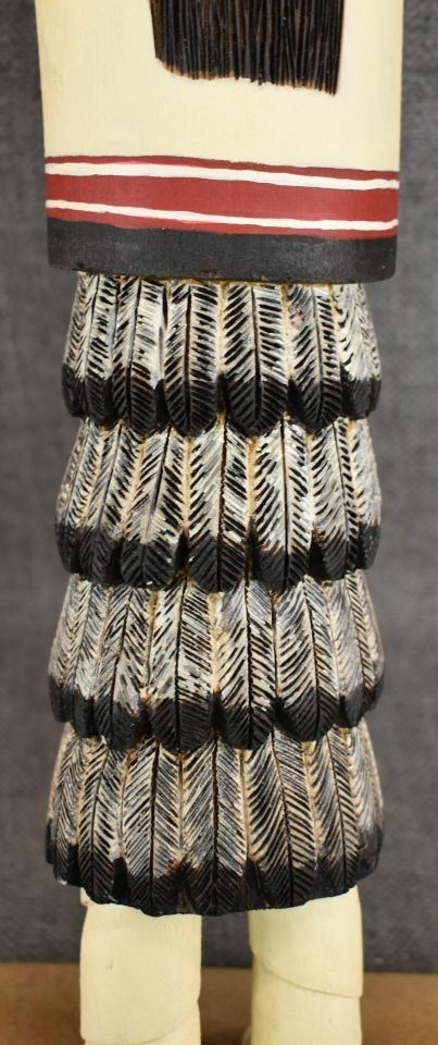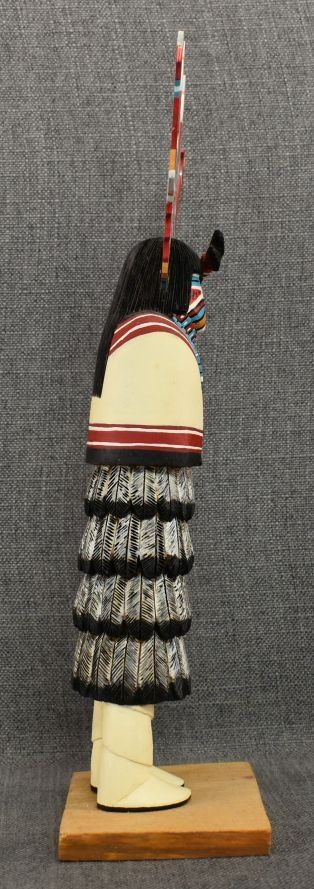 1990's Hopi. Hand carved and painted cotton wood kachina. Signed Albert Lalo. 16'' tall