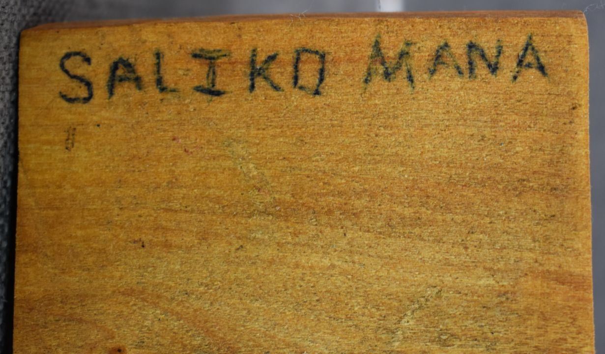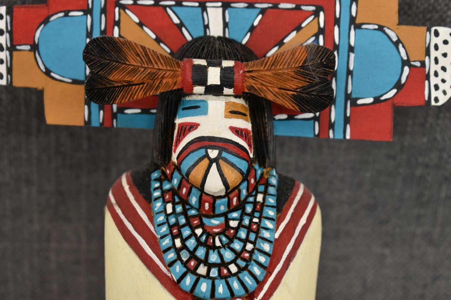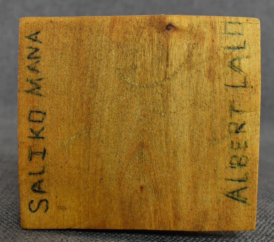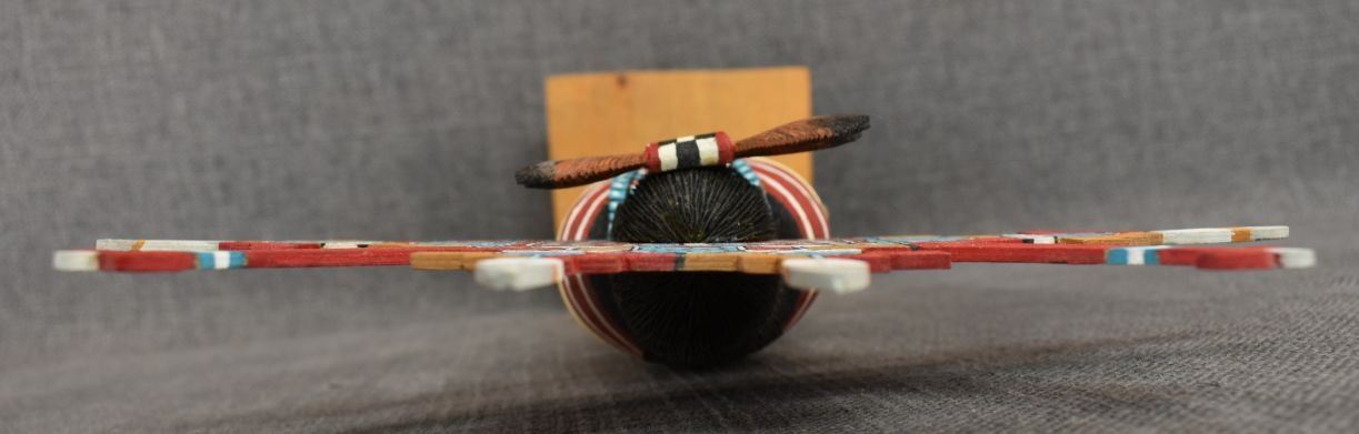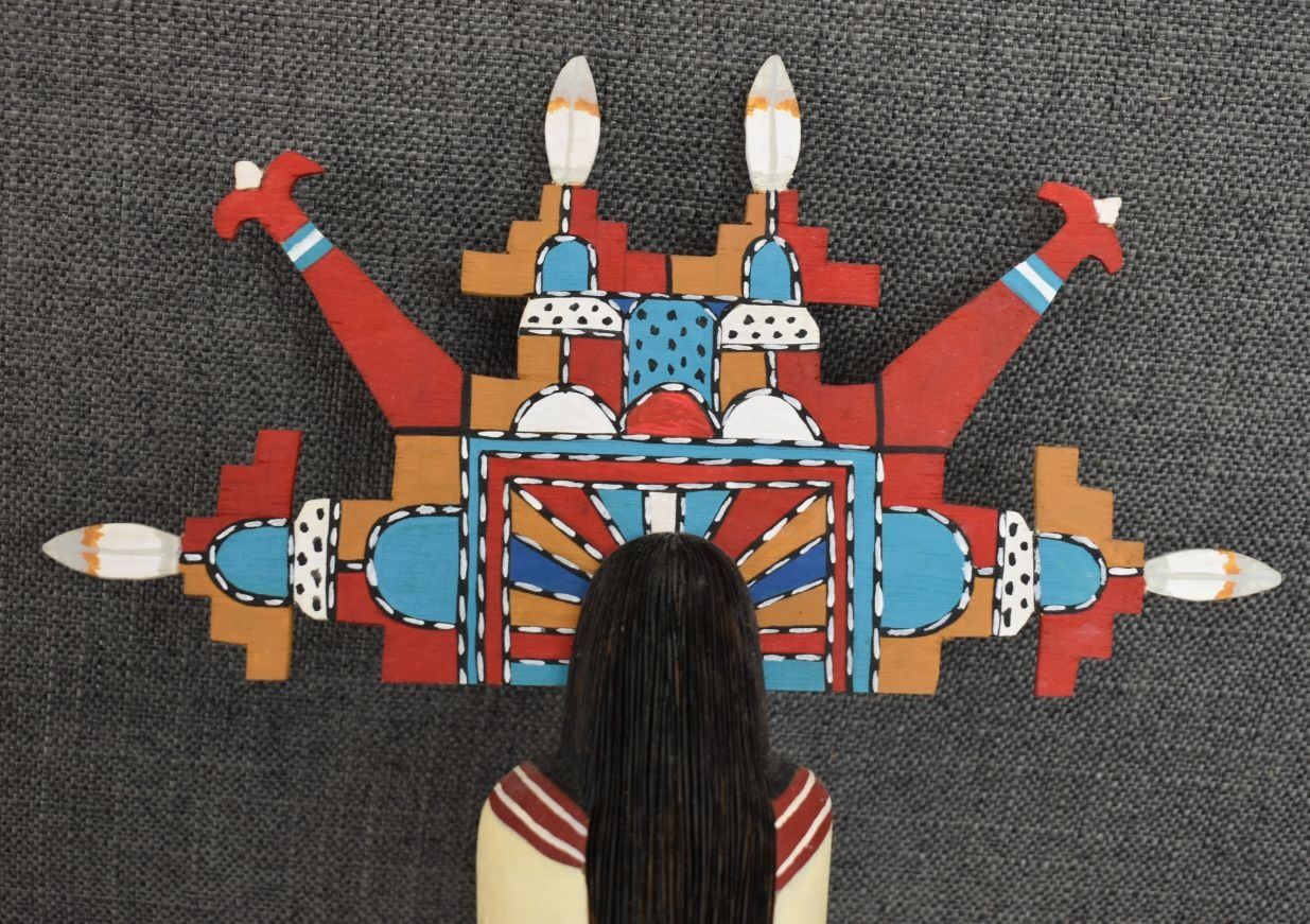 1990's Hopi. Hand carved and painted cotton wood kachina. Signed Albert Lalo. 16'' tall