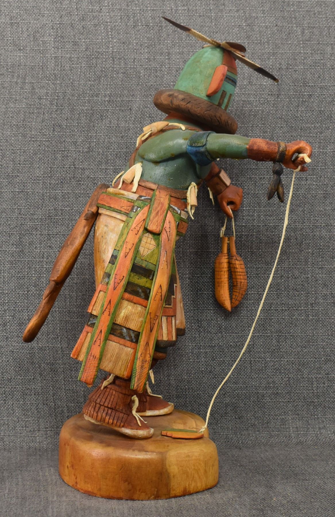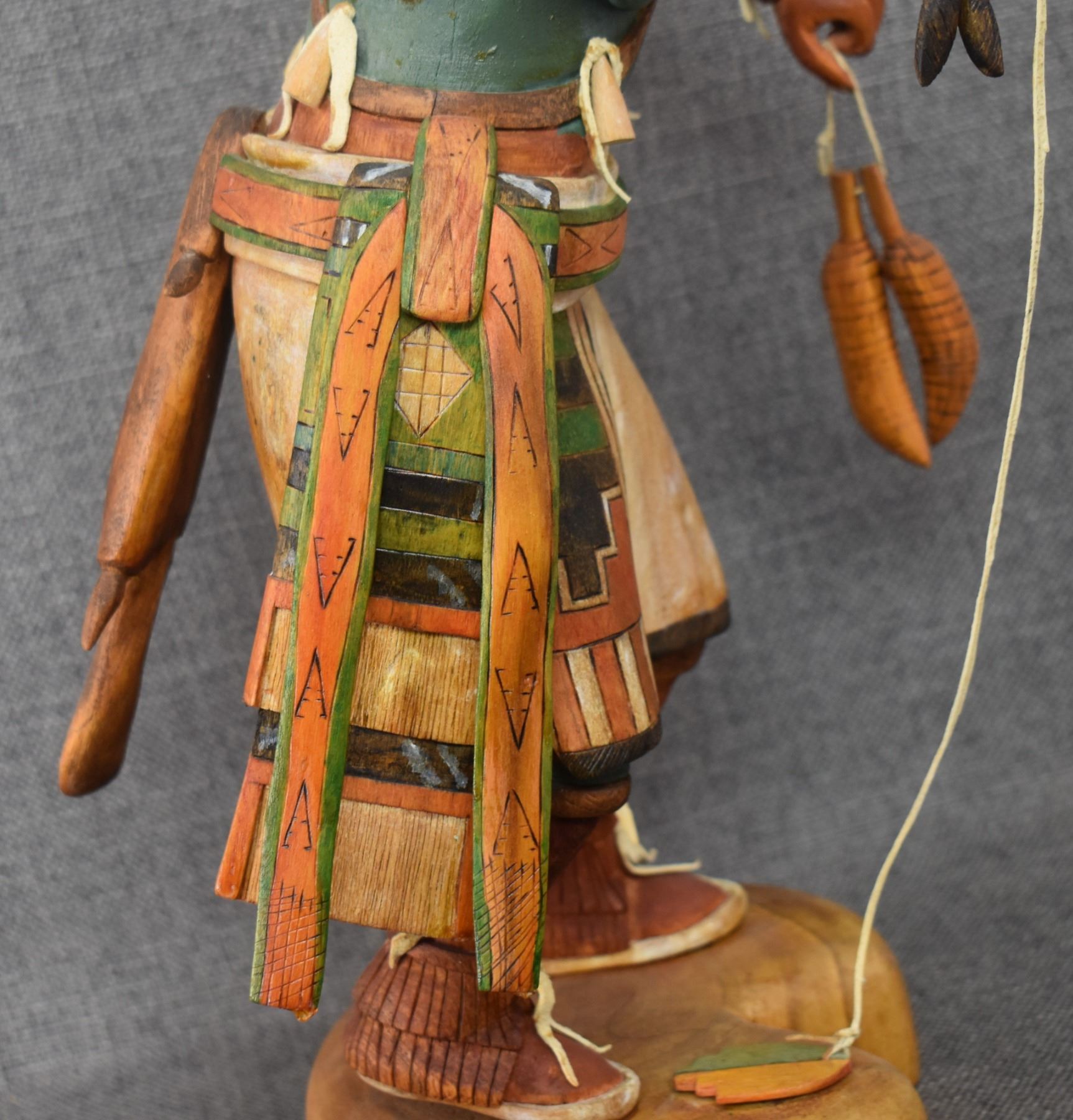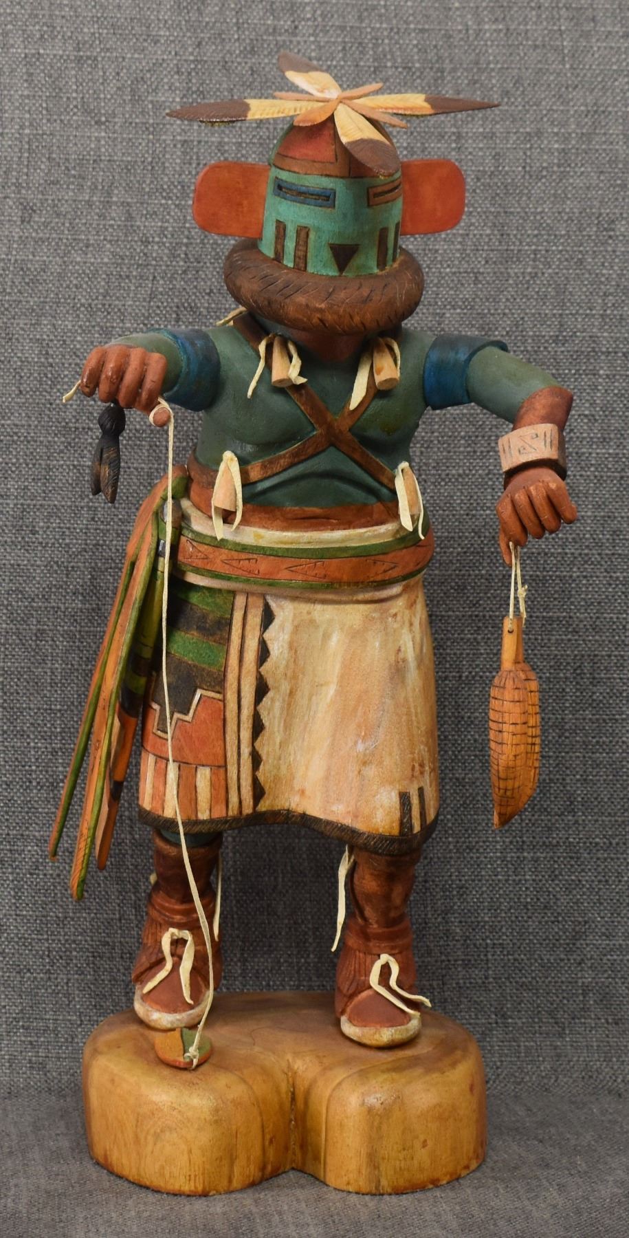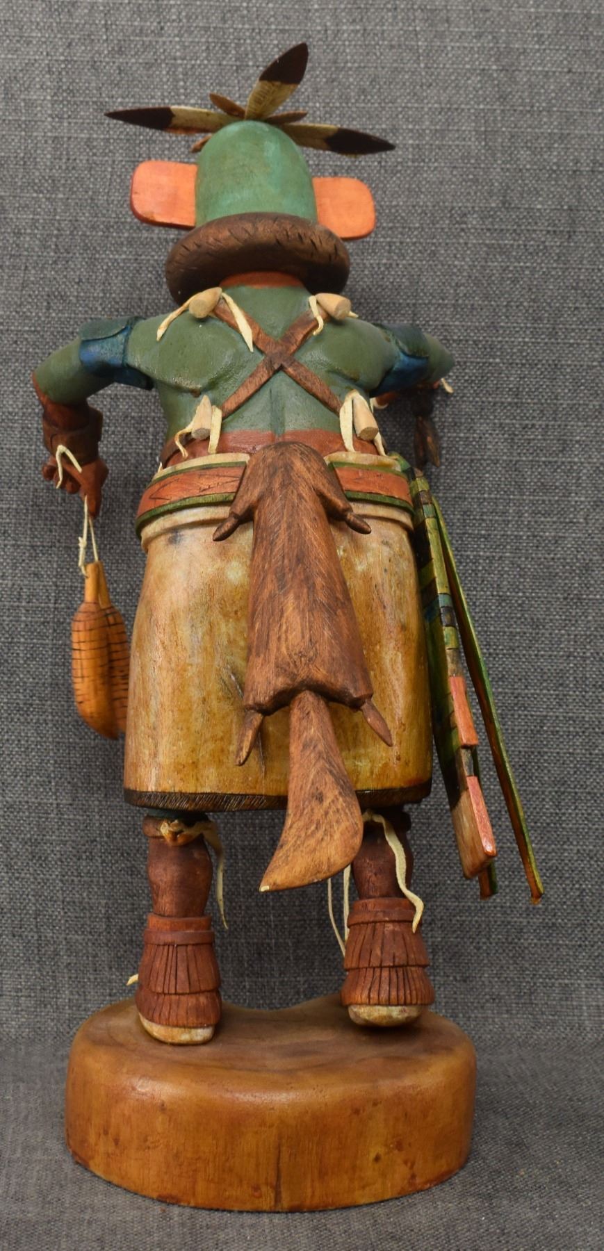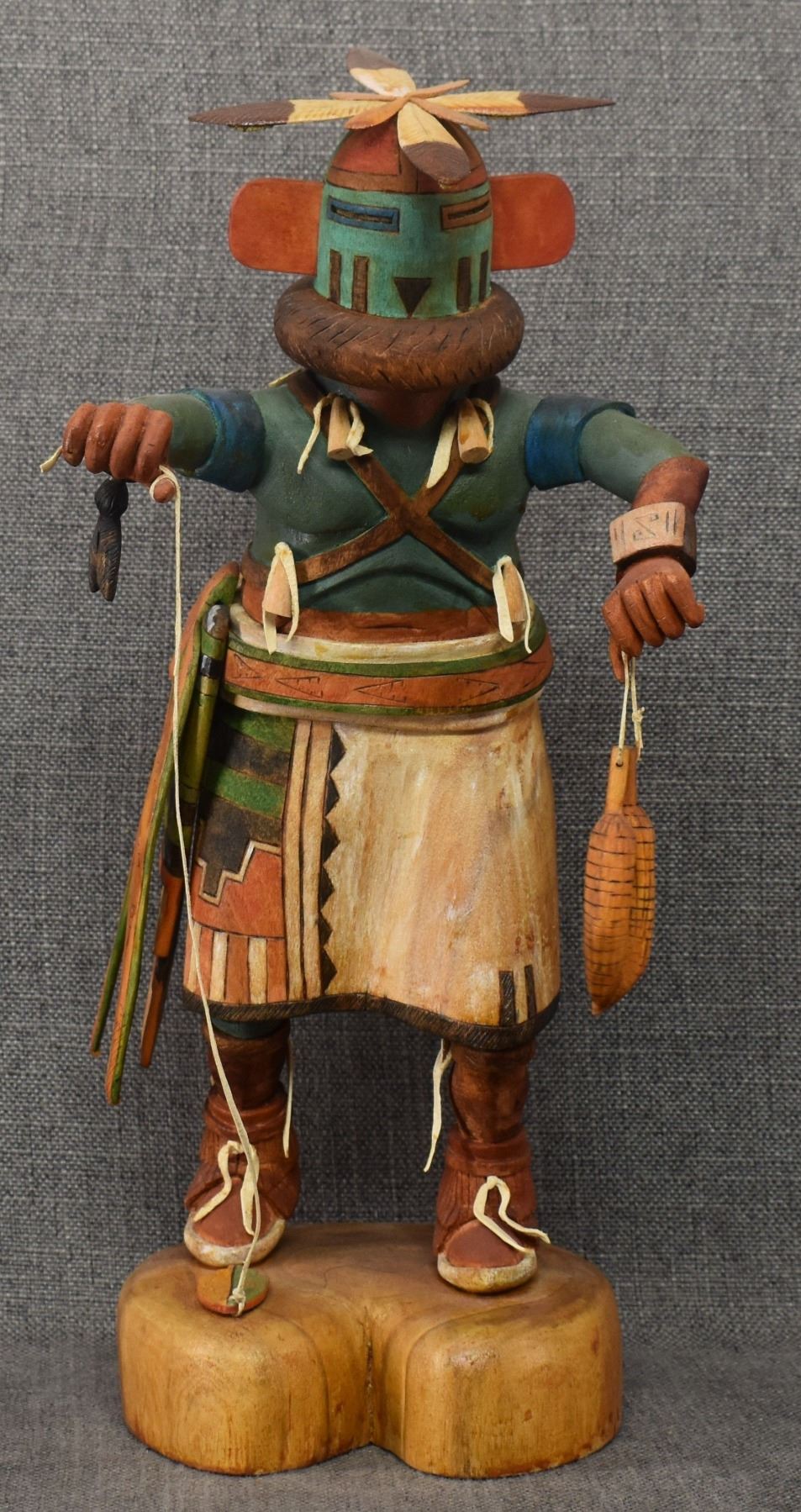1990's Hopi. Hand carved and painted cotton wood kachina, signed Arron Fred. 17'' tall