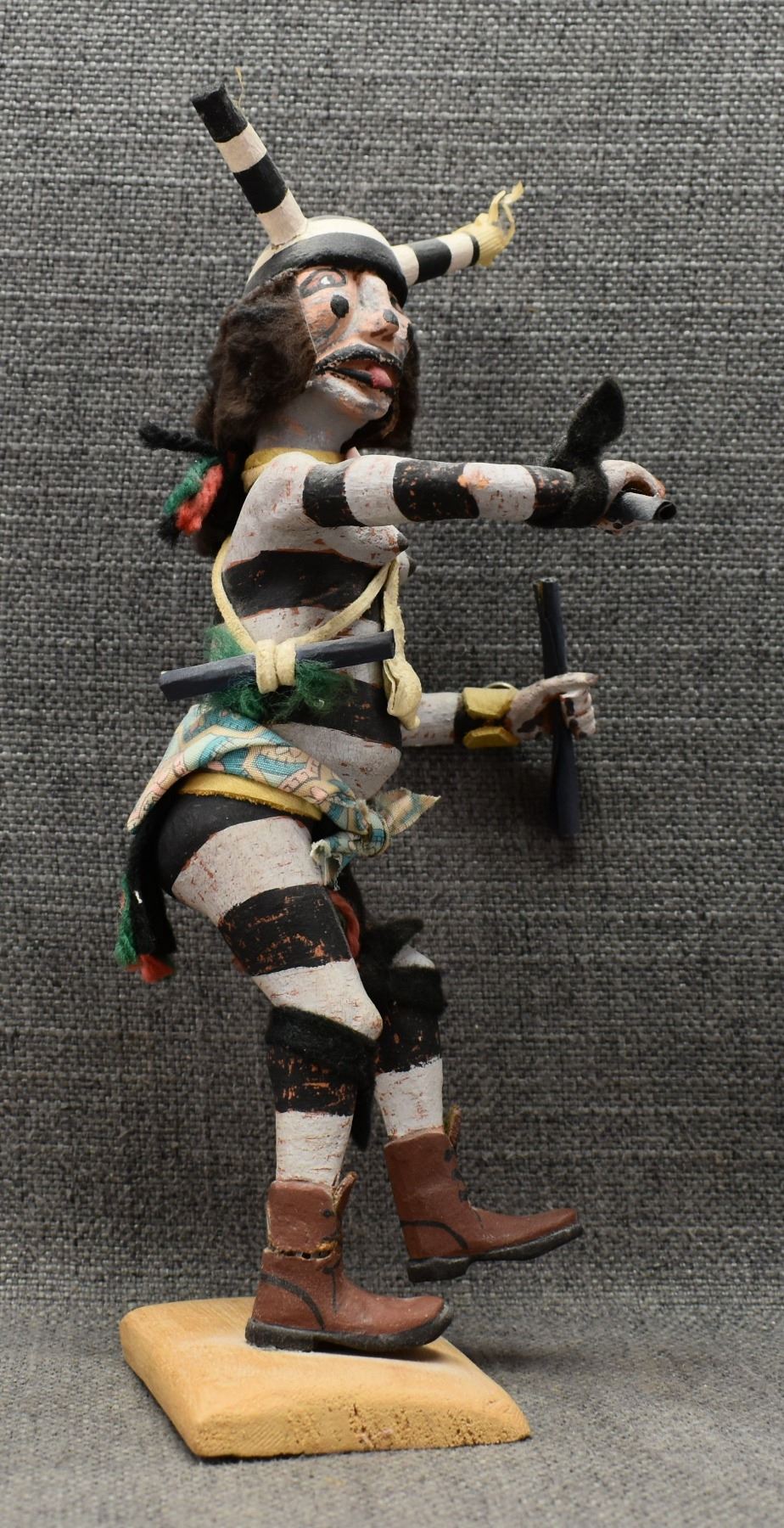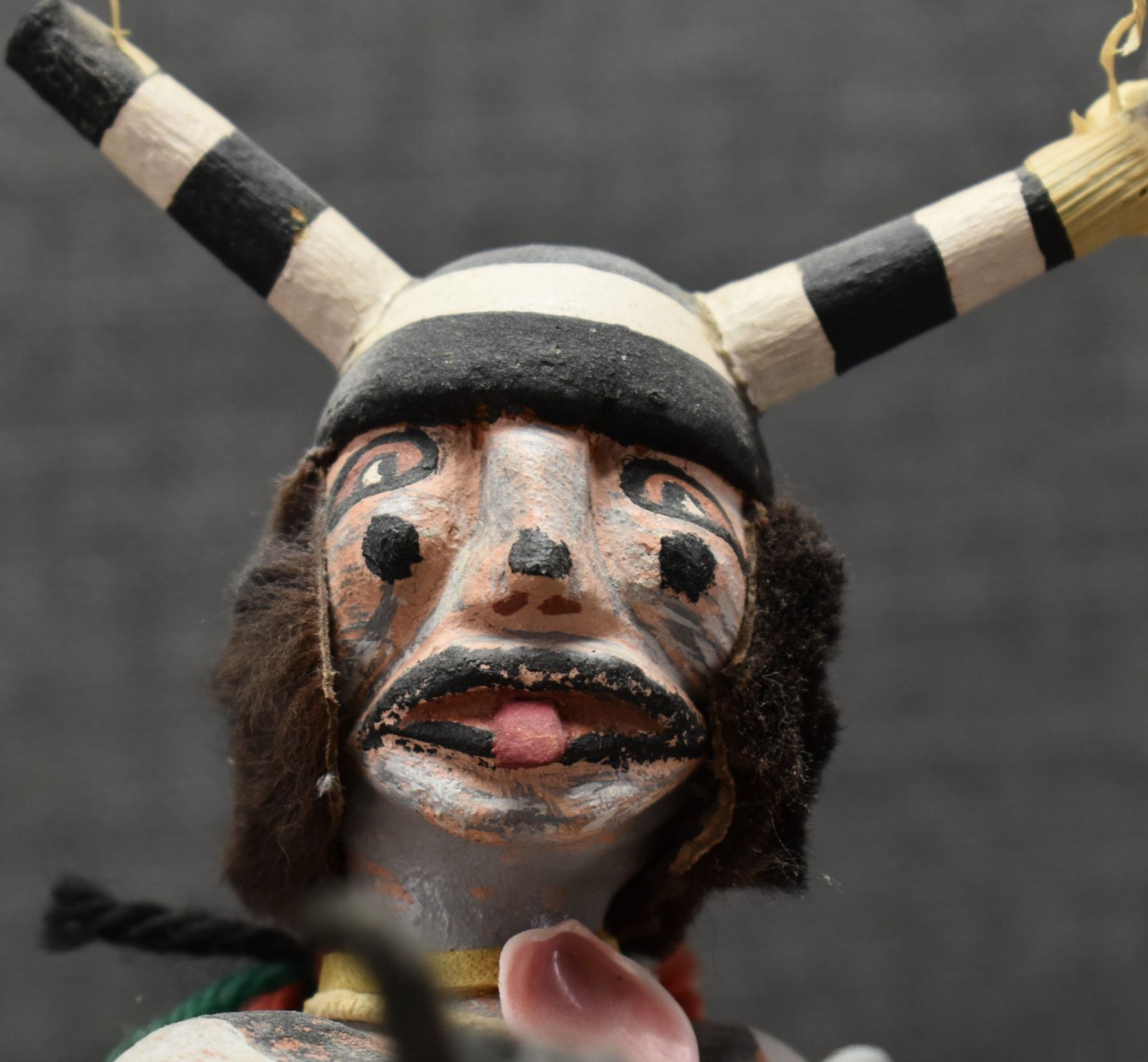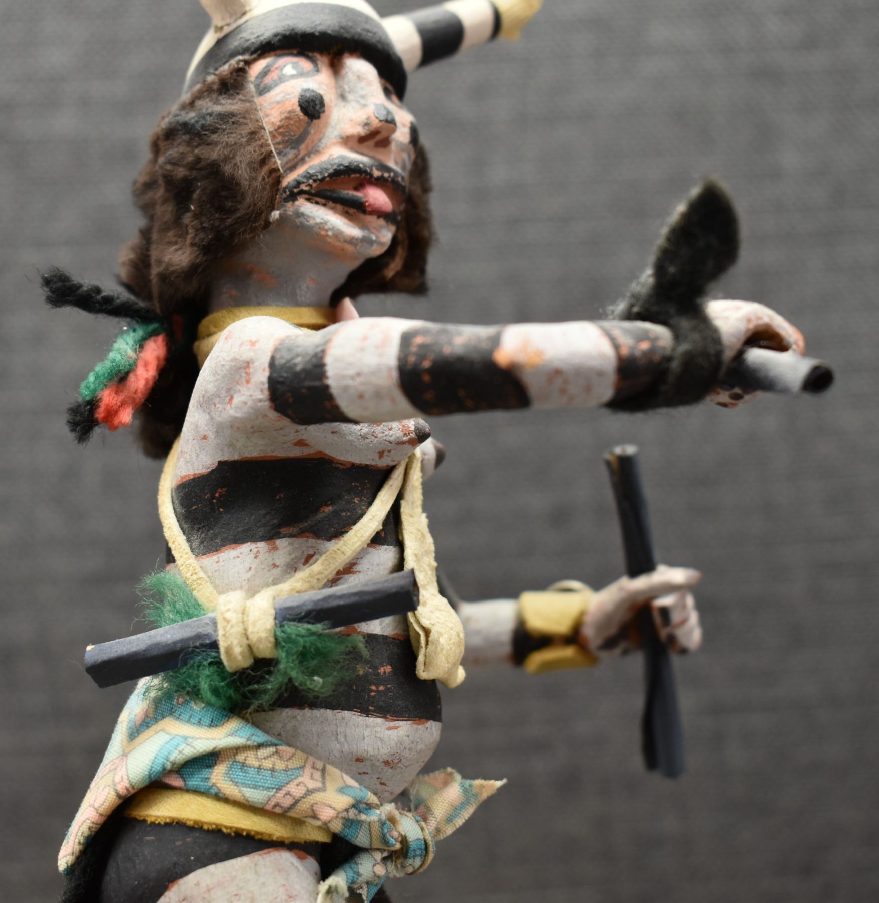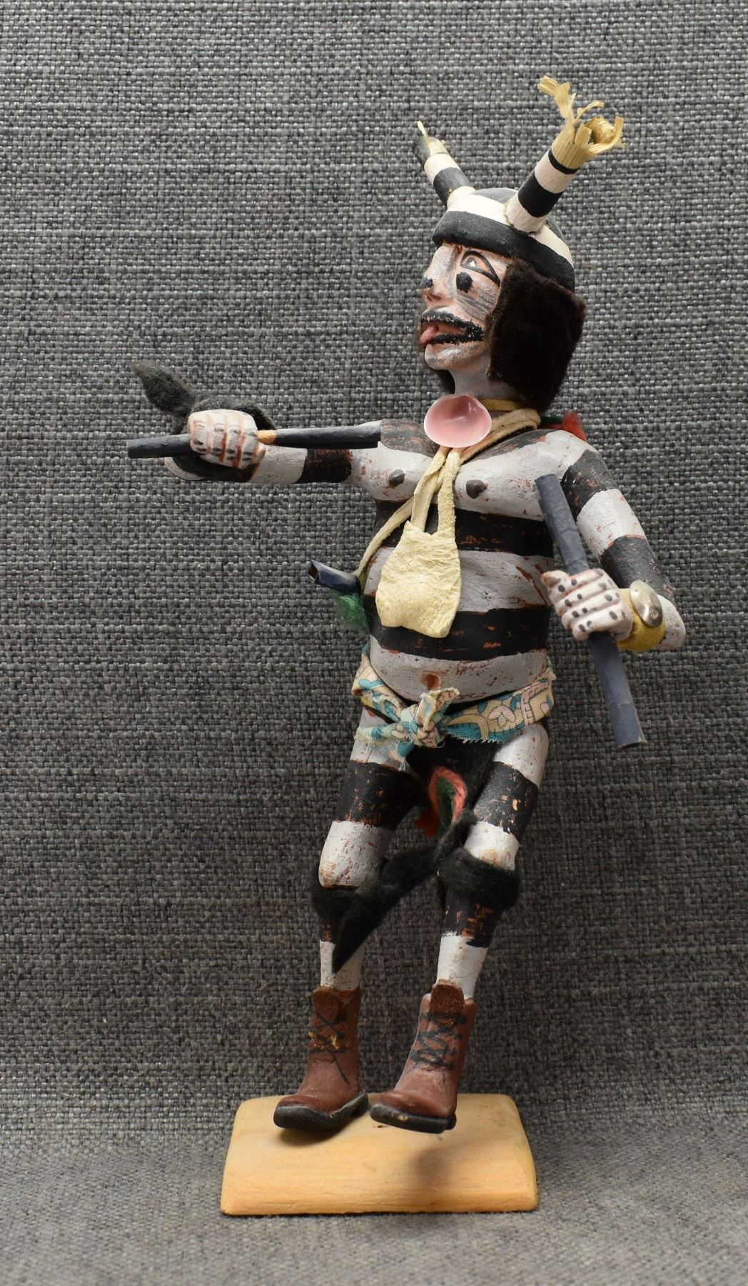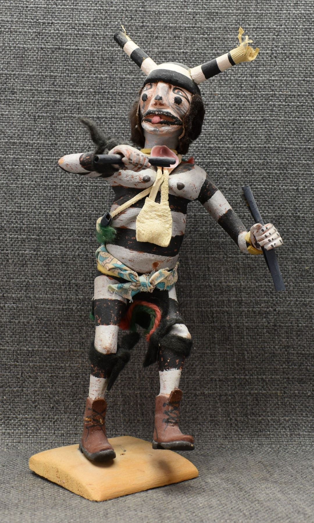 1970's Hopi. Hand carved and painted cotton depicting clown kachina. 10'' tall