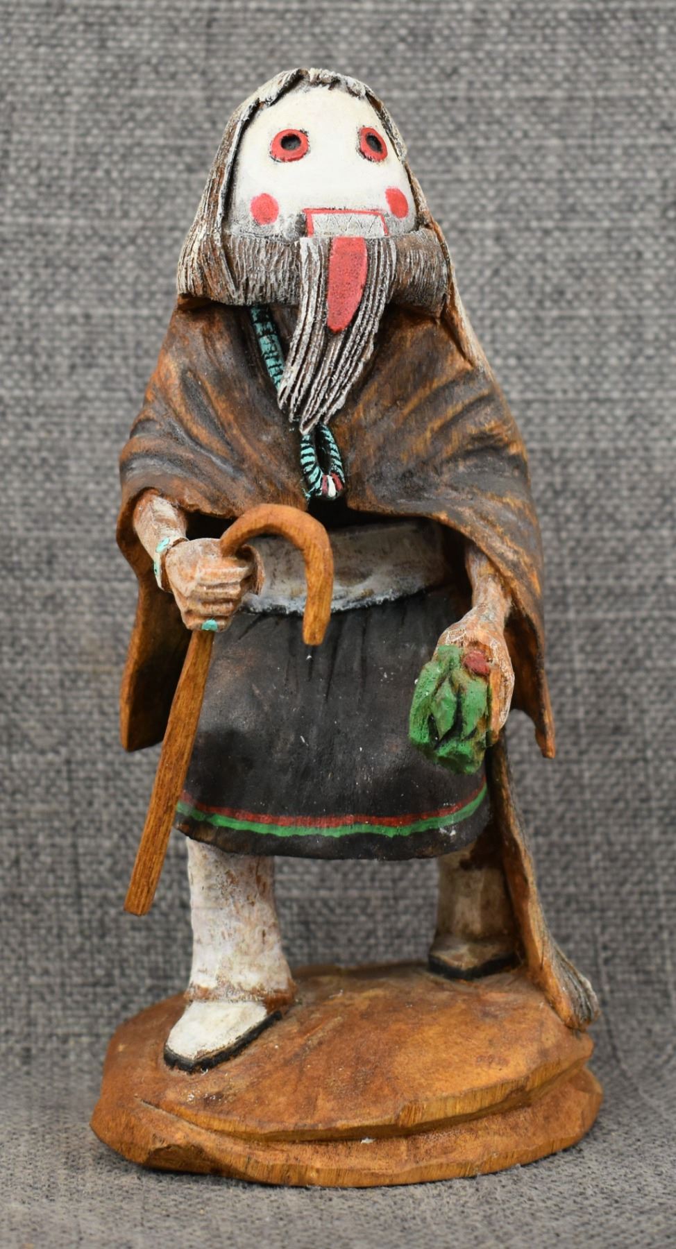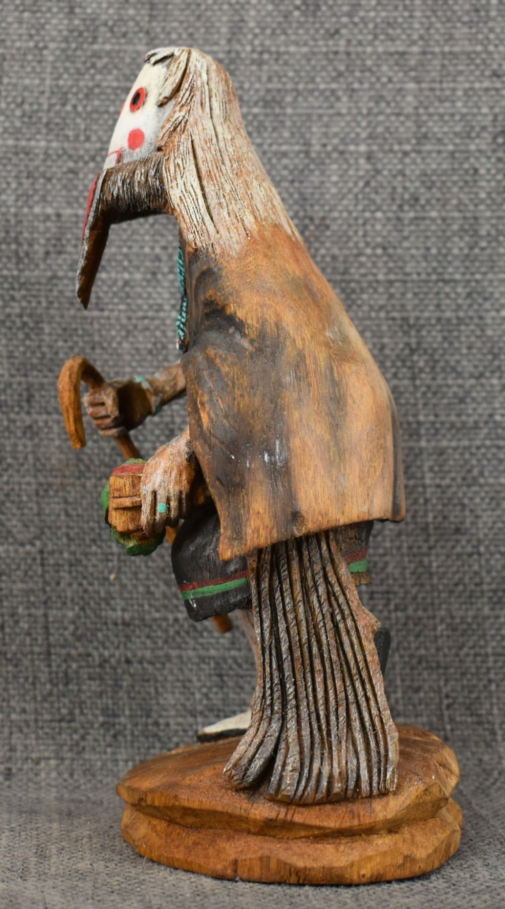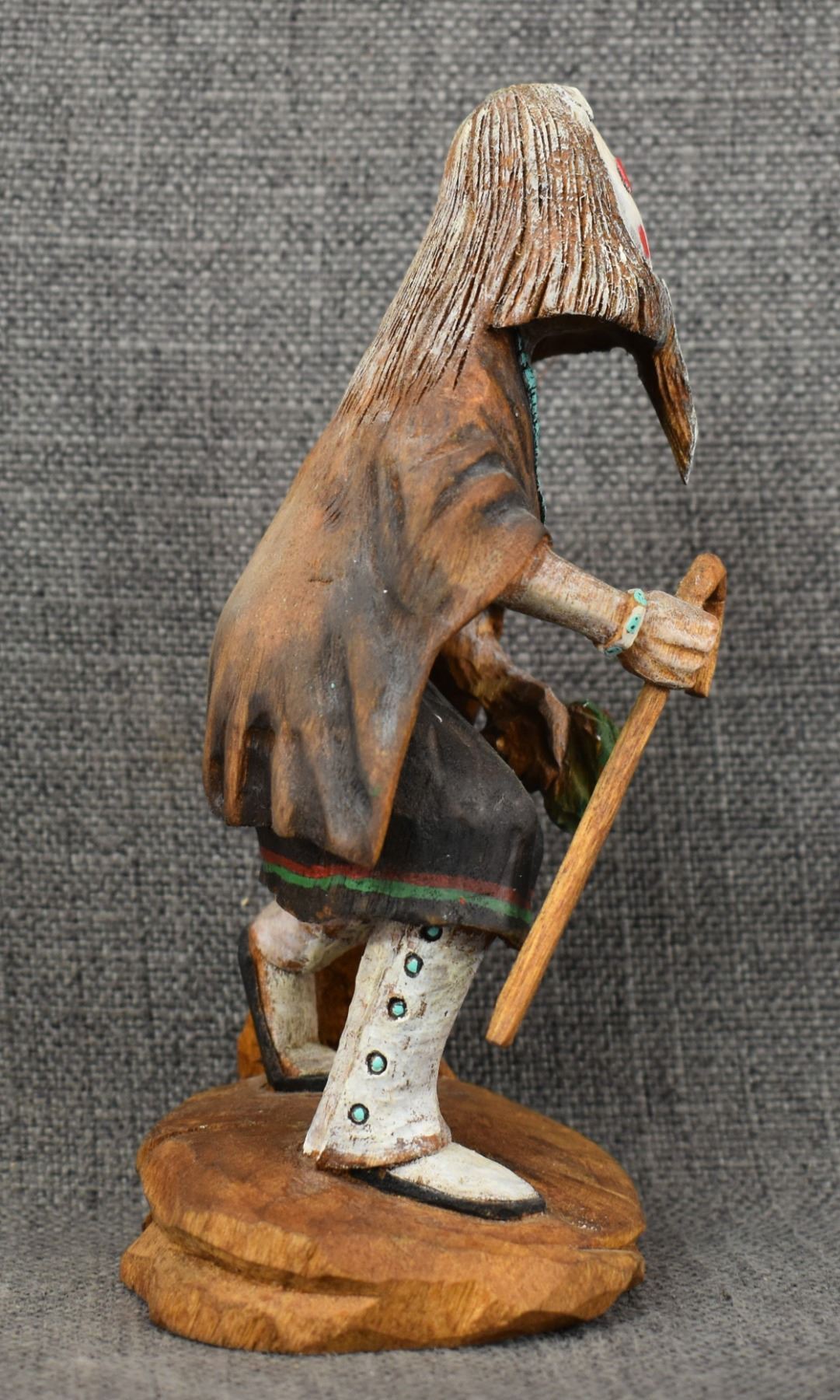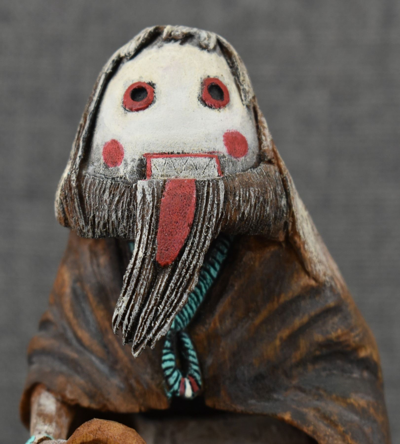 1990's Hopi hand carved and painted cotton wood depicting long haired Kachina signed Carson Chee. 7" tall