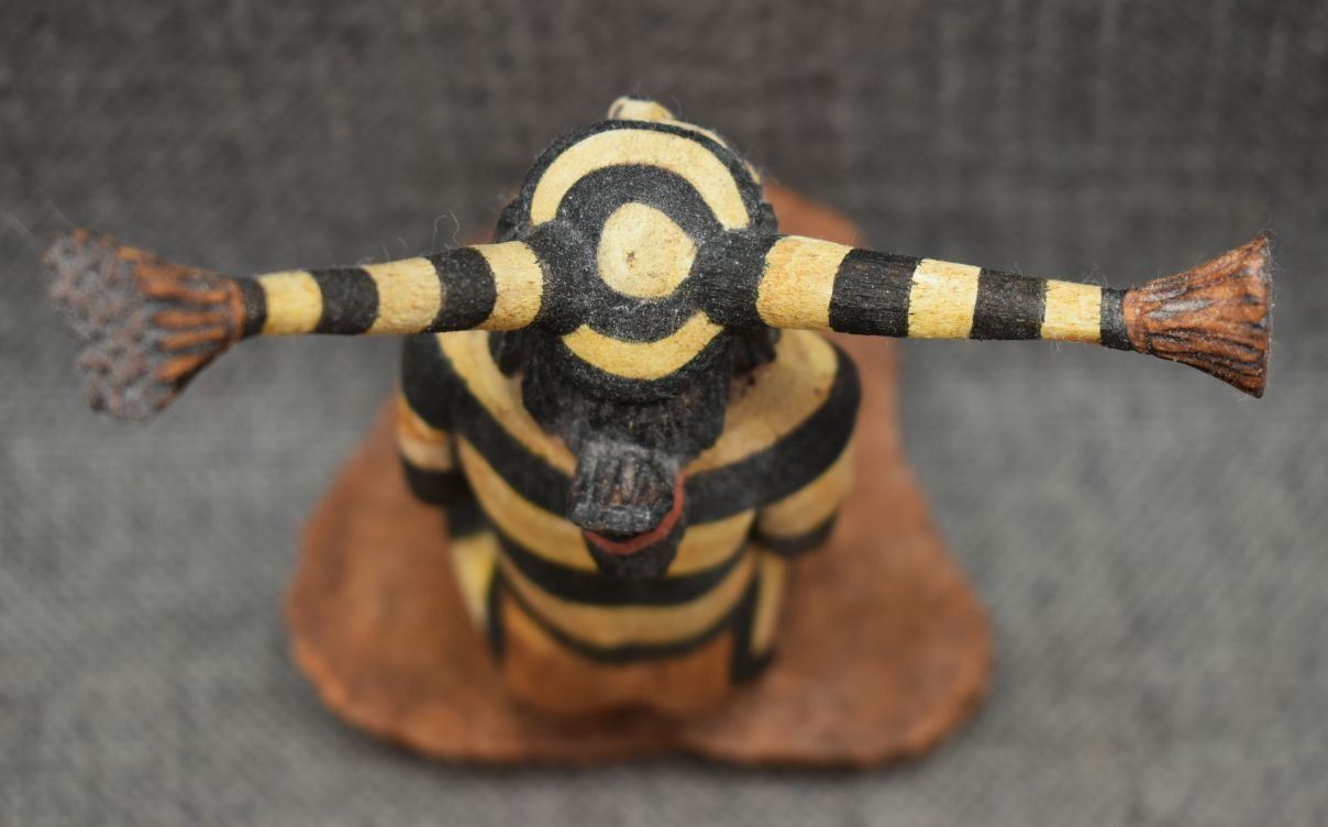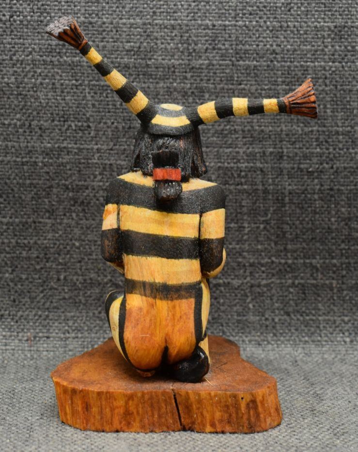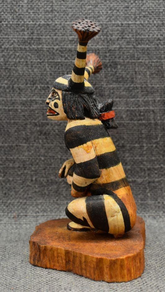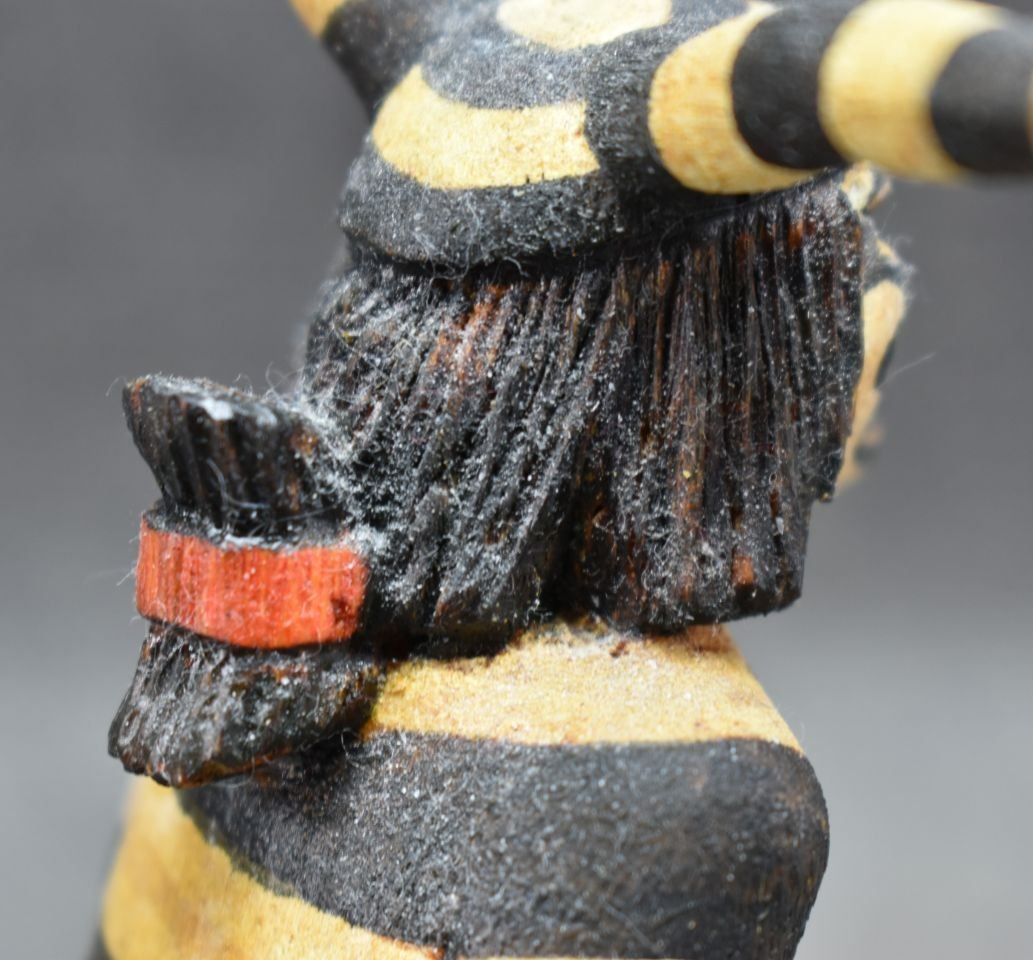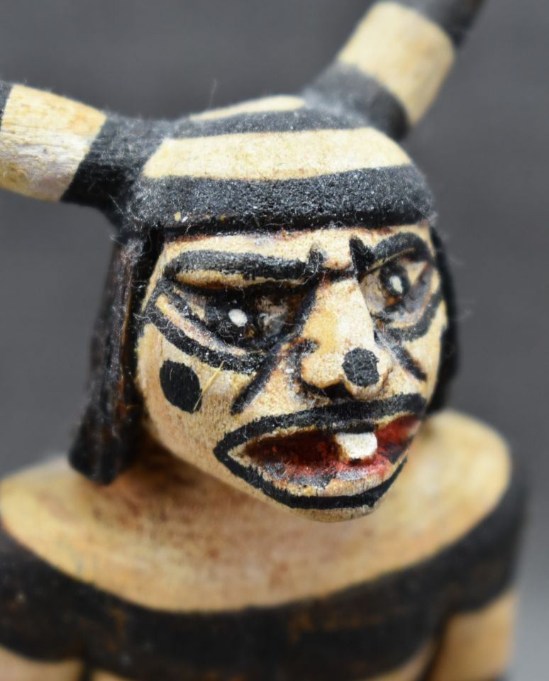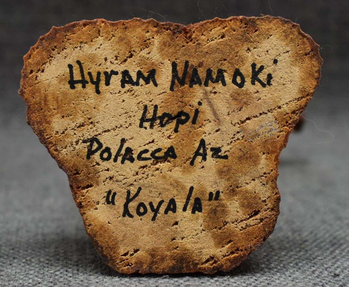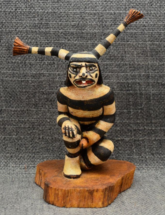 1990's Hopi, hand carved and painted cottonwood kachina depicting koshari signed Hyram Namoki. 5.75" x 4" x 3"
