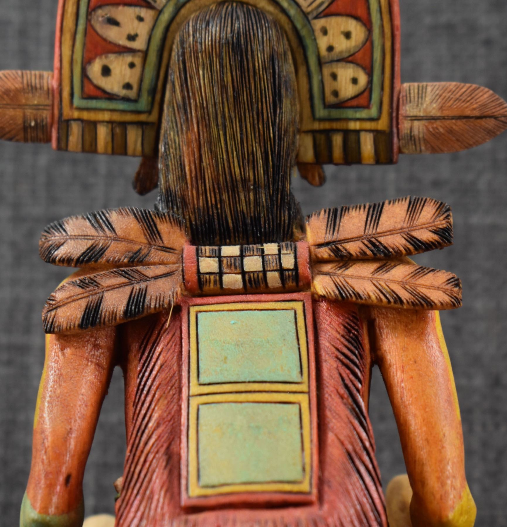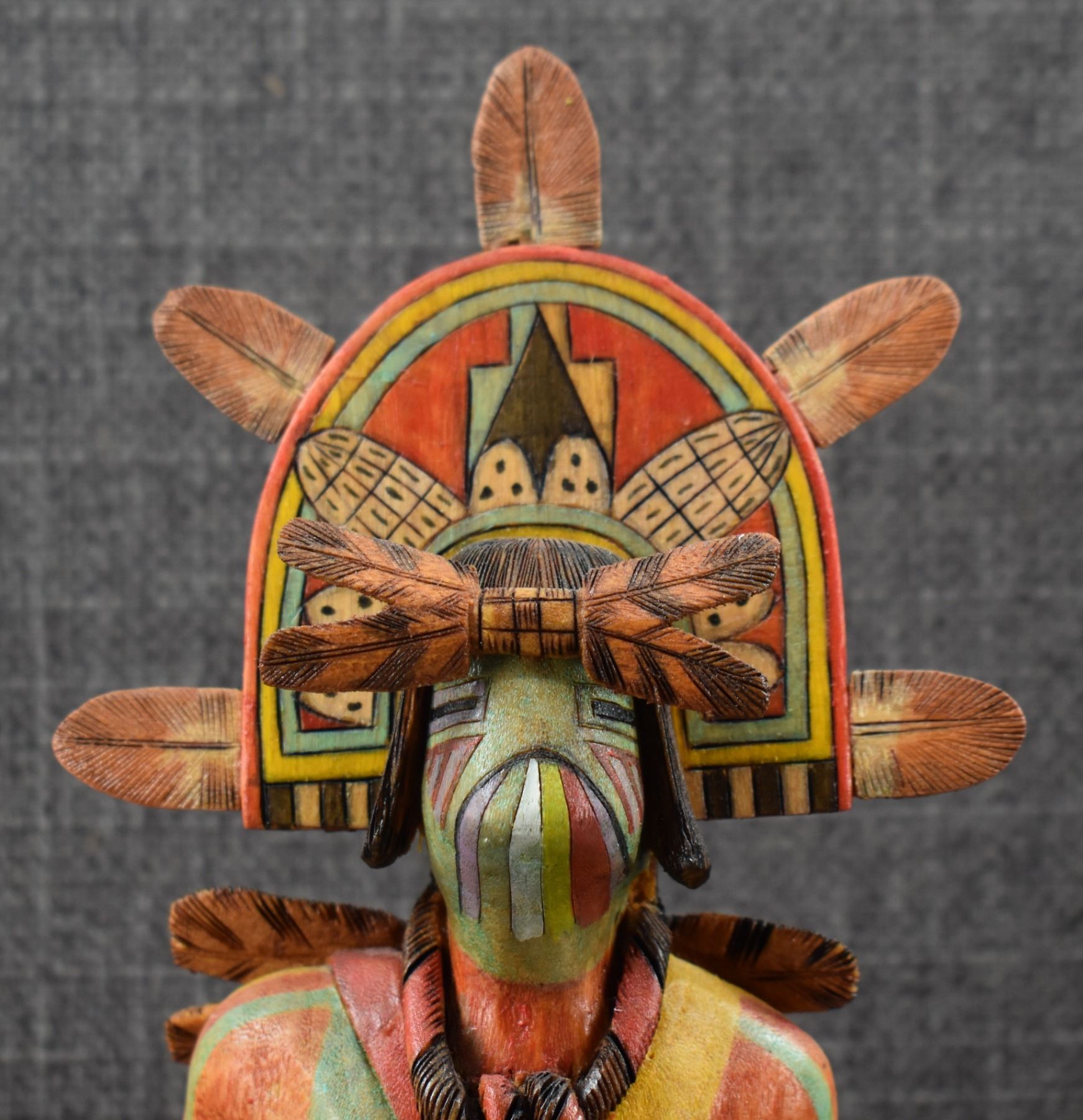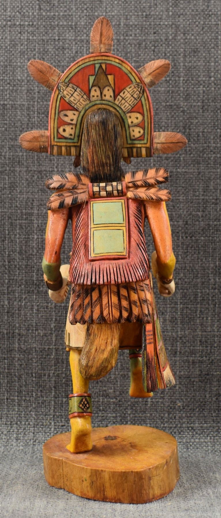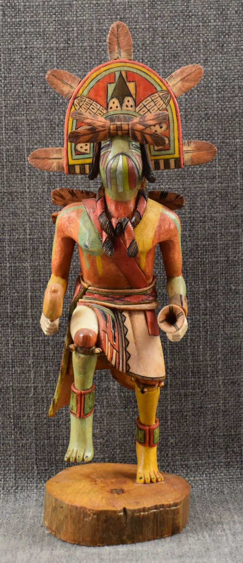1990's Hopi. Hand carved and painted cotton wood kachina. Signed Jeff James. 11'' tall
