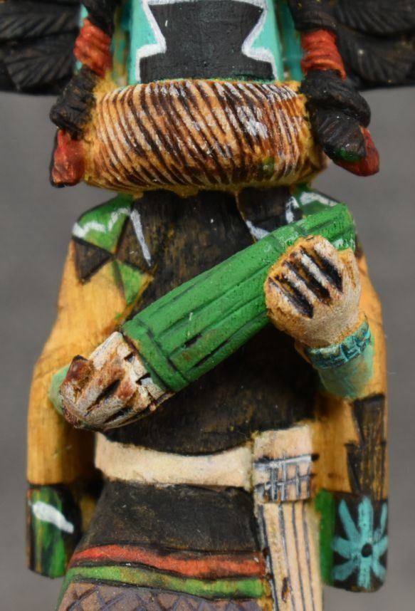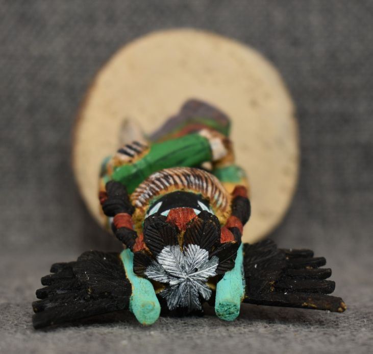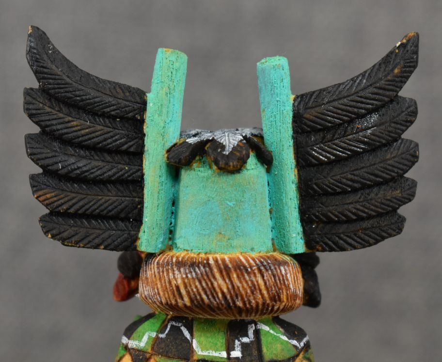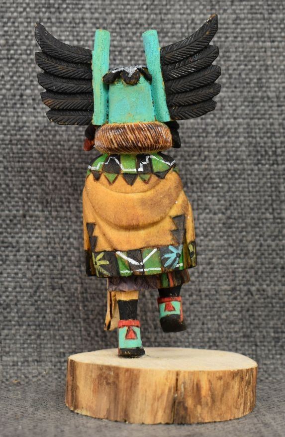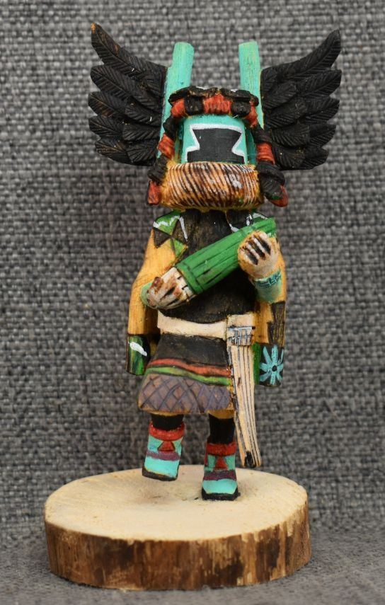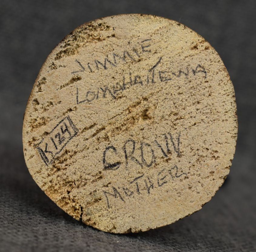 1990's Hopi. Hand carved and painted cotton wood depicting Crow Mother. Signed Jimmie Lomahaitewa. 5'' tall