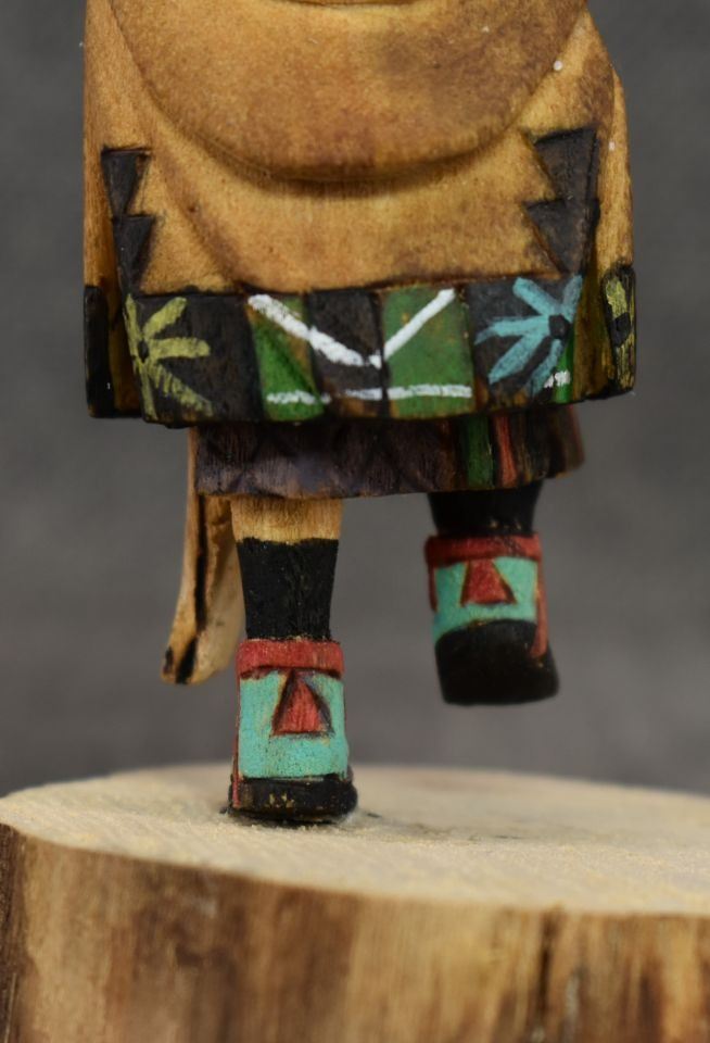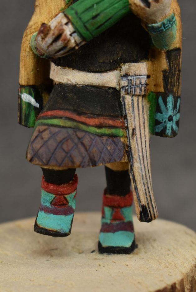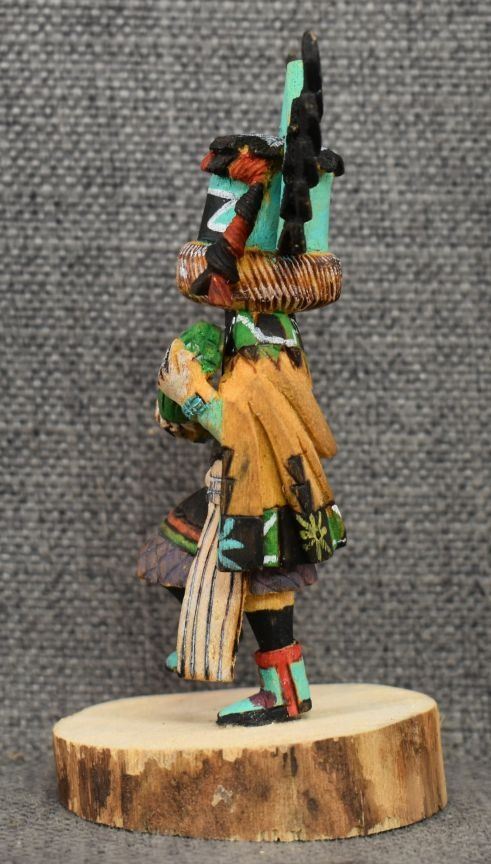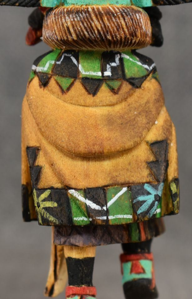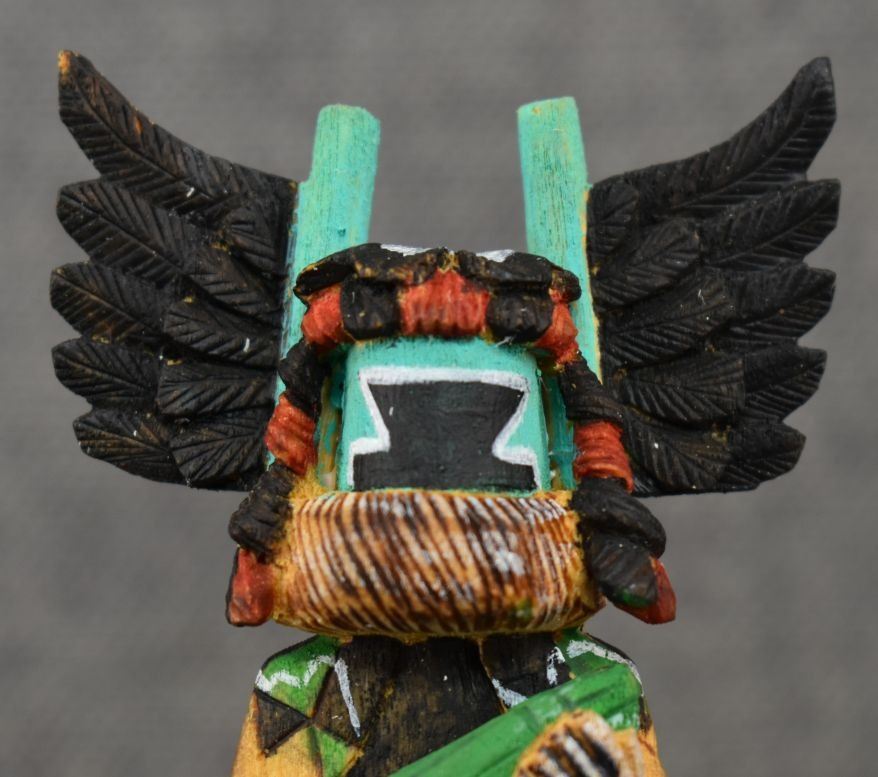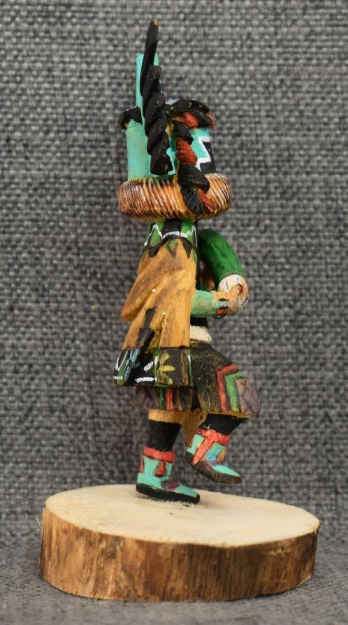 1990's Hopi. Hand carved and painted cotton wood depicting Crow Mother. Signed Jimmie Lomahaitewa. 5'' tall
