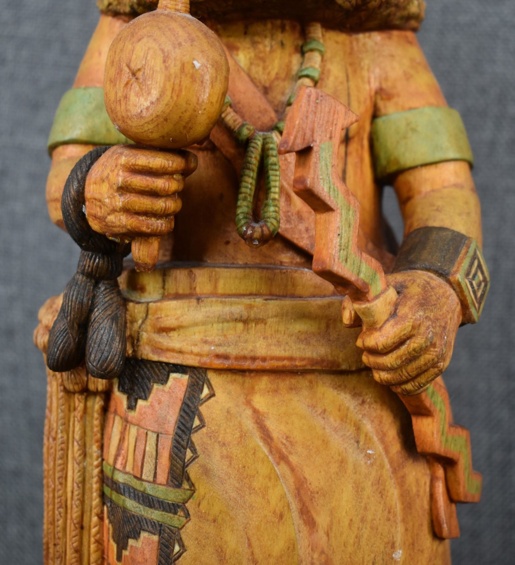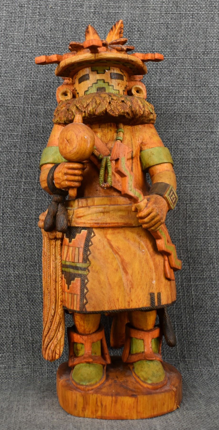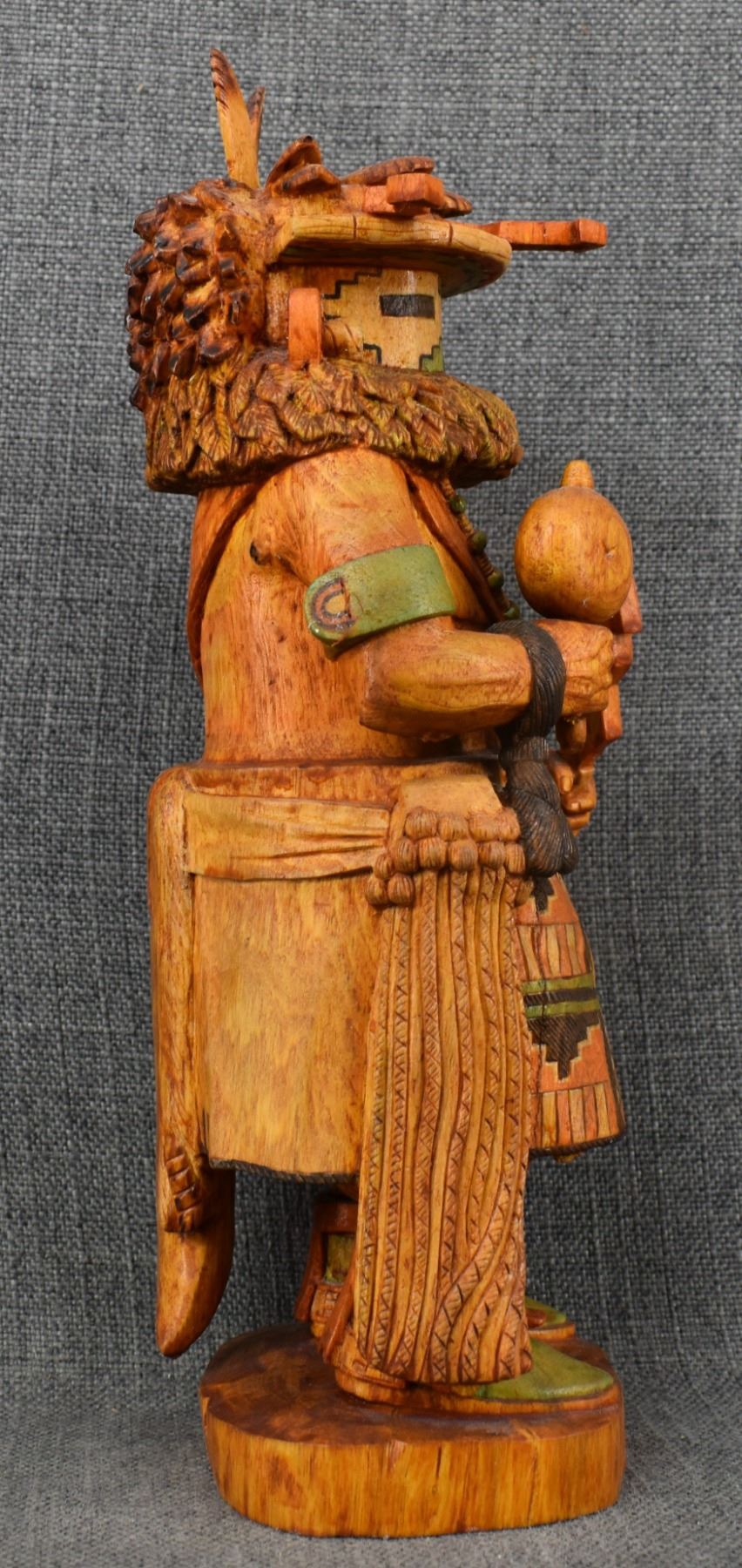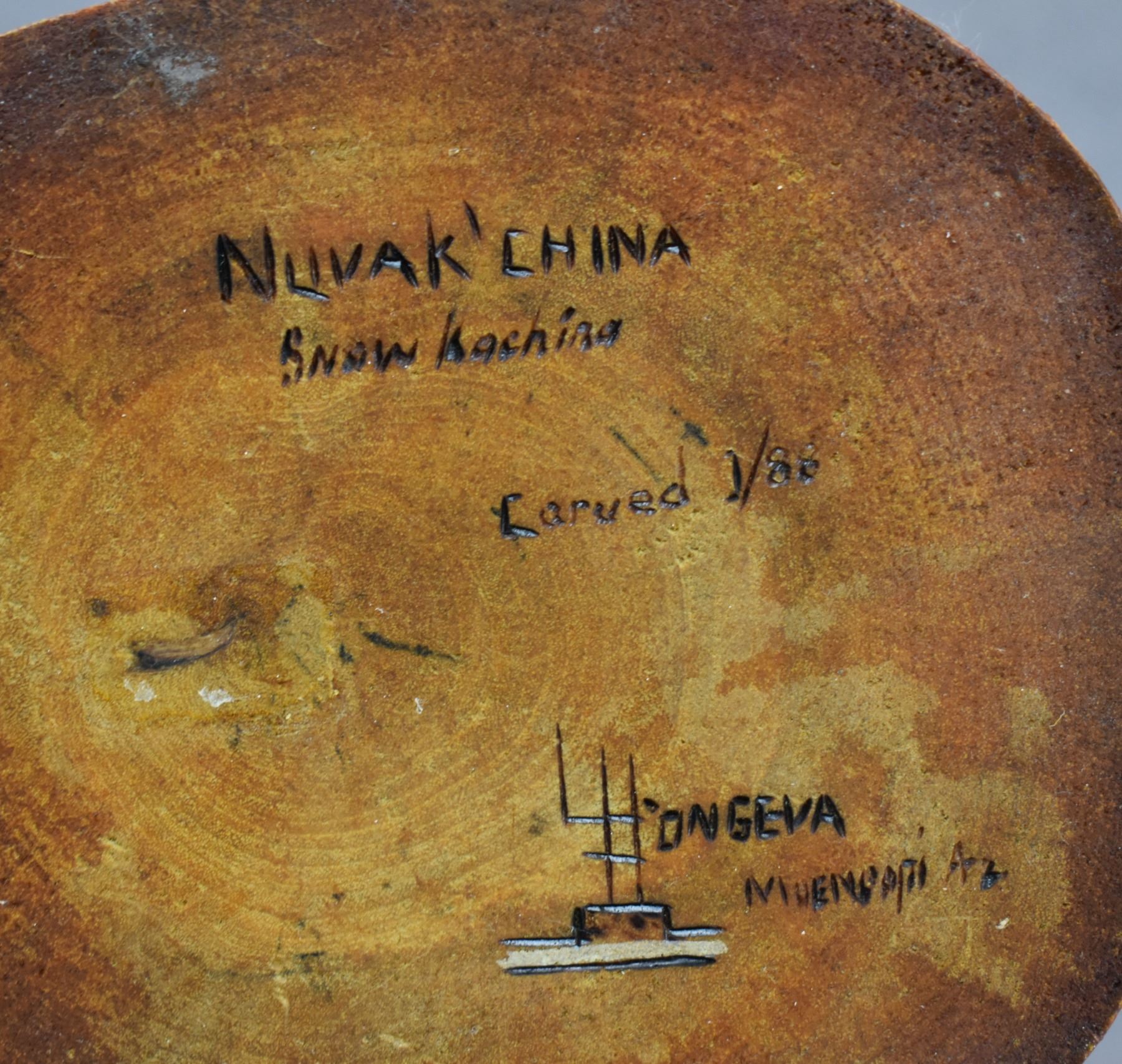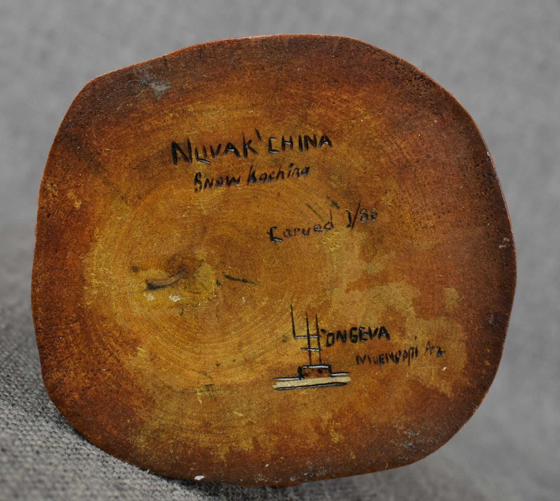 1988 Hopi. Hand carved and painted cotton wood depicting Snow Kachina, signed L. Hongeva. 13'' tall