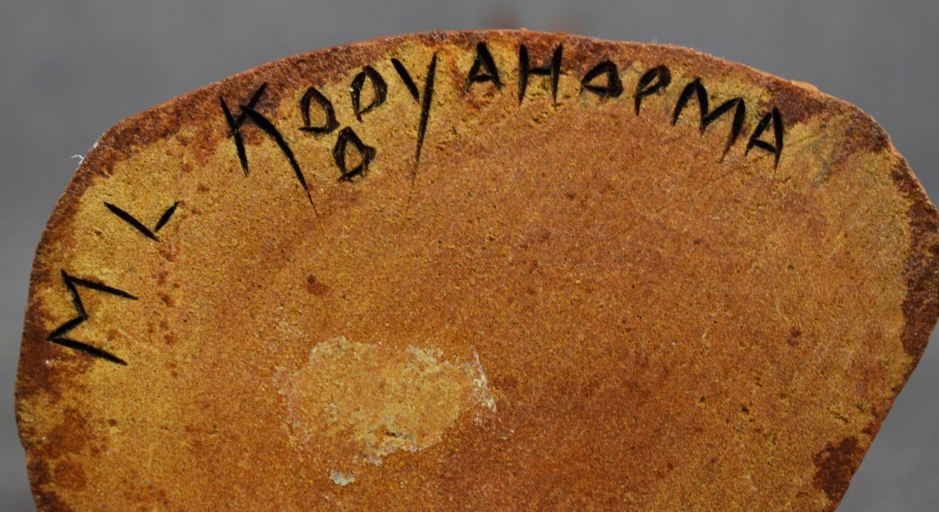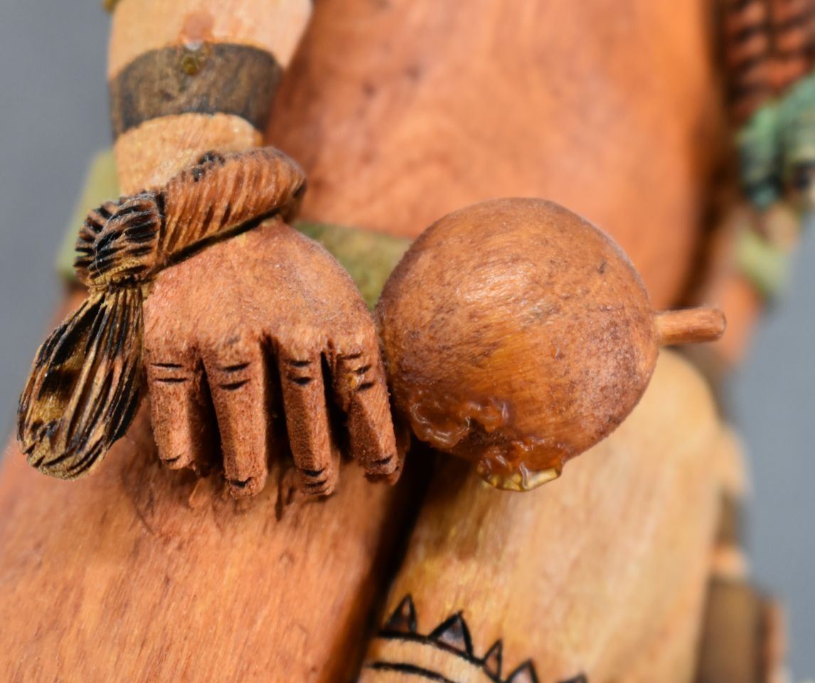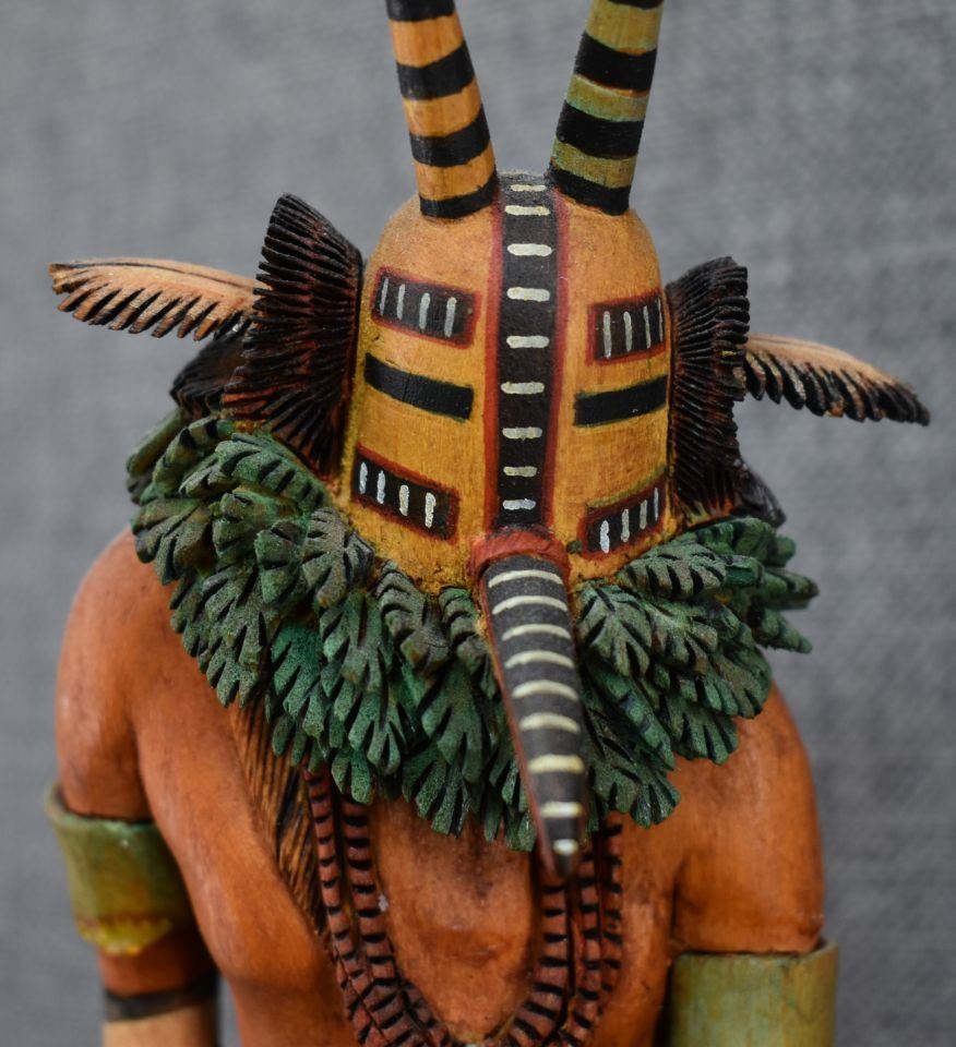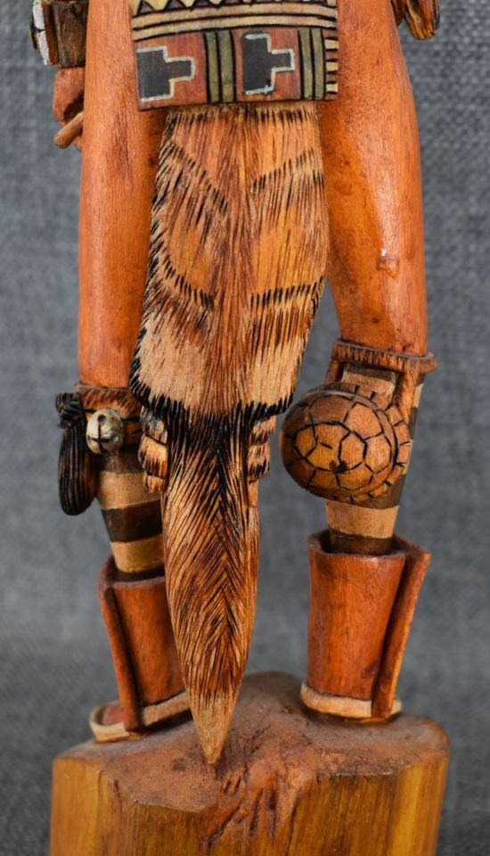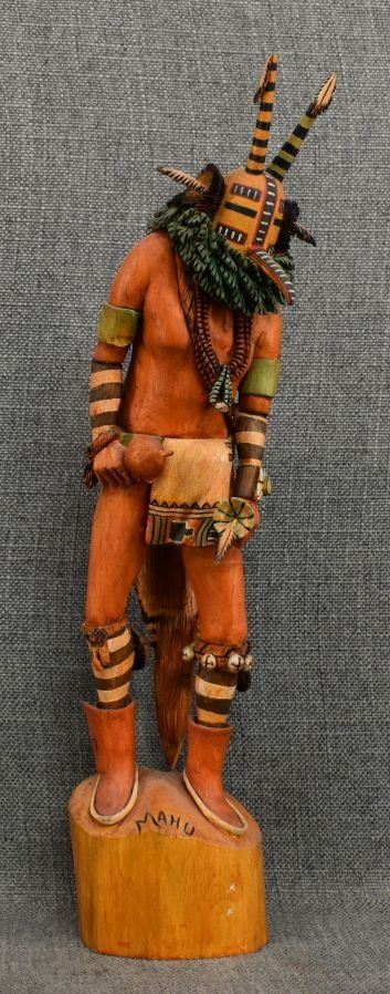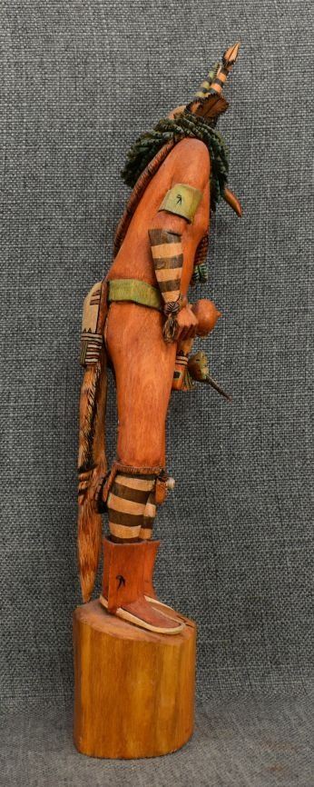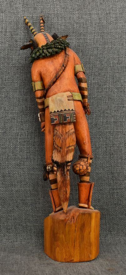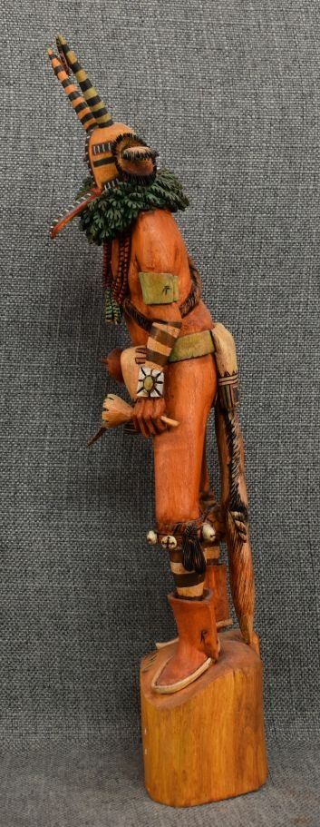1990's Hopi. Hand carved and painted cotton wood kachina. Signed M.L. Kooyahopma. 15'' tall