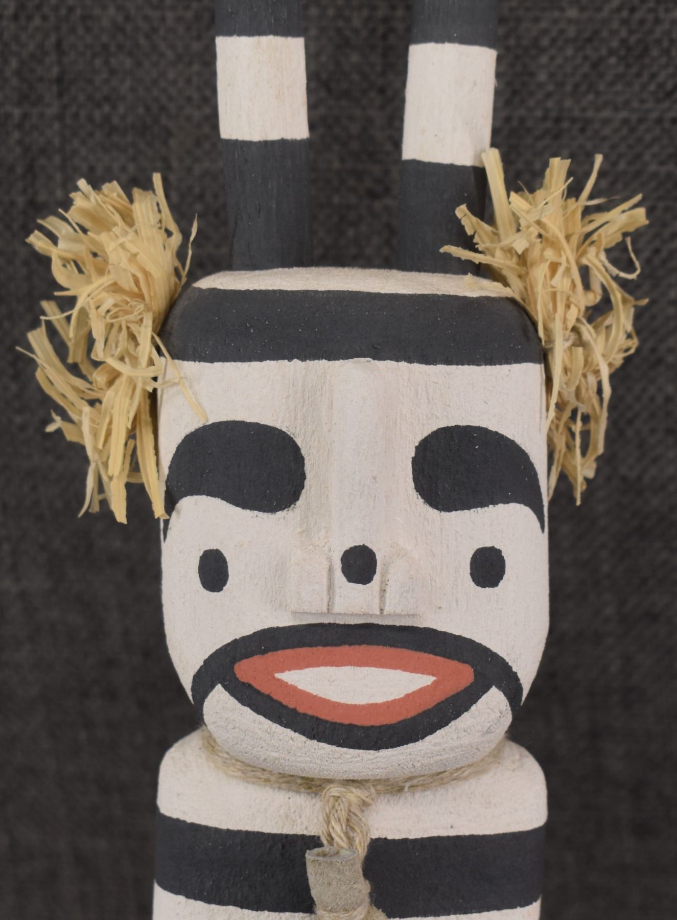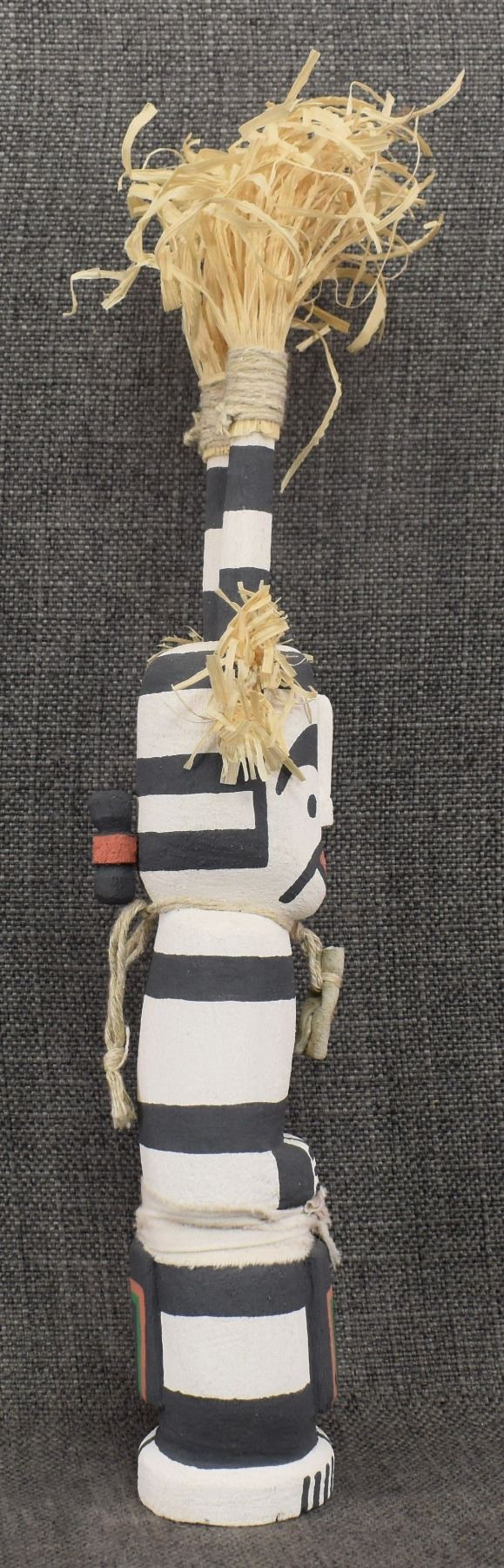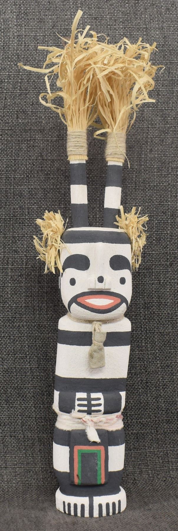 1990's Hopi, carved and painted cottonwood Koshari kachina signed with butterfly hallmark for Manuel Denet Chavarria 15" tall